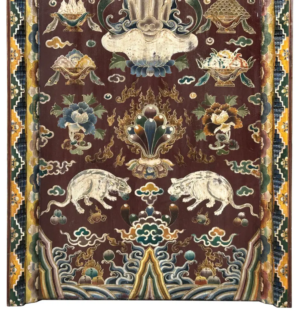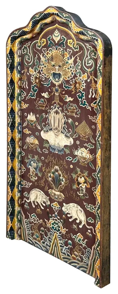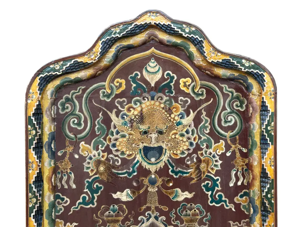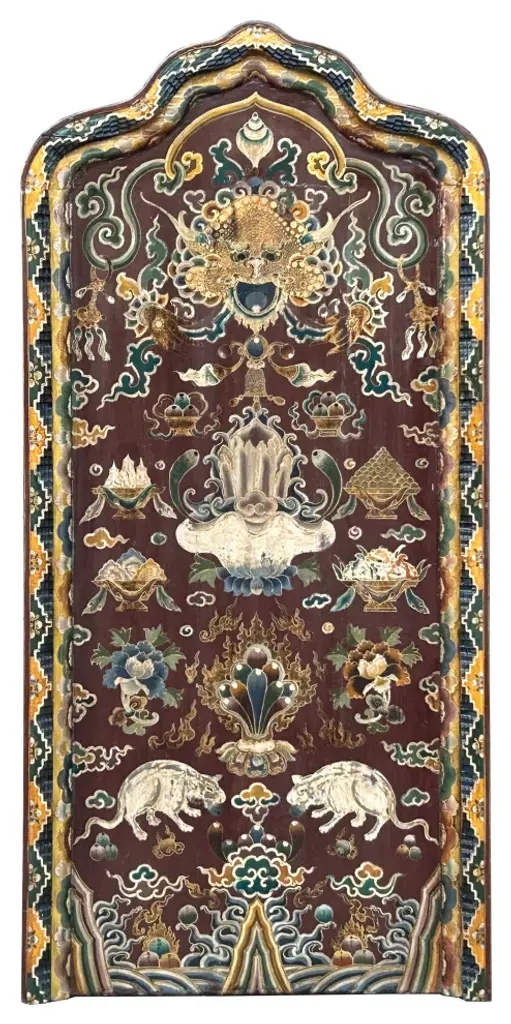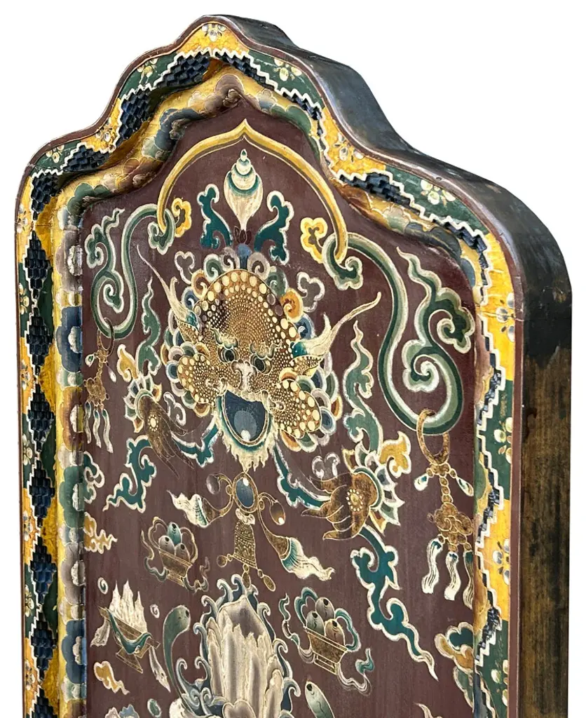 This intricately hand-painted Tibetan Shrine Panel is a captivating work of art. The rich colors, intricate patterns, and symbolic imagery evoke a sense of spiritual reverence. The panel features a central lotus flower motif, representing purity and enlightenment, surrounded by auspicious symbols and protective deities. This unique piece would make a stunning addition to any home decor, adding a touch of cultural significance and spiritual energy to your space. Whether displayed as a focal point or integrated into a meditation corner, this Tibetan Shrine Panel is sure to inspire and uplift.Dimensions: w29.5" x thickness 3" x h61"Origin: ChinaMaterial: Elm WoodCondition: Vintage handmade, unique not perfect, rustic finish, minor color offWe offer a flat shipping fee of $325 for customers in the contiguous United States (48 states) for convenient curbside delivery. (Additional shipping costs will apply to customers in New York, Hawaii, Alaska, US Islands, Florida Keywest, or Canada, based on their specific location). The shipping cost includes insurance and handling charges for added protection.For customers in San Francisco or the Bay Area, we provide local delivery at a cost determined by the distance. You can find the exact cost by entering your zip code during checkout. Alternatively, you can pick up your order in-store with no extra shipping fee.If you need extra care and a white-glove experience, we offer a specialized service with a 4-8 week transit time, tailored to your destination. Contact us for a detailed quote on this service.Upon receiving your shipment, please carefully inspect the exterior packaging while the delivery personnel are present. Note any visible damage on the delivery paperwork, as carriers do not typically honor concealed damage claims. Your cooperation in documenting any visible damage is greatly appreciated