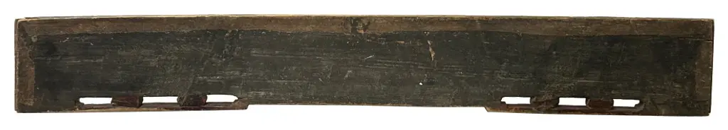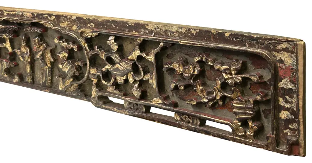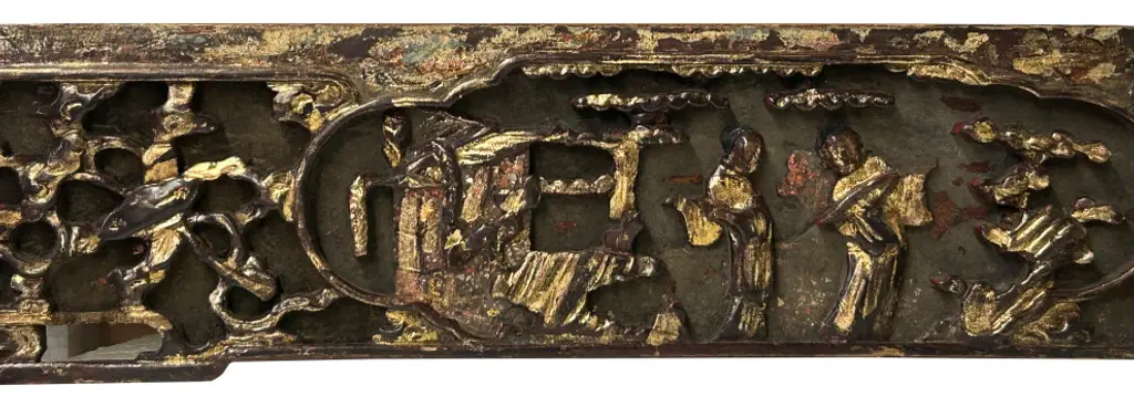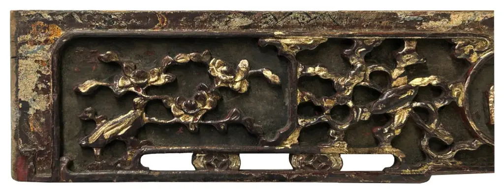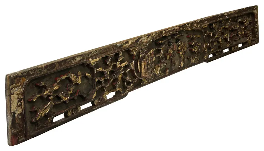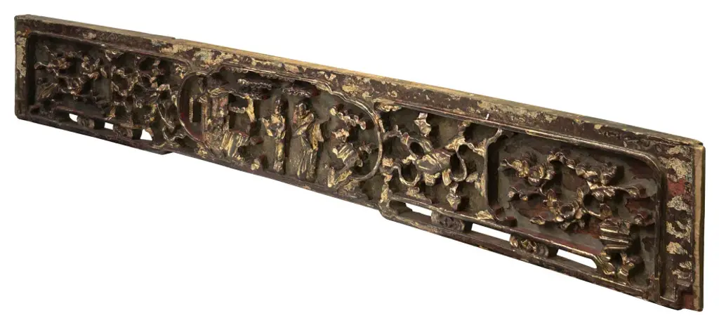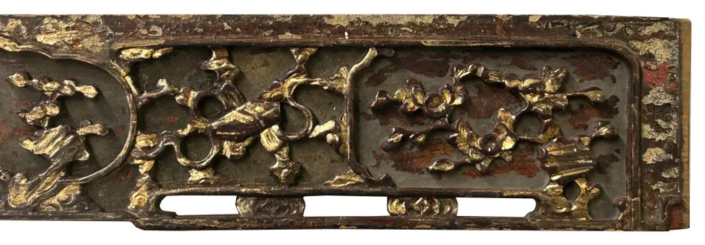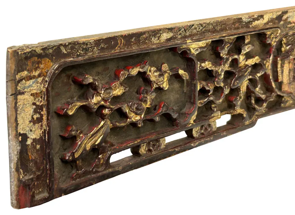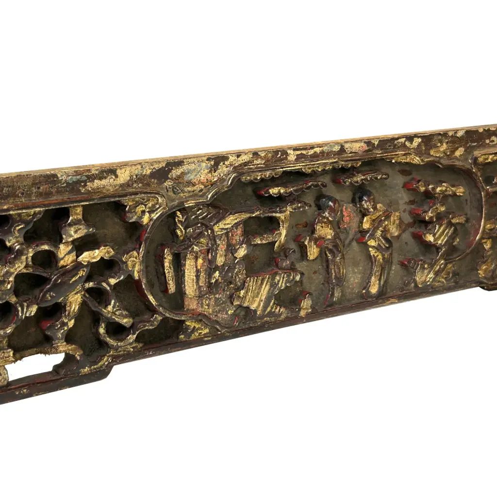 This is a restored vintage wood wall panel with an ancient Chinese carving motif and design. It was a small part of a vintage furniture. The matte golden touch up is painted on the motif with oriental brown base color.Dimensions: w33.25" x h4.25" thickness 0.75"Origin: ChinaMaterial: WoodCondition: Vintage restored, rustic marks, wood crack line