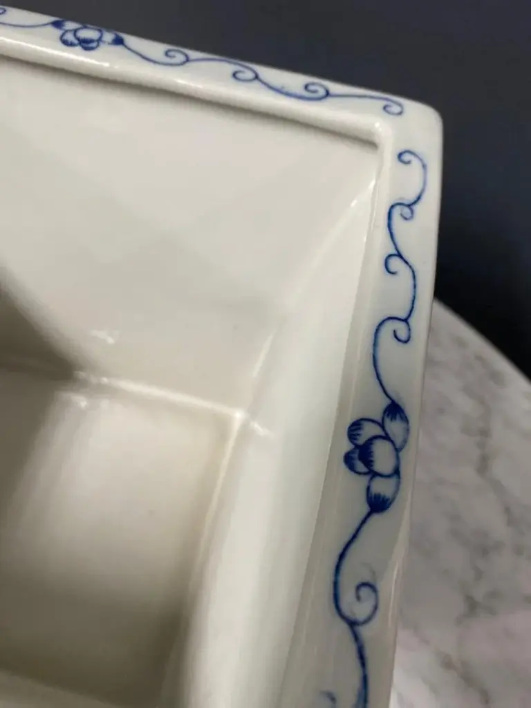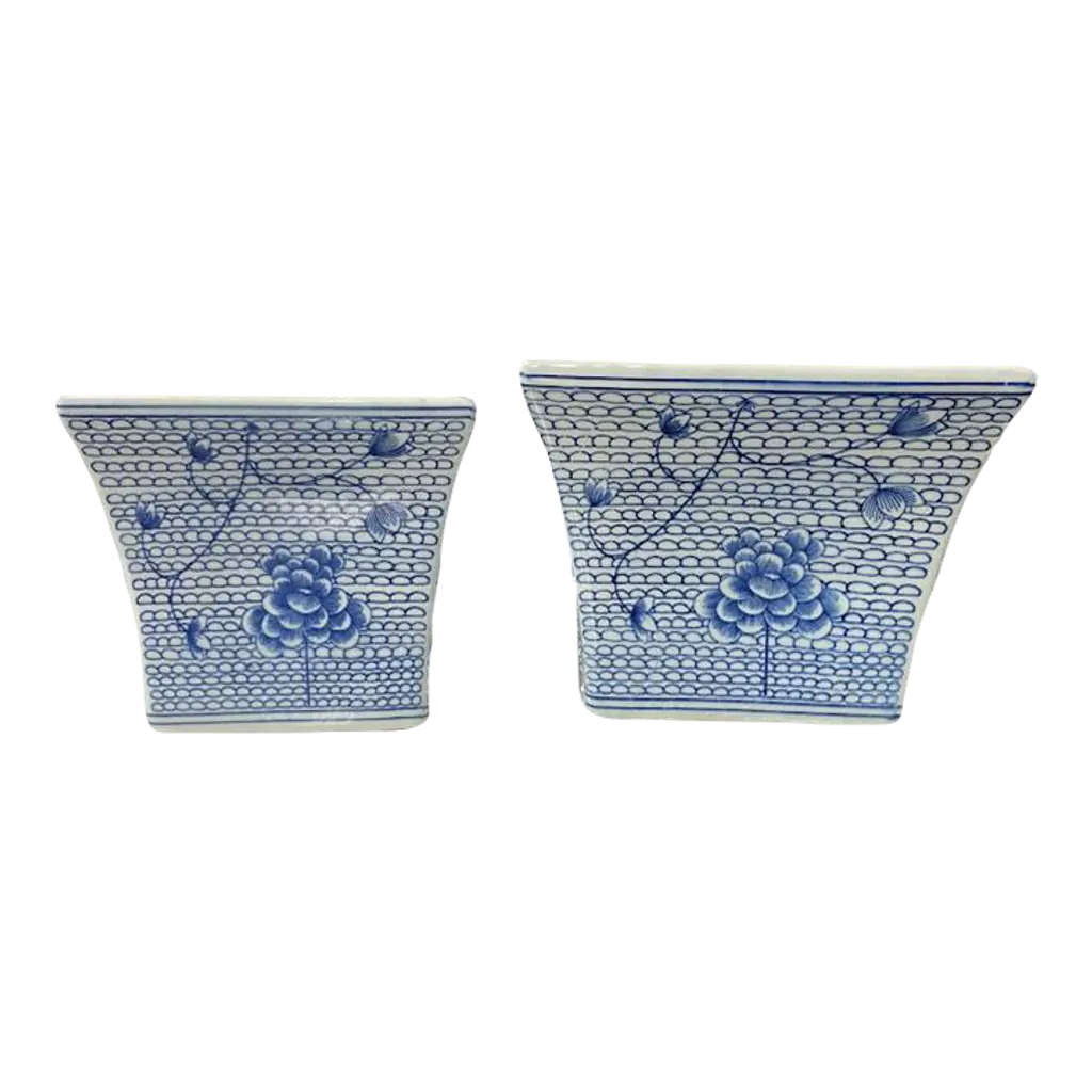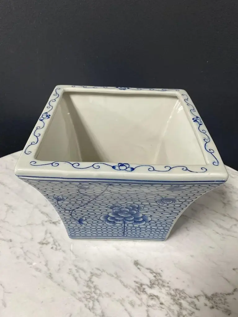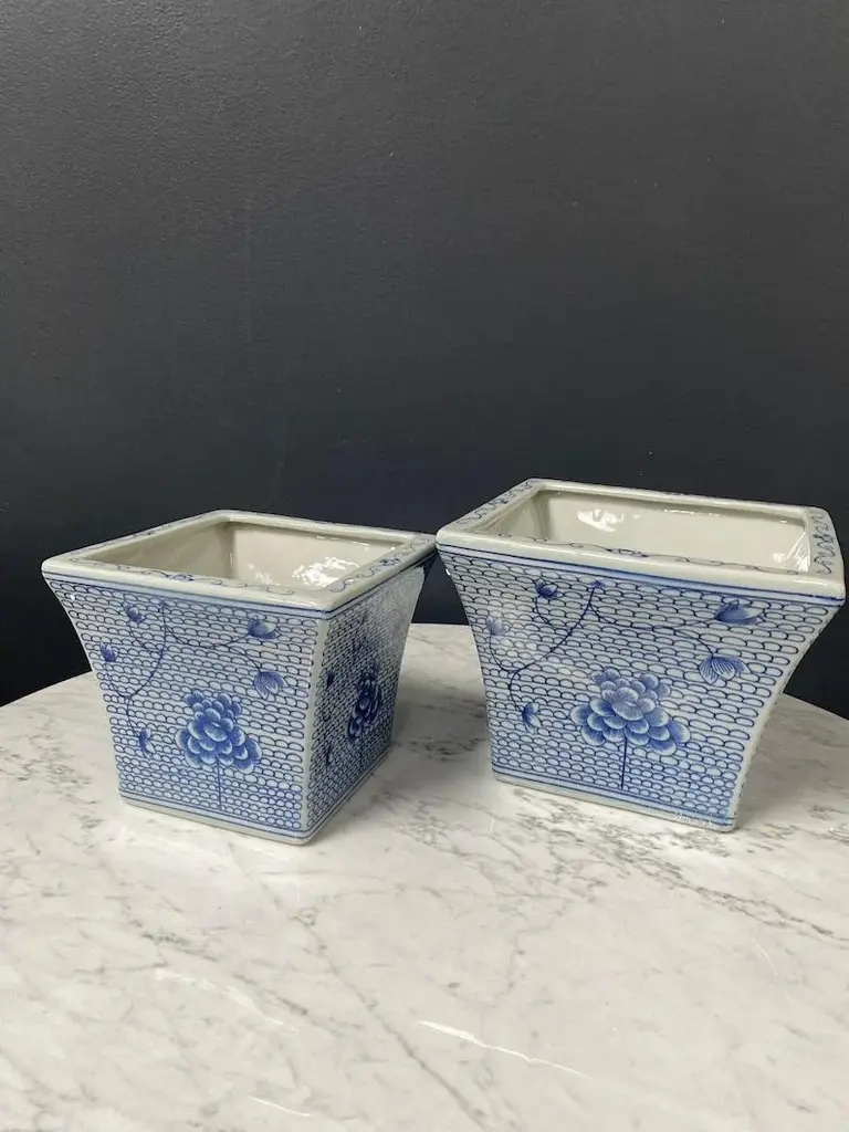 Beautiful blue and white square Asian planter set has a delicate floral design. These do not have drainage holes. Small is 6 1/4" across at the top, 5 1/4" high, 4 3/8" diameter on the bottom Large is 8" across at the top, 6" high, 5 3/8" on the bottom