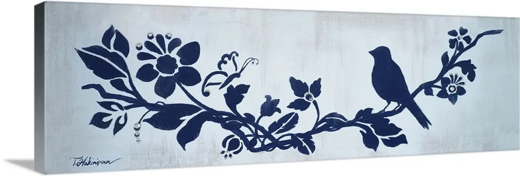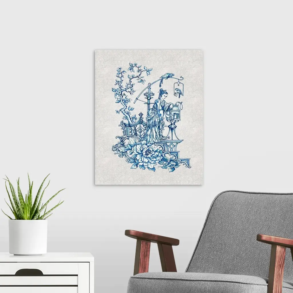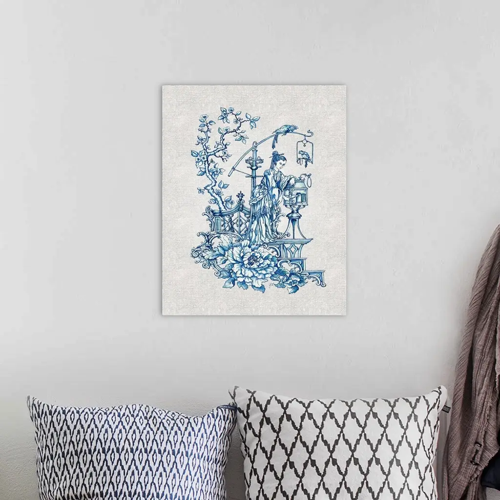 Chinoiserie featuring a mother and child in blue over a linen background.