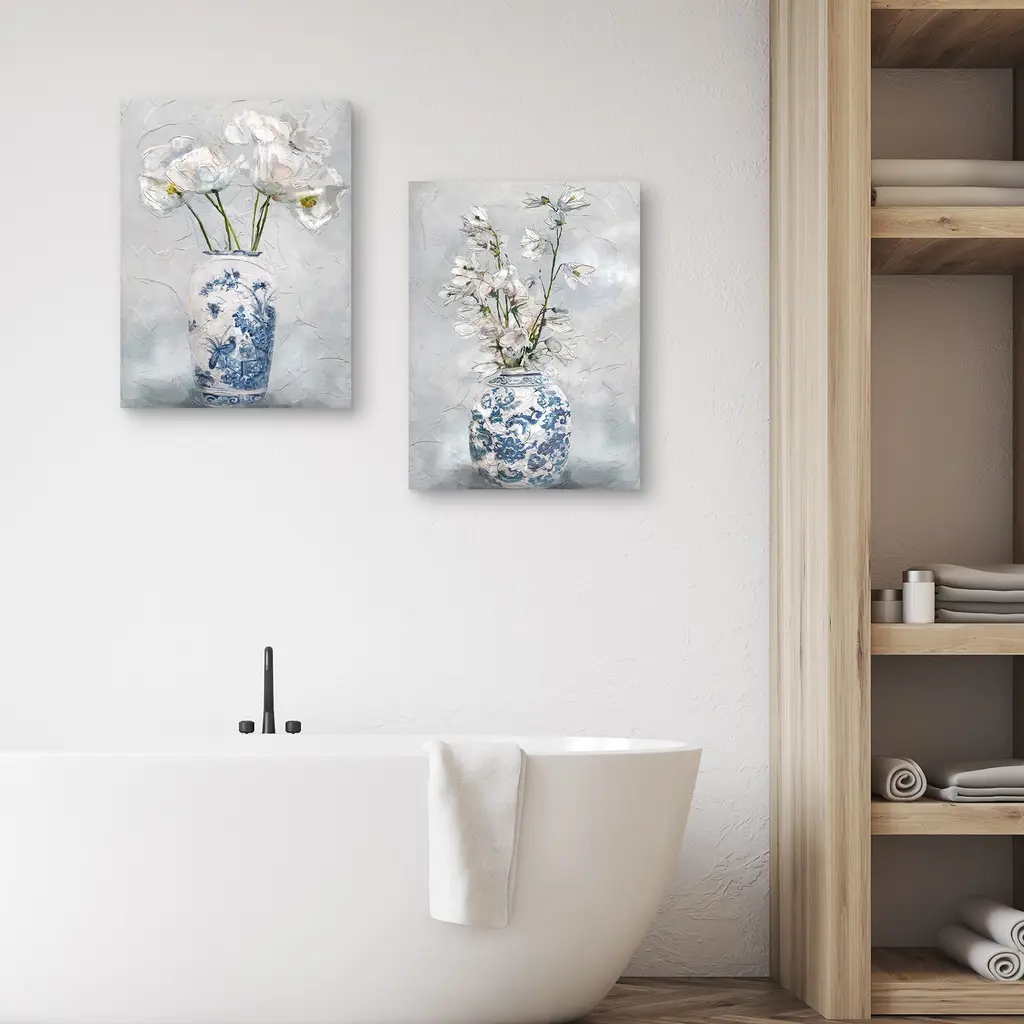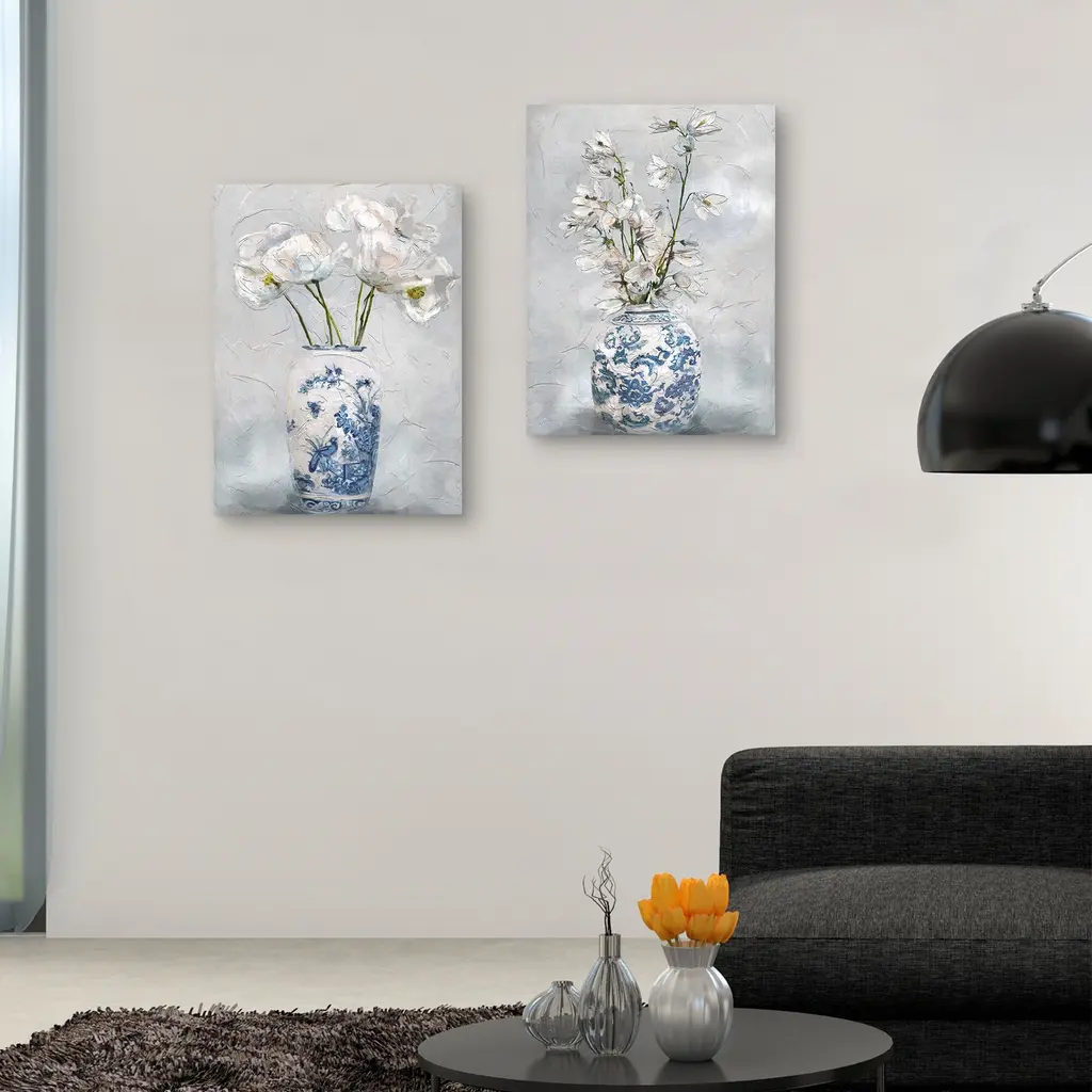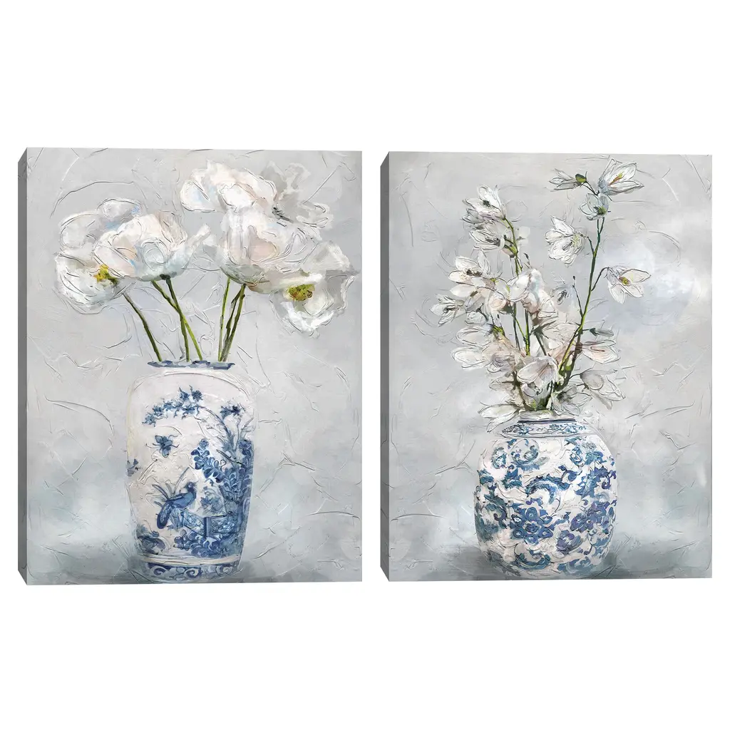 The word chinoiserie refers to pieces of art and furniture designed or painted in Chinese stylings and patterns. Studio Arts Chinoiserie I & II are textured canvas art prints displaying vases with Chinese imagery and brilliant white flowers. These pieces can genuinely fit in nicely with any styling of home decor.