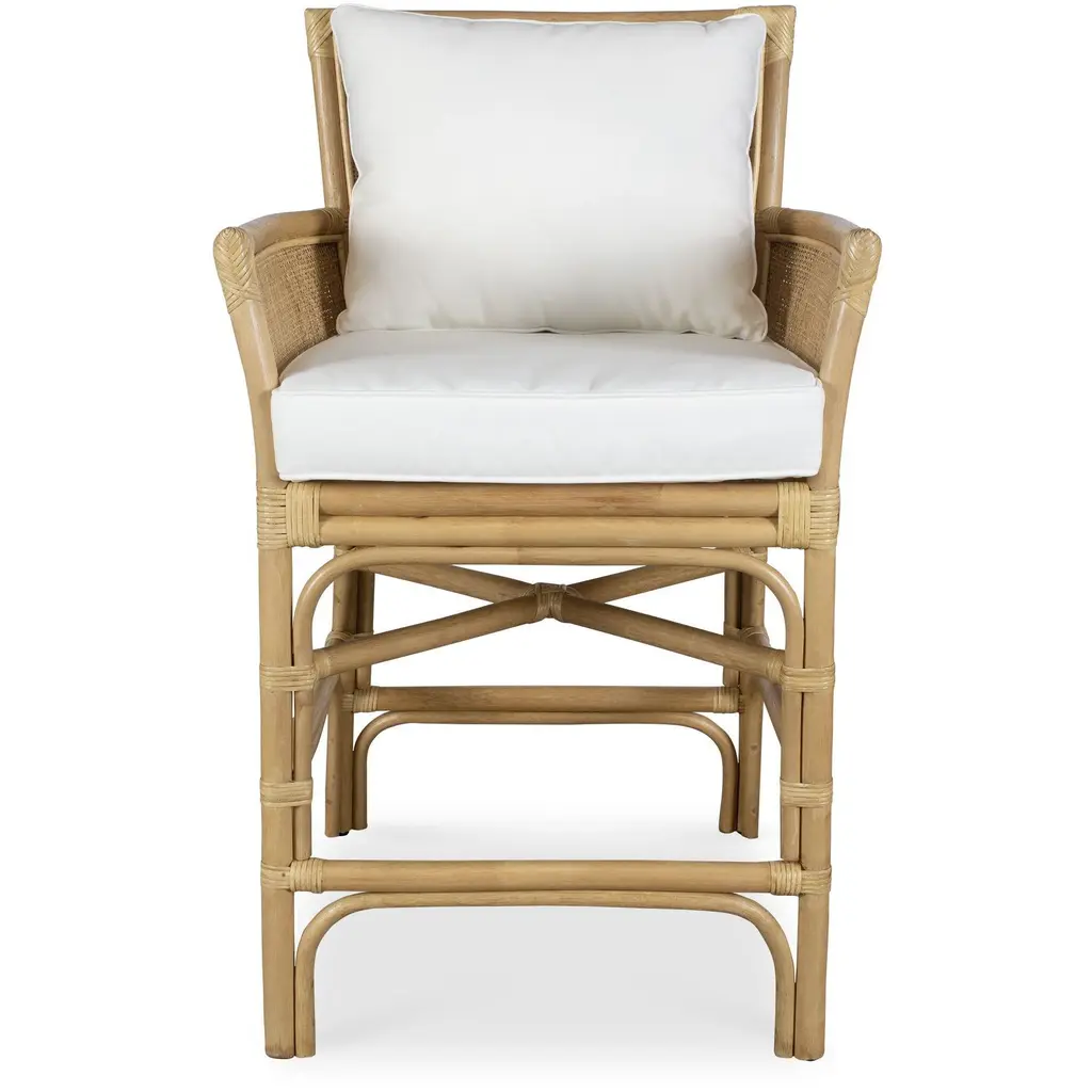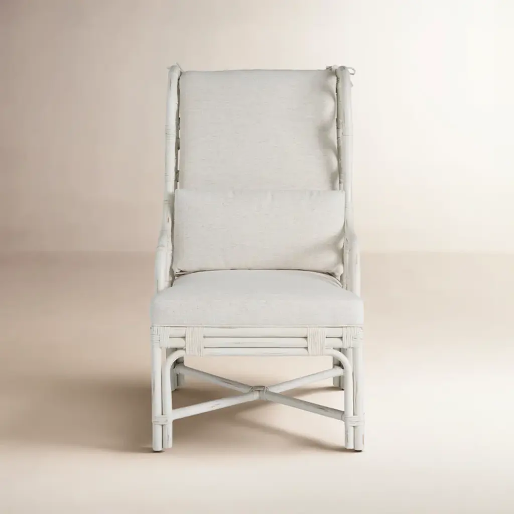 Hand-finished in a gorgeous camel hue, this chair is crafted of rattan with a Chippendale-style design and an upholstered webbed deck. Rawhide-wrapped joints add strength and textural contrast, while amply padded cushions upholstered in linen-blend fabric ensure a comfy seat.