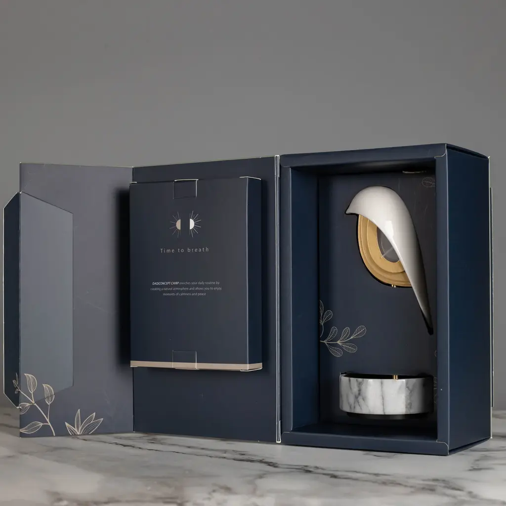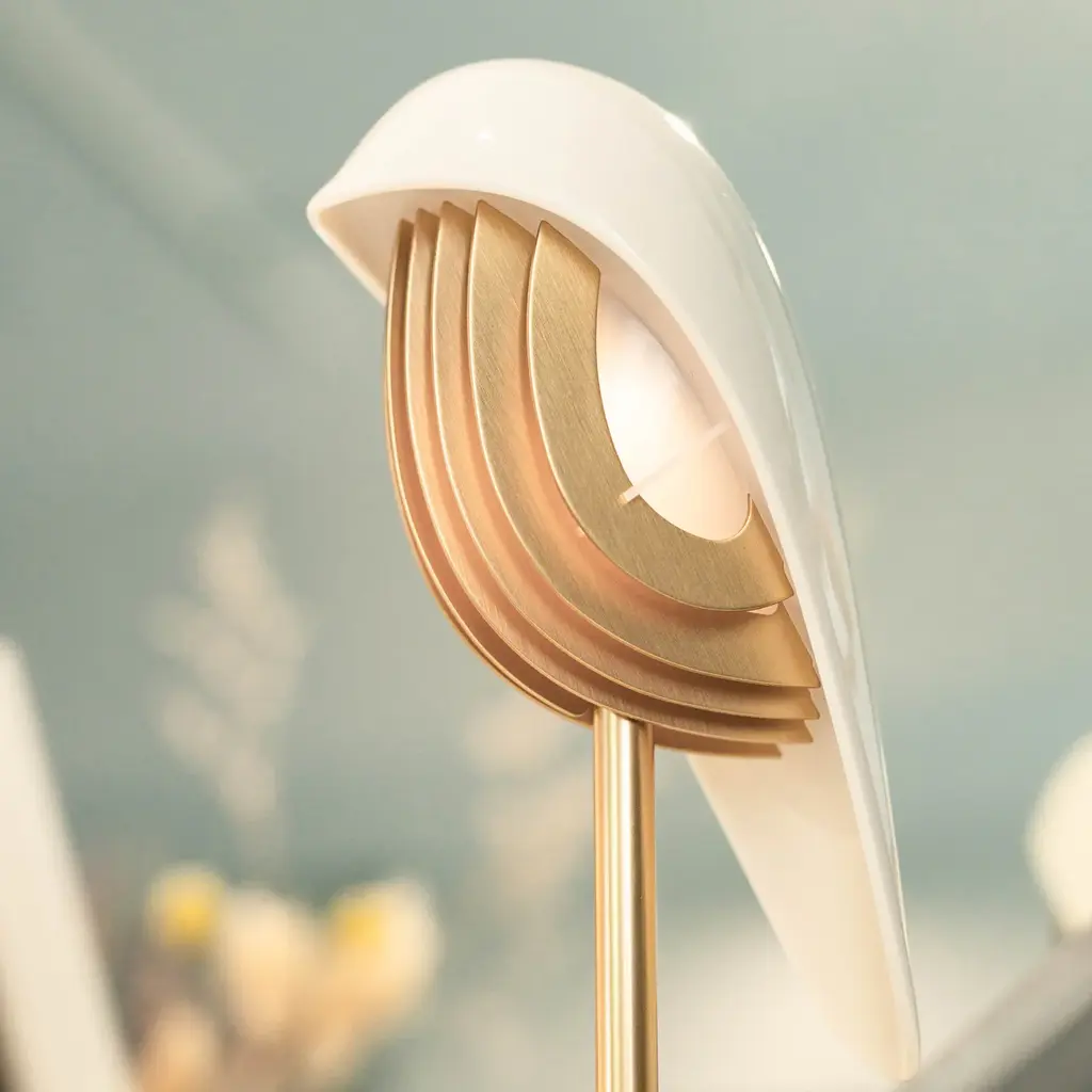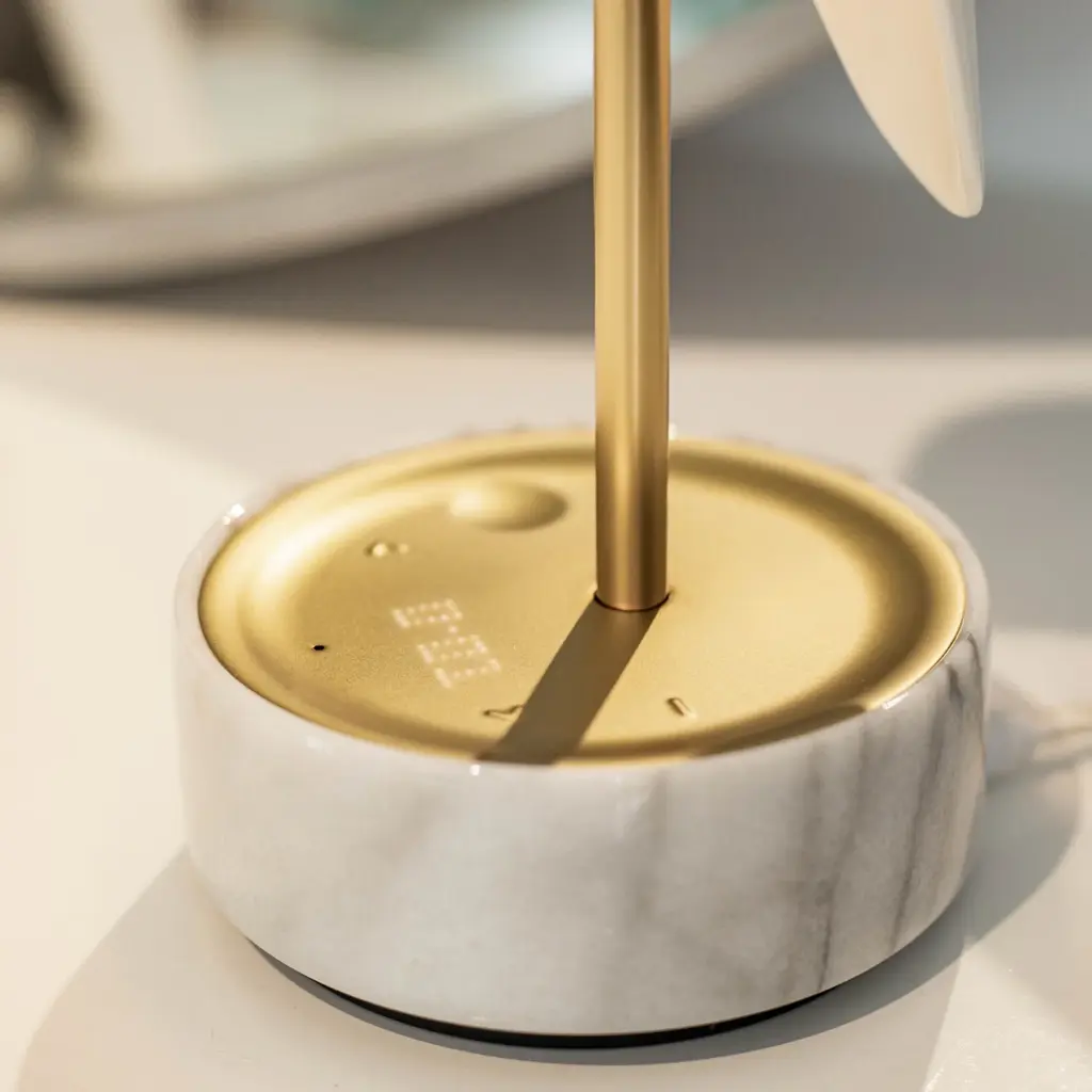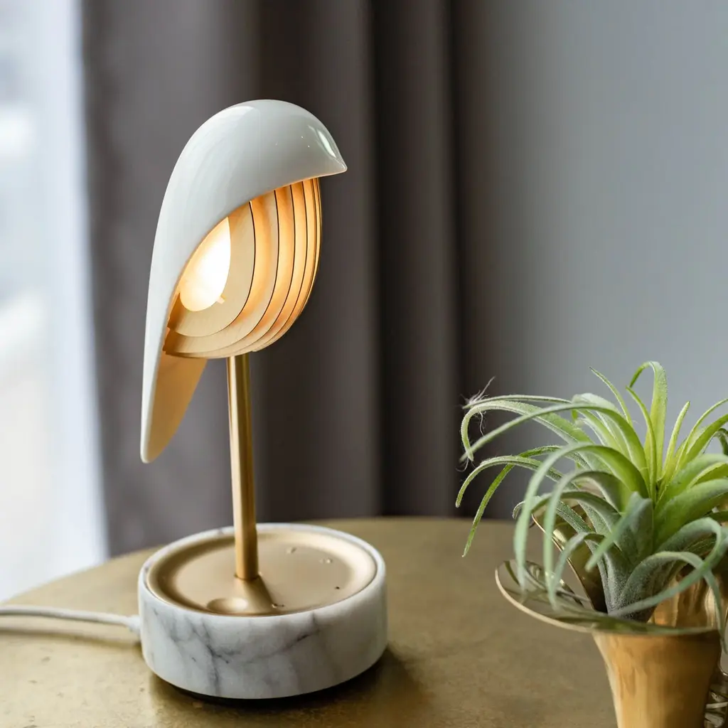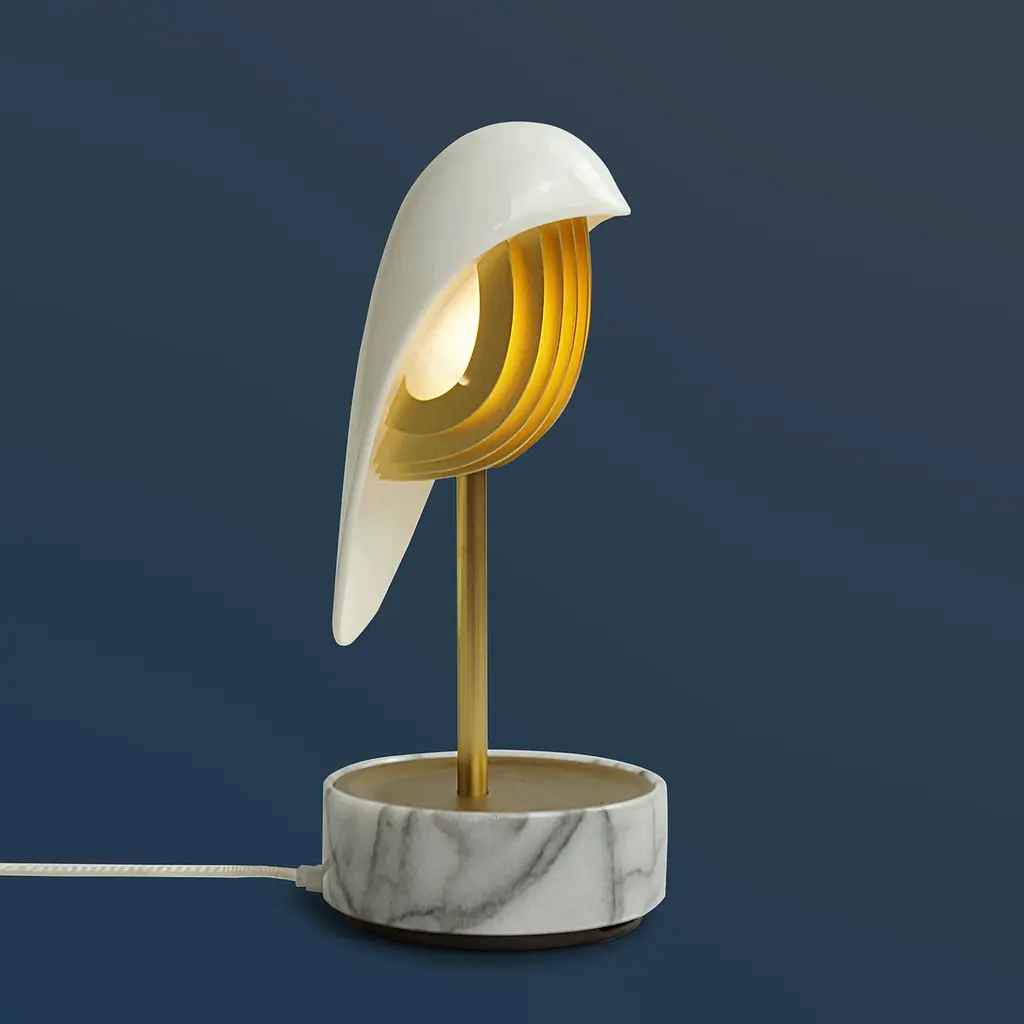 Experience a refreshing wake-up call with the Chirp Alarm Clock/Light from DAQI Concept. This sophisticated and unique clock features a smooth scoop shape, waking you up with a peaceful bird chirping sound, and a gentle brightening light. A round marble base and a vertical metal rod round out the look for an elegant bedside accent. Additionally, it functions as an audio player, adding a touch of soothing sound to your morning routine. Highlights
