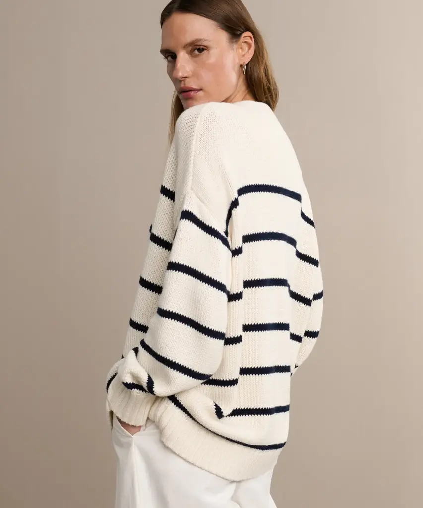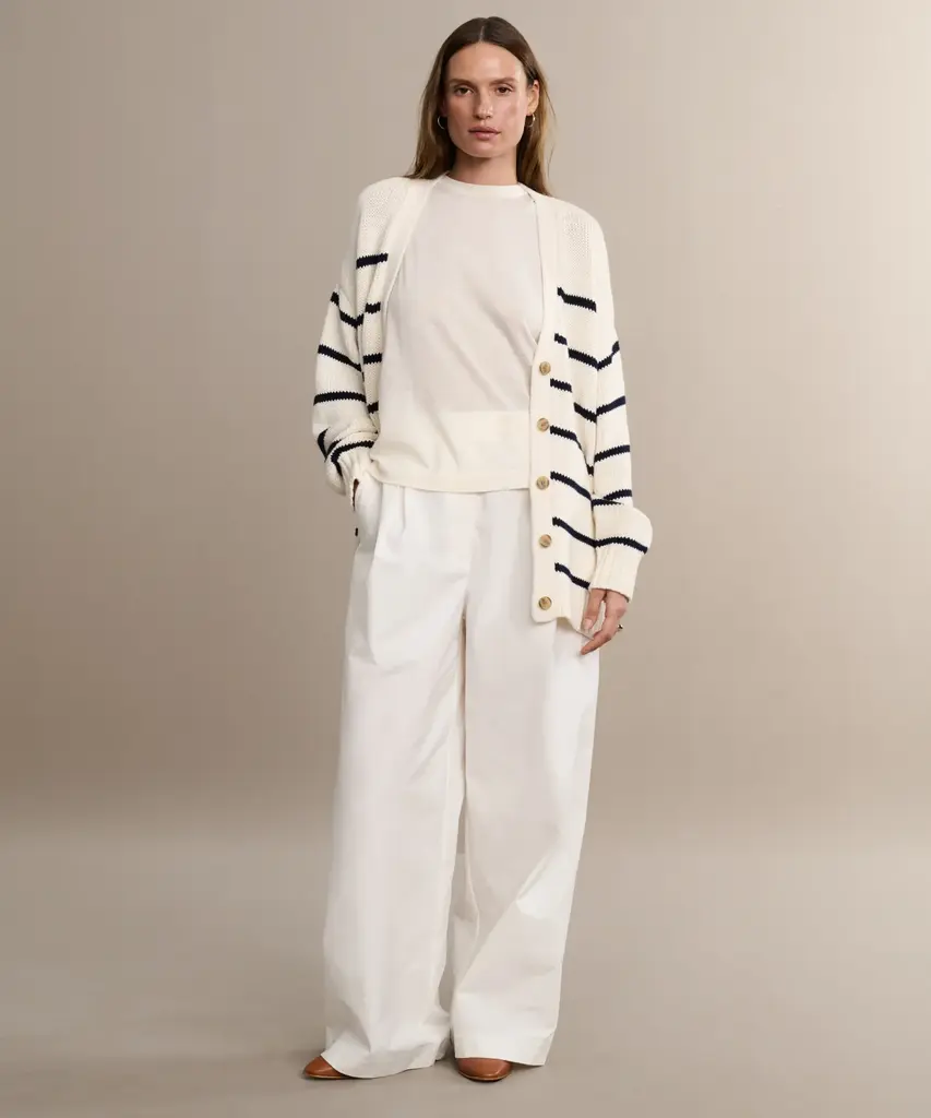 Chloe Cardigan Ivory/Navy Stripe For fans of the best-selling Chloe Crewneck, this buttoned-up edition is one of our most covetable warm-weather sweaters. Designed to elevate your spring and summer wardrobe in every sense, you’ll be wearing this with everything from vintage denim and trousers to dresses.