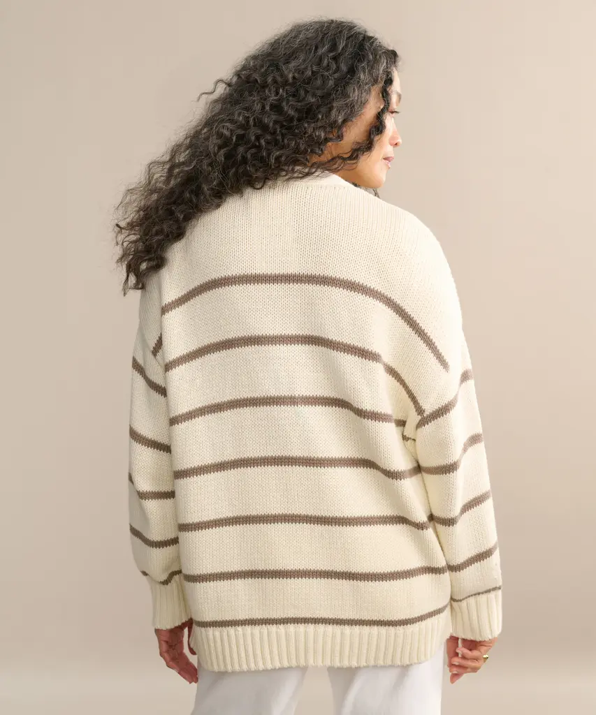 Chloe Cardigan Ivory/Taupe Stripe For fans of the best-selling Chloe Crewneck, this buttoned-up edition is one of our most covetable warm-weather sweaters. Designed to elevate your spring and summer wardrobe in every sense, you’ll be wearing this with everything from vintage denim and trousers to dresses.