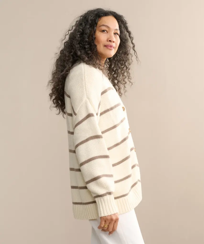 Chloe Cardigan Ivory/Taupe Stripe For fans of the best-selling Chloe Crewneck, this buttoned-up edition is one of our most covetable warm-weather sweaters. Designed to elevate your spring and summer wardrobe in every sense, you’ll be wearing this with everything from vintage denim and trousers to dresses.