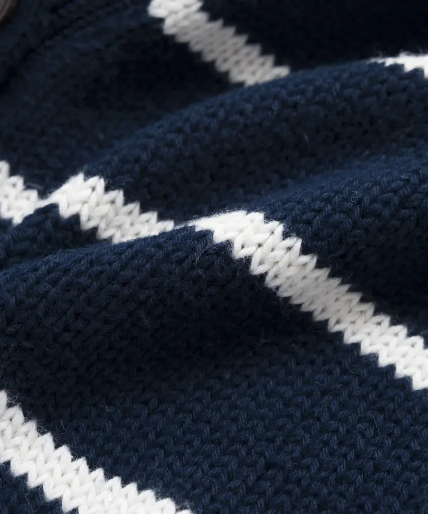 Chloe Cardigan Navy/Ivory Stripe For fans of the best-selling Chloe Crewneck, this buttoned-up edition is one of our most covetable warm-weather sweaters. Designed to elevate your spring and summer wardrobe in every sense, you’ll be wearing this with everything from vintage denim and trousers to dresses.