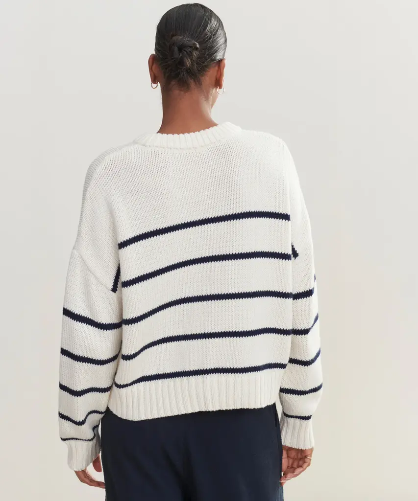 Chloe Crewneck Ivory/Navy Stripe In 100% Peruvian cotton, it’s a classic silhouette in a casual, slightly cropped style—perfect for welcoming warmer weather. The beauty of this knit is its versatility in styling. Wear it with shorts, over a dress, or with jeans for an instantly pulled-together look.