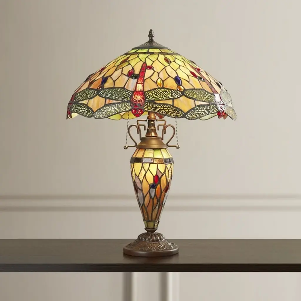Illuminate your home with the Chloe Lighting Anisoptera Purity table lamp—an artful blend of Tiffany craftsmanship and nature-inspired elegance. The generously sized 19″ stained-glass shade (approx. 7″ tall) is handcrafted with vibrant dragonfly motifs using over 327 individually copper-foiled glass pieces and 63 glass beads. Set atop a rich dark bronze resin/metal base, the lamp stands 24″ tall with an 18.5″ base diameter. This double-lit design features two E26 sockets (up to 100 W) for overhead light and one E12 base socket (candelabra) for soft night illumination. Ideal for living rooms, dens, or bedside, it offers stunning color infusion and dual-function lighting control via pull-chain and cord rotary switch Key features: Vibrant Visual Artistry: Illuminated dragonfly motifs glow with rich jewel tones, adding elegance and life to any space. Dual Lighting Modes: Offers bright overhead illumination and a gentle night-light base for flexible ambiance. Perfect Focal Point: Large shade and bold craftsmanship make this lamp a statement decor piece. Effortless Use: Convenient dual-switch layout and plug-in power make it easy to operate. Reliable Quality: Robust construction, safety-certified, and built to last.