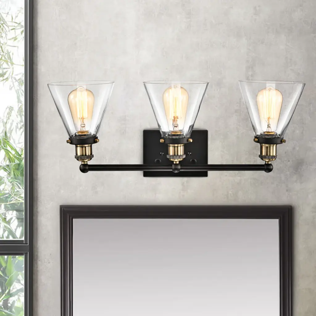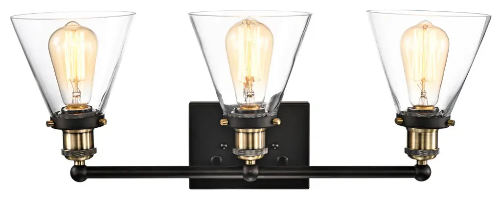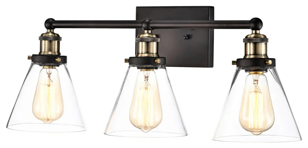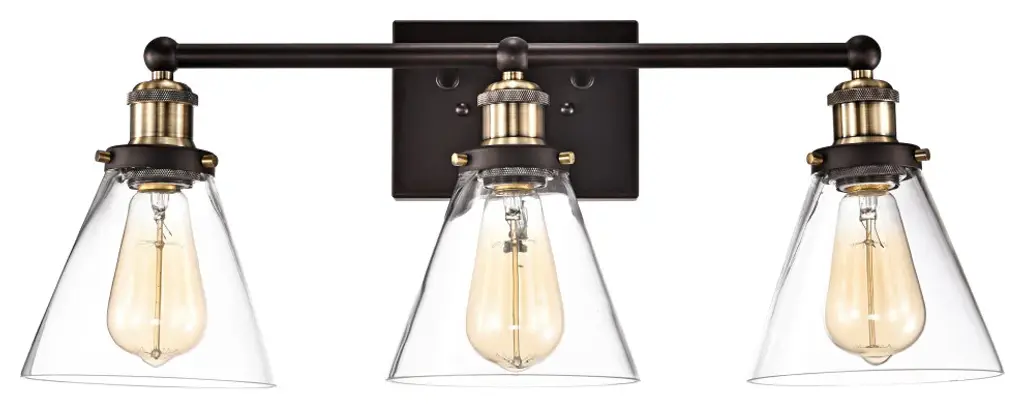 Add a bit of sparkle and shine to your restroom this season with this gorgeous transitional style, rubbed bronze bath and vanity fixture. This fixture can be installed both upwards and downwards, and the spotlight shaped clear glass shades are open, making light bulb changes a breeze. If you''re looking for a beautiful vanity fixture to complete your restroom, look no further! This fixture takes three 100W E26 bulbs, and is compatible with flourescent, incandescent, and LED bulbs. This fixture is damp listed and UL listed. Lighting Information:-Bulb type: A-Number of bulbs: 3-Bulb(s) not included-UL Listed-Bulb wattage: 100-Hardwire