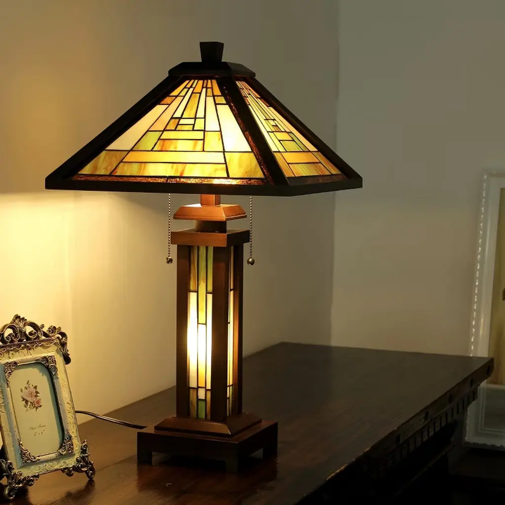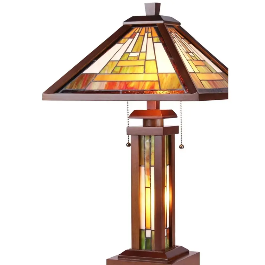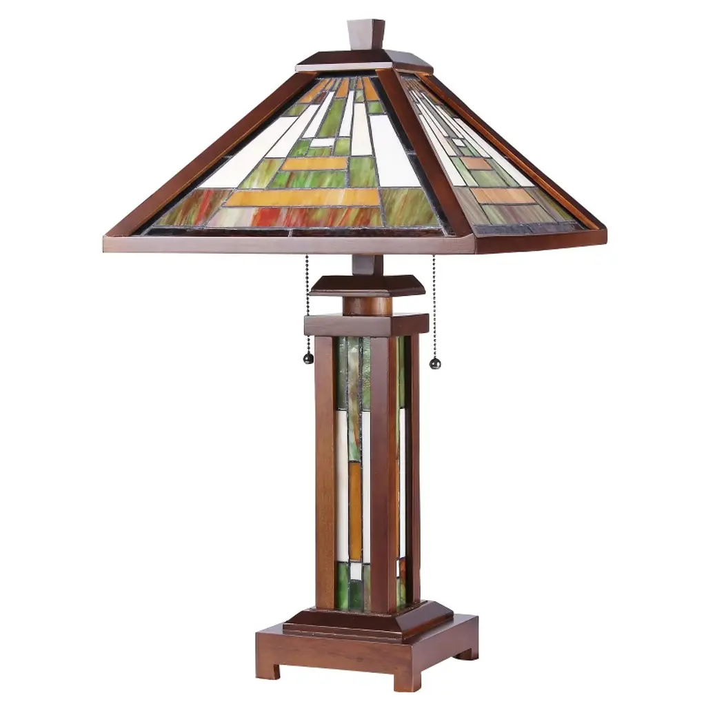 Bring refined craftsmanship and timeless warmth to your space with the Gawain Tiffany-Style Mission Table Lamp. This distinguished piece blends hand-cut Tiffany glass with a sturdy wooden base in a dark walnut finish, evoking the elegance and functionality of traditional Mission style. The 15-inch square shade features a mosaic of 180 individual glass cuts in earth-toned hues, carefully soldered in copper foil. Key Features Mission-style double lit lamp with upper E26 and lower E12 light sources Shade handcrafted with 180 cuts of authentic Tiffany-style stained glass Solid wooden base in a rich dark walnut finish adds courtly character Dimensions: 25.6" H × 15" W × 15" D; 75" electric cord for plug-in use UL and cUL Listed; features pull chain and on-cord rotary switch