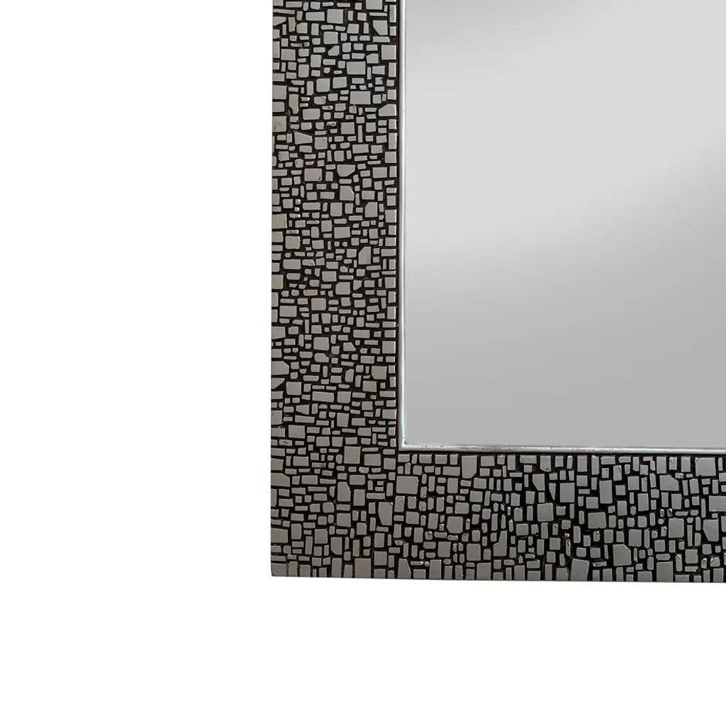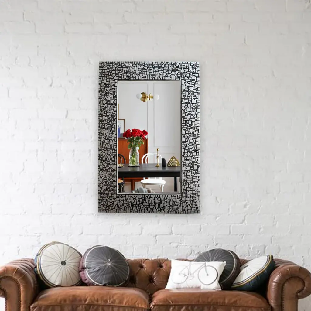 Looking for a unique addition for your home? Look no further! This contemporary, rectangle shaped, antique-silver finish, framed wall mirror would look great above the couch, in the bedroom, or as an accent piece between two windows! This mirror hangs vertically. The mirror is damp listed for use in a restroom, but is not recommended for use outdoors.