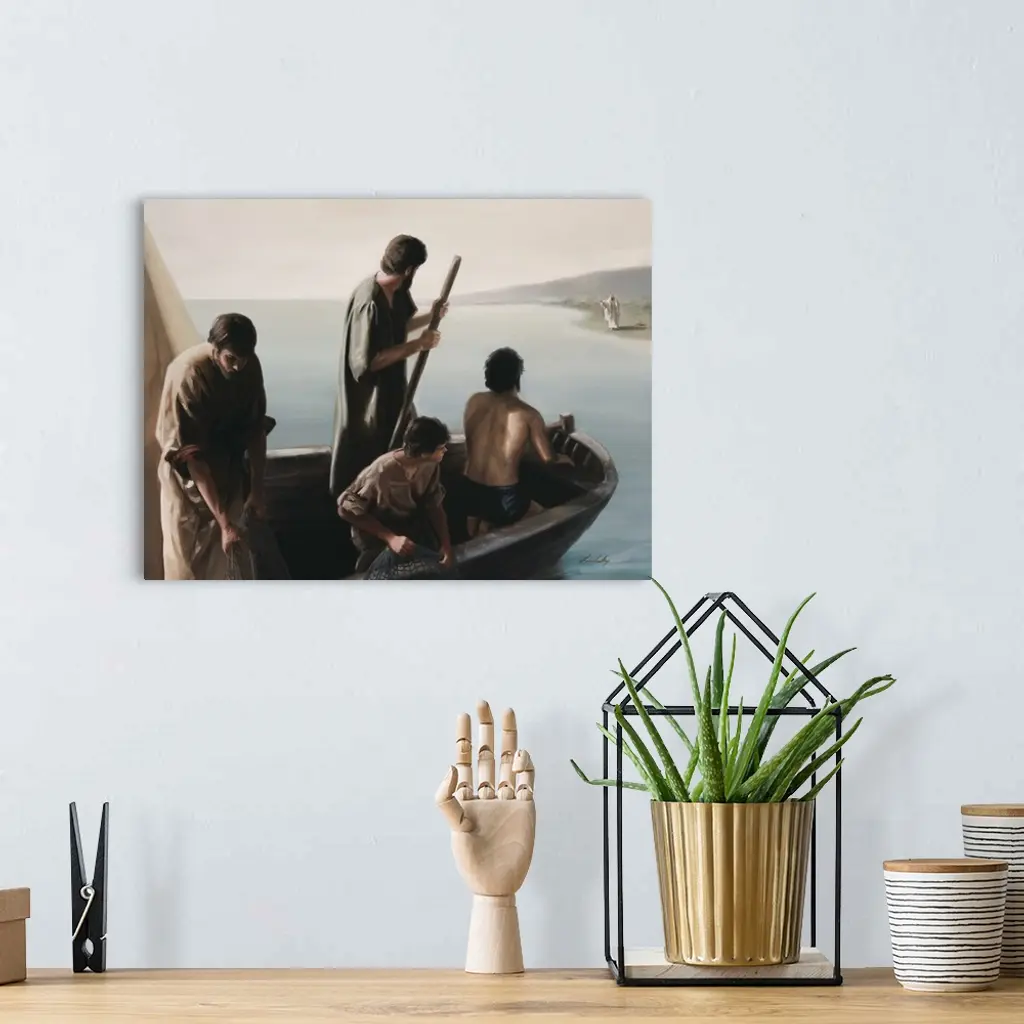 Jesus waving from the beach to men in a boat