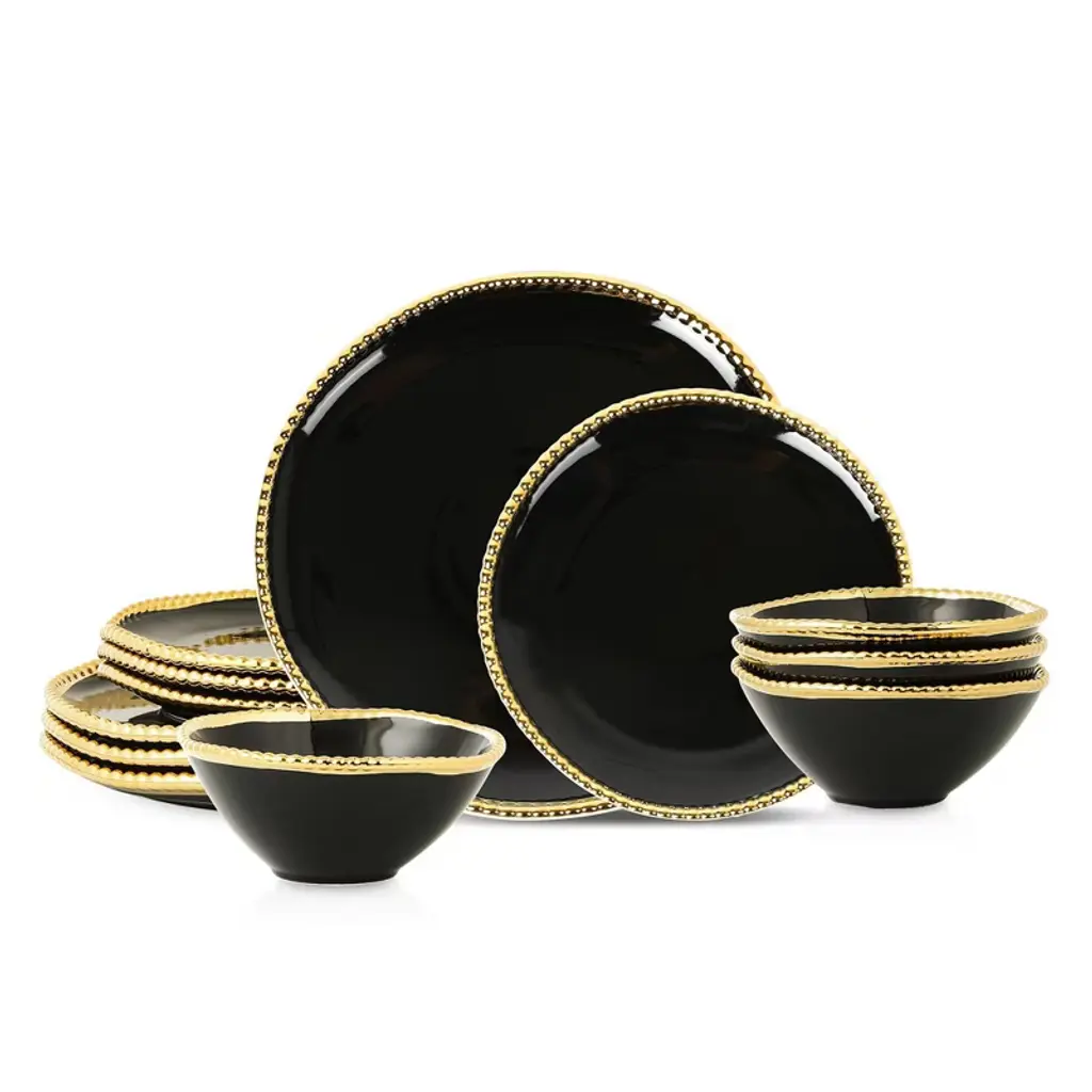 Perfectly beaded, beautifully golden. The Christian Siriano Akoya Porcelain 12-Piece Dinnerware Set adds a bold & beautiful flare to your table. Reimagining the beauty of antique dinnerware, each piece is studded with a gold beaded halo and free-form rims, topped off by a glossy finish. Designed to be lived with day in and day out—through early morning breakfasts, evening dinners, and late-night desserts—this set includes 4 10” dinner plates, 4 8” salad plates, and 4 6” bowls.