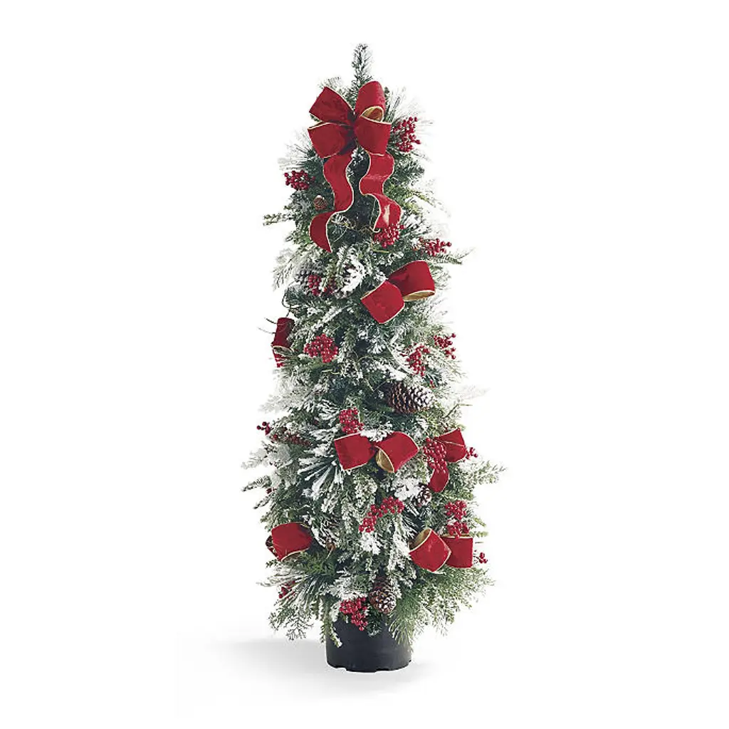 With red berries tucked amid snow-flocked pinecones and greenery, this iconic holiday embellishment will never go out of style. The lifelike sprays of yew, cedar, juniper and redwood are meticulously crafted and UV treated to prevent fading, then illuminated with 200 warm white LED lights. Lifelike faux greenery Handcrafted Accented with red velvet bow on top (coordinating bows also available separately) 251 tips 200 warm white LED lights 6 ft. power cord Arrives in a green plastic pot (9-1/2" dia. x 7-1/2"H), ready to display To maximize the life of your greenery, we recommend a limit of three months of outdoor exposure per year For indoor/outdoor use Fluff and shape greenery after unpacking Clean with a soft, dry cloth or duster Imported Part of the Flocked Christmas Cheer Collection A Frontgate exclusive. At Frontgate, our primary focus is quality. We guarantee that every product we sell will stand up to the supreme test – our customers' satisfaction. To learn more about our policies, visit our Shipping & Processing, Returns & Exchanges and Warranty & Price Guarantee pages. With red berries tucked amid snow-flocked pinecones and greenery, this iconic holiday embellishment will never go out of style. The lifelike sprays of yew, cedar, juniper and redwood are meticulously crafted and UV treated to prevent fading, then illuminated with 200 warm white LED lights. Lifelike faux greenery Handcrafted Accented with red velvet bow on top (coordinating bows also available separately) 251 tips 200 warm white LED lights 6 ft. power cord Arrives in a green plastic pot (9-1/2" dia. x 7-1/2"H), ready to display To maximize the life of your greenery, we recommend a limit of three months of outdoor exposure per year For indoor/outdoor use Fluff and shape greenery after unpacking Clean with a soft, dry cloth or duster Imported Part of the Flocked Christmas Cheer Collection A Frontgate exclusive. At Frontgate, our primary focus is quality. We guarantee that every product we sell will stand up to the supreme test – our customers' satisfaction. To learn more about our policies, visit our Shipping & Processing, Returns & Exchanges and Warranty & Price Guarantee pages.