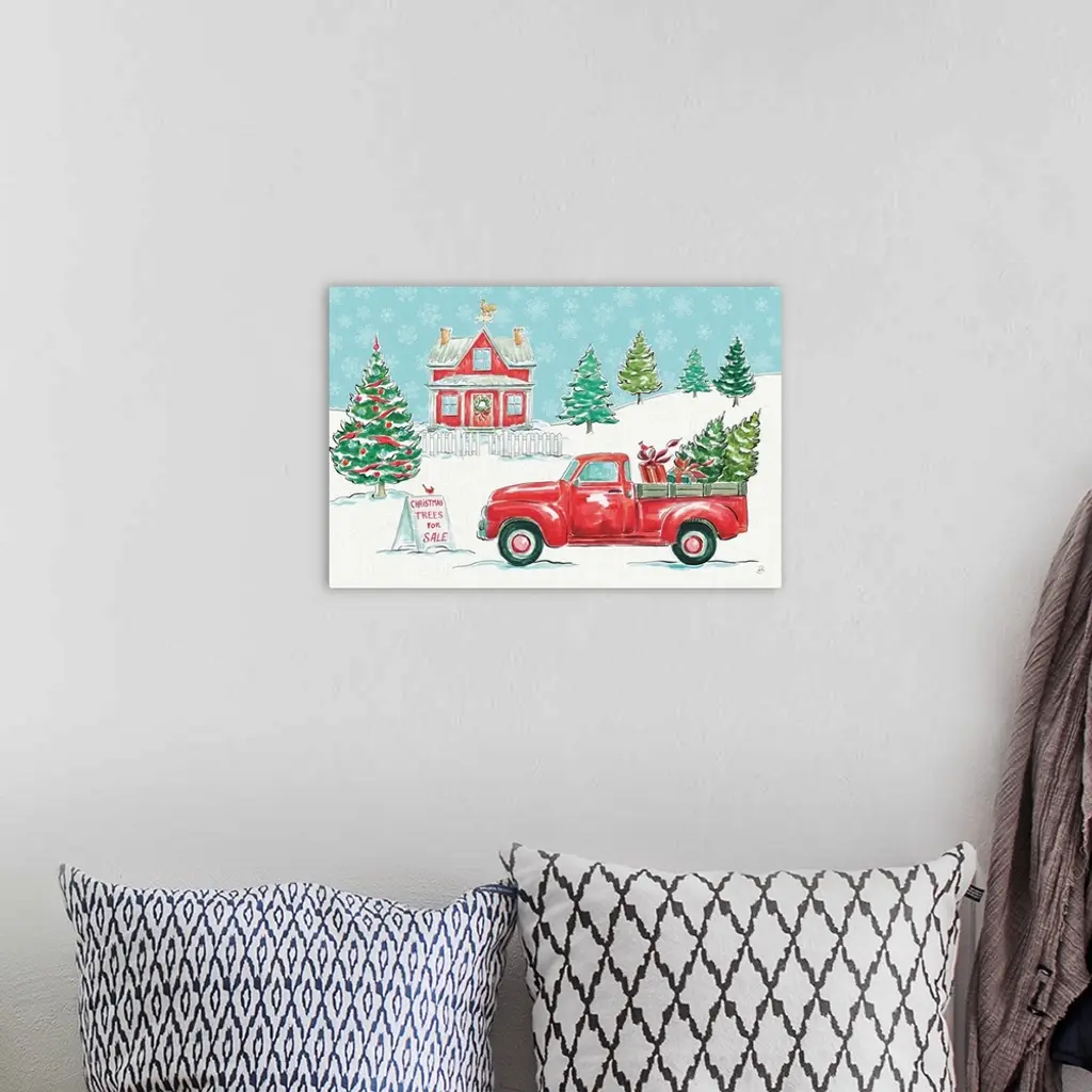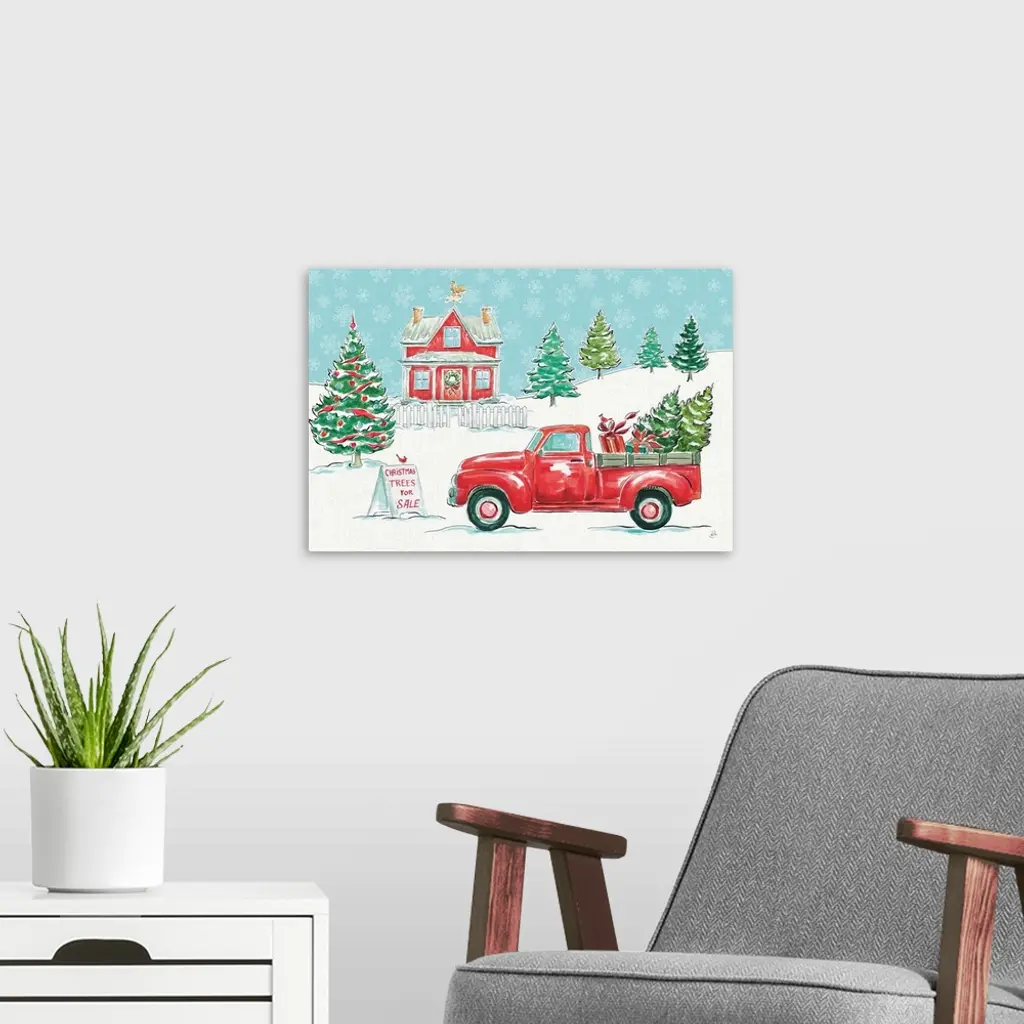 A decorative holiday scene of a vintage truck carrying Christmas trees at a tree farm covered in snow and a blue sky full of snowflakes.