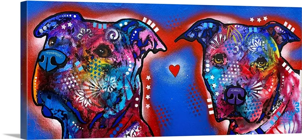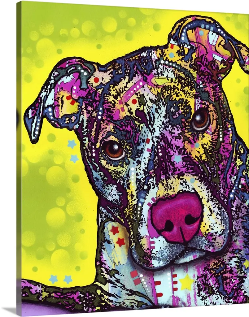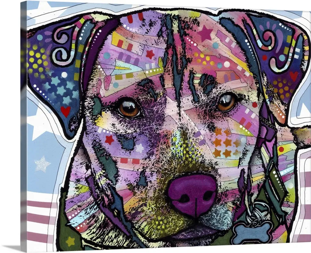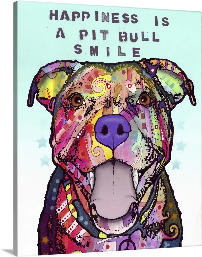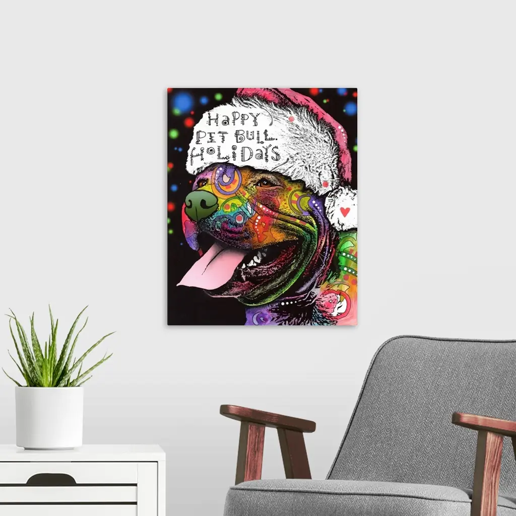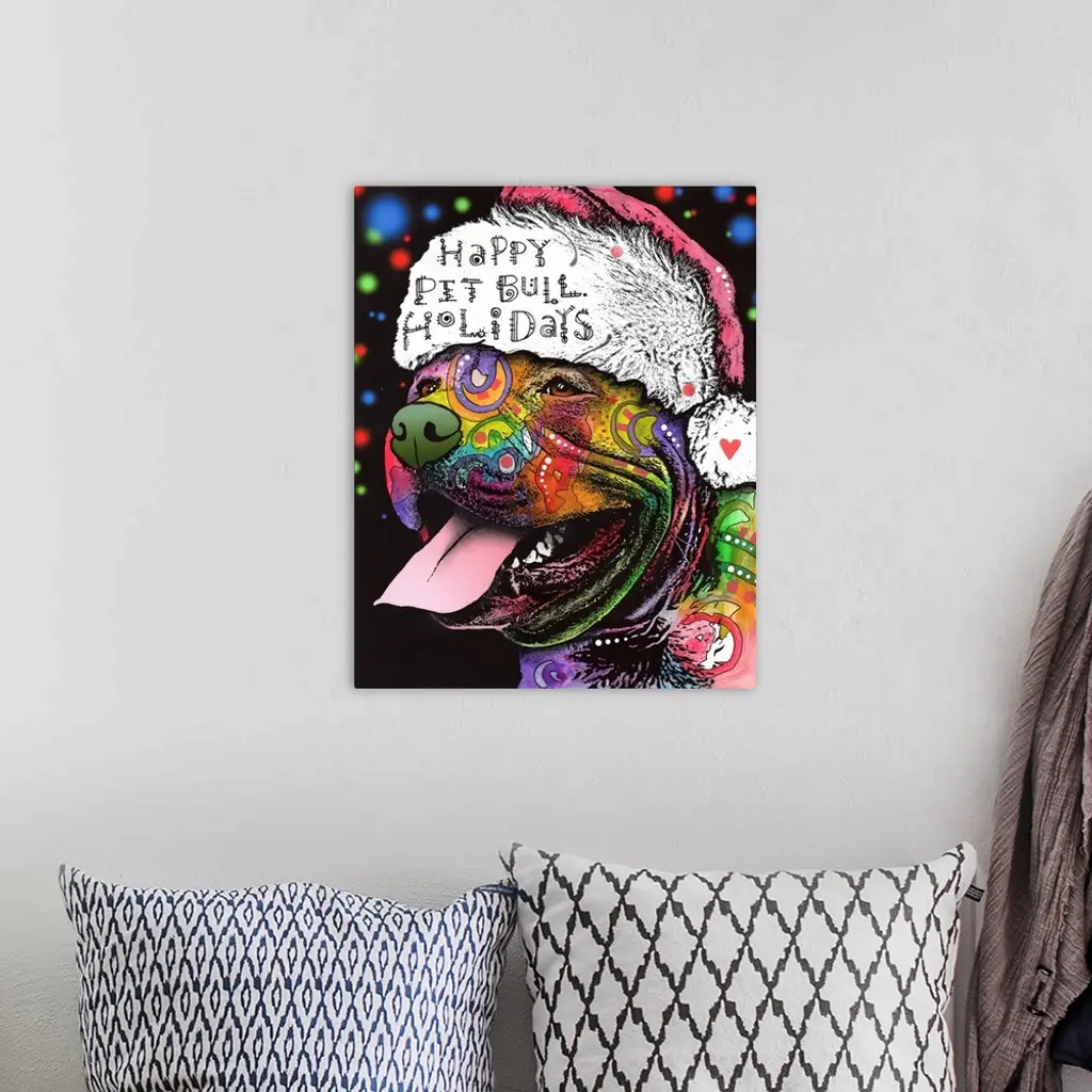 "Happy Pit Bull Holidays" handwritten on a Santa hat that a happy pit bull covered in different colors and abstract designs is wearing.