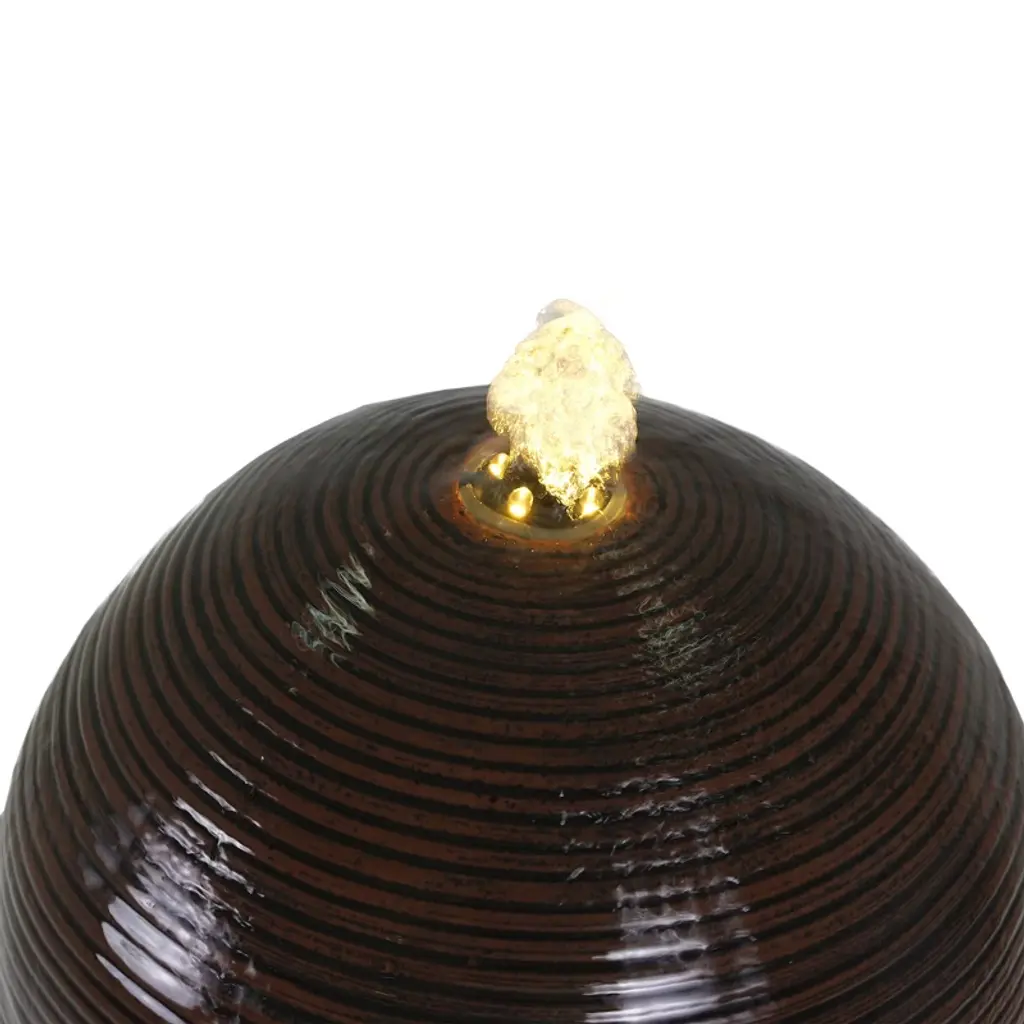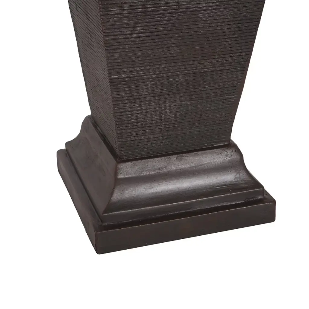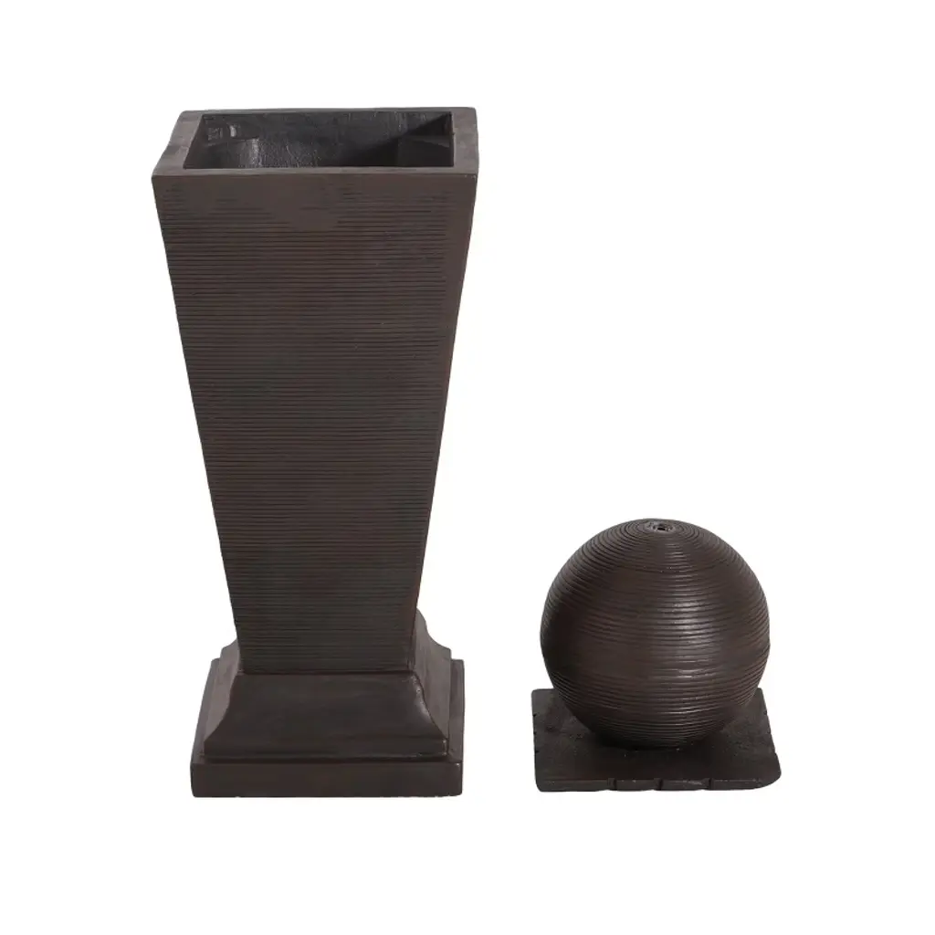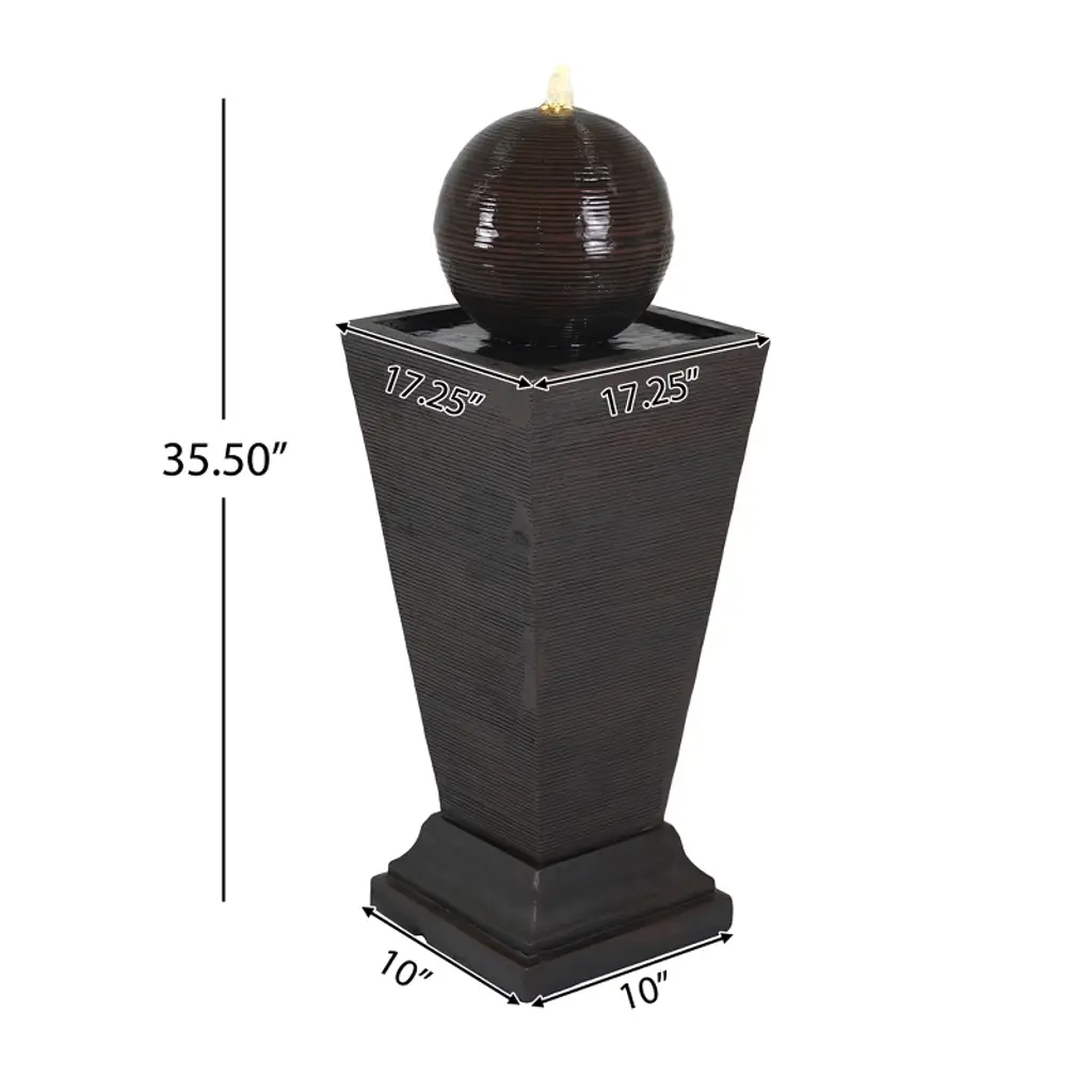 This outdoor fountain features a retro style design with a tall dark brown column that brings timeless elegance to gardens, patios, or courtyards. Built-in LED lights illuminate the water at night, creating a warm, inviting glow that enhances any outdoor atmosphere. With an adjustable water flow, you can easily control the speed and sound to achieve the perfect relaxing ambiance. Crafted from durable concrete, it ensures strength, stability, and weather resistance for long-term outdoor use. Simple assembly makes setup quick, allowing you to enjoy its beauty effortlessly. Main Material: Concrete Assembly Required Dimensions: 17.25''D X 17.25''W X 35.50''H Water Capacity: 1.32 gallons Power Source: Plug-in Plug Type: Type A Voltage: 120 Volt