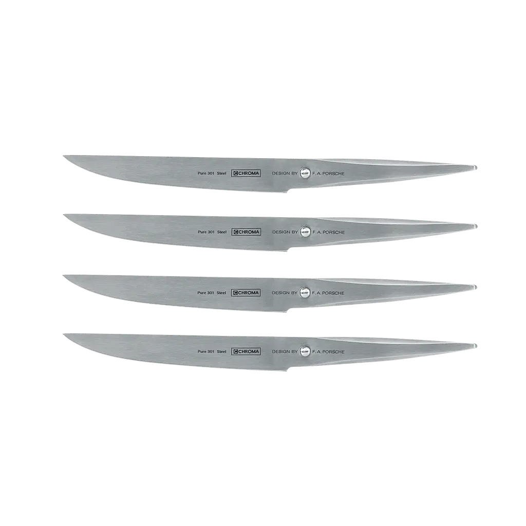 The handle of the CHROMA type 301 - Design by F.A. Porsche is constructed of stainless steel, and the blade is made of high-quality Japanese 301 steel. The blade of each knife is carefully razorsharp sharpened by the hand of a master. Hand wash and dry after every use. Sharpen the knife using the original Type 301 whetstone. Do not use a sharpening steel be used, as it will damage the blade. Only use a wooden or plastic cutting board, never use glass or marble. Product Features • An ergonomic handle - designed by F.A. Porsche working with the chef of the decade, Jörg Wörther • A metal "pearl" that clearly demarcates the end of the handle, for better control when cutting • A seamless perfection and hygienic transition from blade to handle • A special grinding method is used, so the knife stays sharp longer and is easier to sharpen • The out of the box sharpness is one of the best in the industry. That is beloved by famous chefs Product Information • Model Number : P918 • Dimension : 2 x 15.25 x 4 inches • Includes: 3 1/4" Paring Knife and 8" Chef Knife • Shipping Weight : 1.76 pounds • Origin : Imported