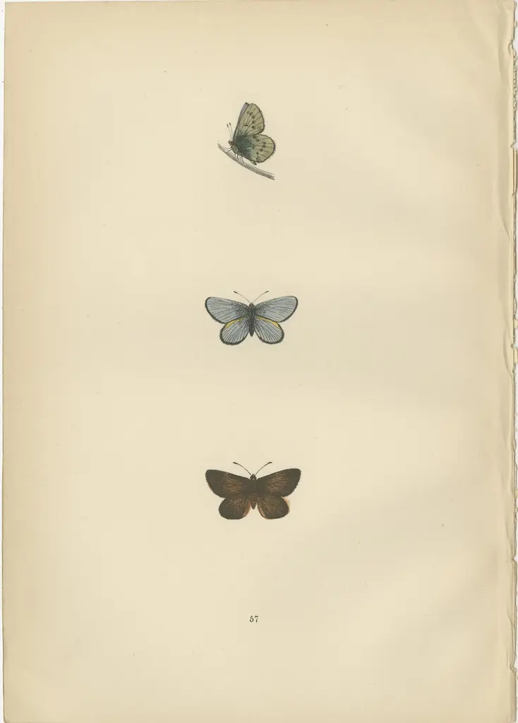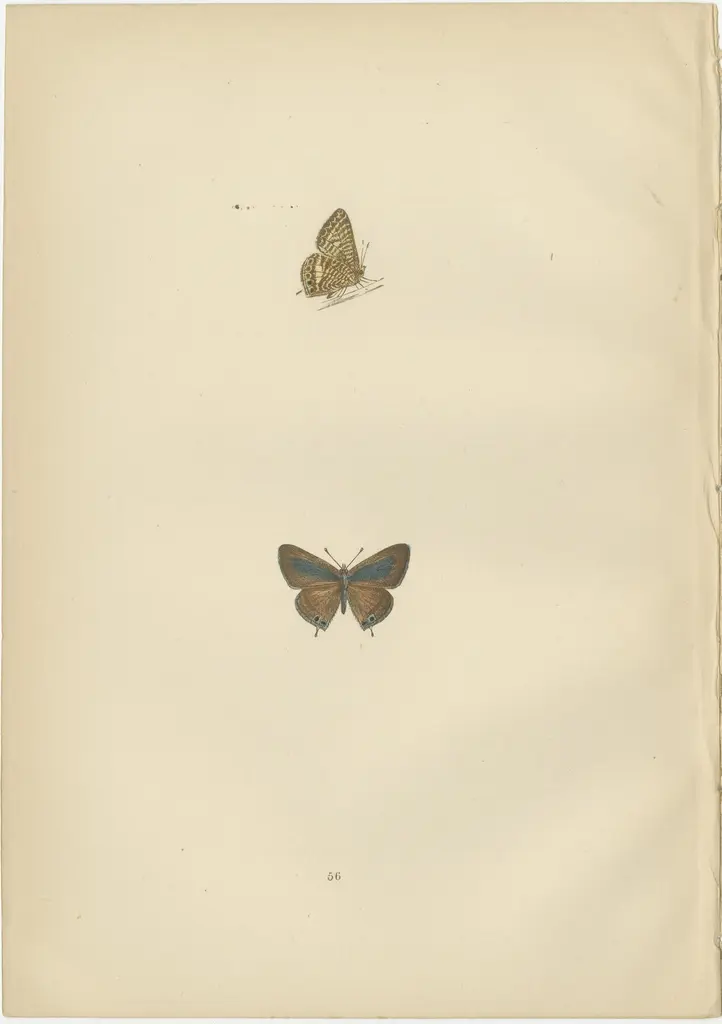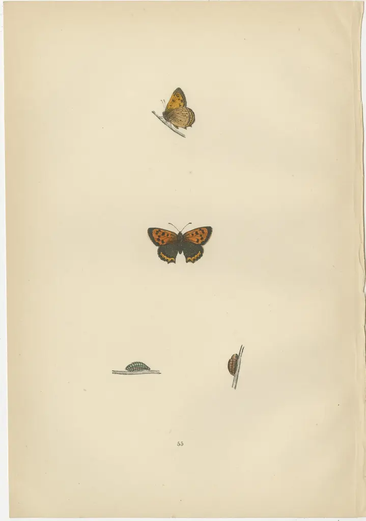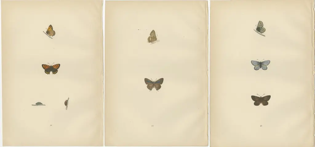 Beautiful hand-colored antique prints of butterflies. They are from a work by Morris, published in 1890.The butterflies from these plates are known for their distinct appearances and behaviors:1. Small Copper (Lycaena phlaeas): The Small Copper is a small, dynamic butterfly that is a treat to spot due to its bright copper wings with dark brown spots and margins. An interesting fact about this species is its territorial nature, with males often seen perching on a leaf or stone, ready to take flight and chase away intruders. They have multiple generations a year and can be found in a variety of habitats, including heathlands, grasslands, and even urban gardens.2. Brighton Argus (Aricia agestis), also known as Brown Argus: This small butterfly is notable for its brown upper wings with orange spots near the edges. Unlike other blues which are often tied to specific plant species, the Brown Argus's caterpillars feed on a variety of plants, which makes the species quite adaptable to different habitats. What makes them special is their ability to survive in a range of conditions, from coastal dunes to dry grasslands.3. Mazarine Blue (Cyaniris semiargus): This butterfly has beautiful deep blue upper wings edged with a black margin, while females have broader black borders. They are unique among the blues in not having any orange markings on the upper side. The Mazarine Blue is interesting for its enigmatic presence in Britain; it was thought to be extinct in the late 19th century, reappeared, and then vanished again. Its conservation status remains a point of interest and concern.Each of these species represents the incredible diversity of British butterflies and the intricacies of their life cycles and habitats. They are not only important pollinators but also indicators of the health of the environment. The hand-colored plates that depict them serve as both scientific documentation and historical art, capturing the beauty of these insects for posterity.