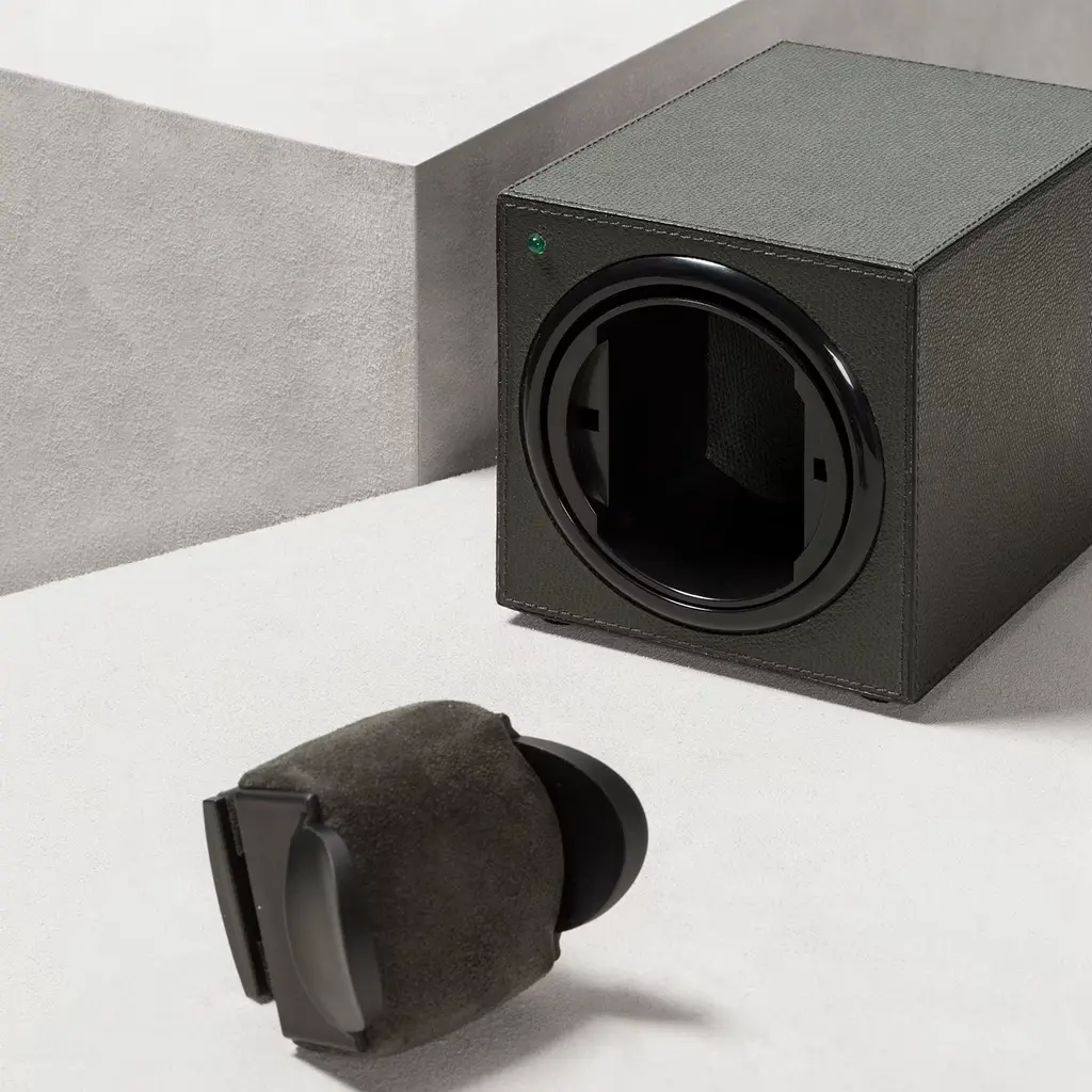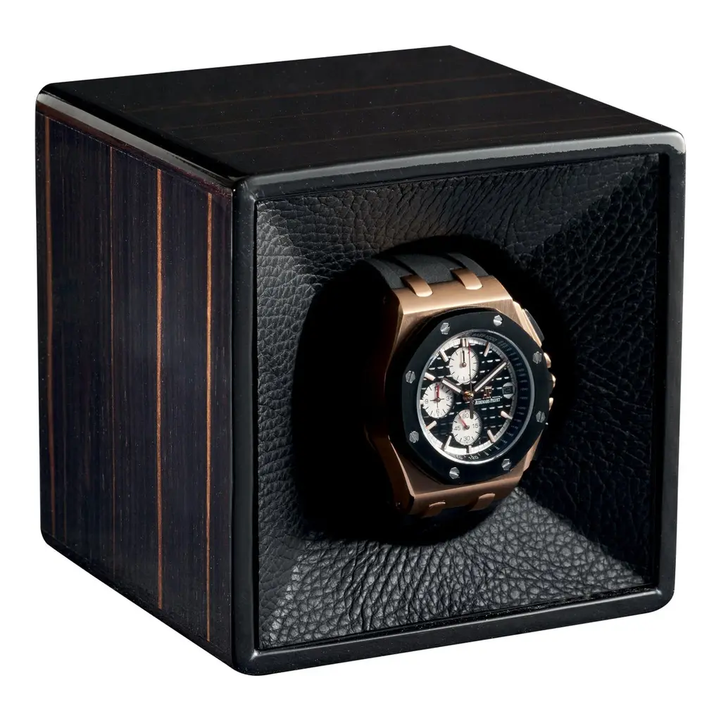 Leather-covered structure. It is sufficient to apply a slight pressure to detach the rotating part, which is provided with a watch strap extender. It works with 2 AA batteries. Multiple rotation settings: clockwise, counterclockwise or alternating. Chronos operates on a basis of gentle rotation, ensuring a consistent movement over a longer period of time that won't over-wind one's watch.