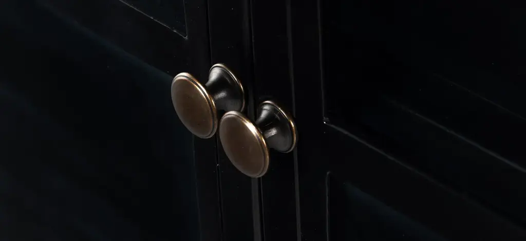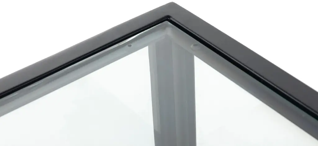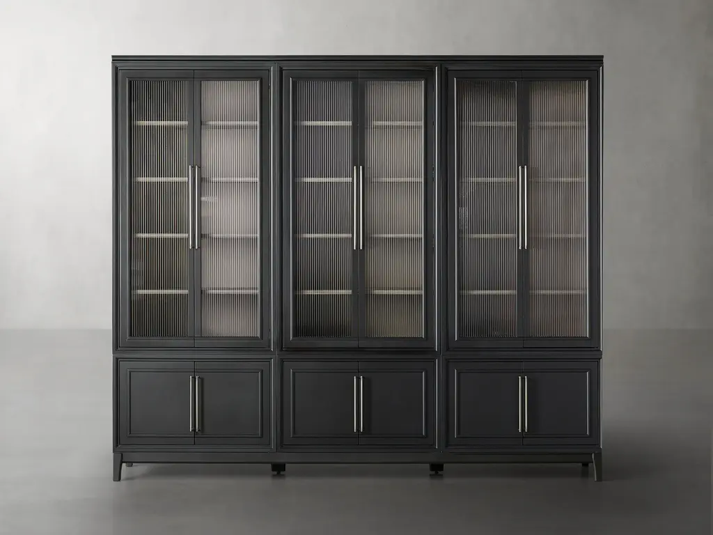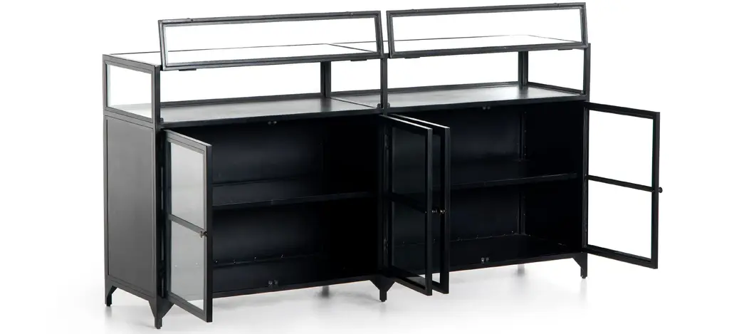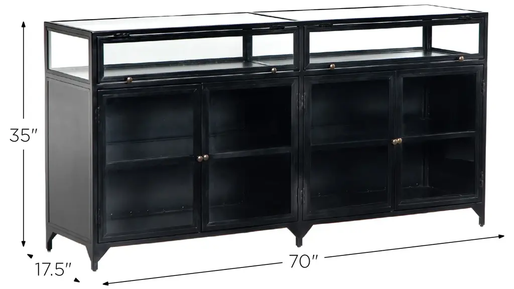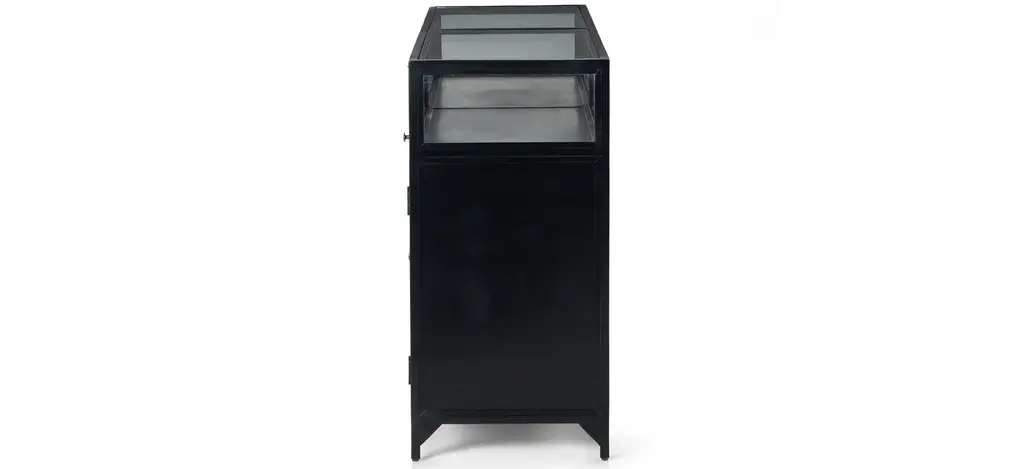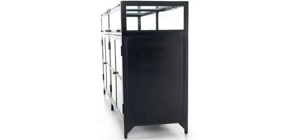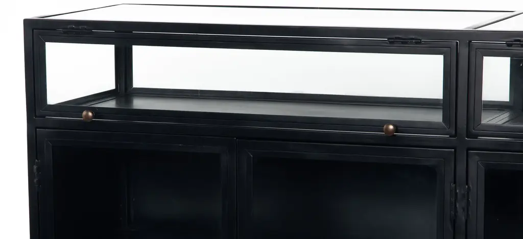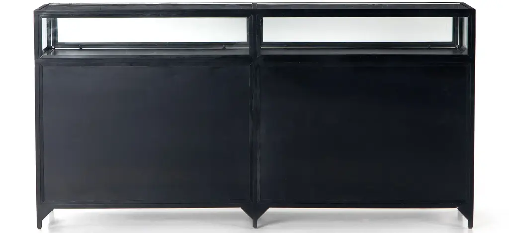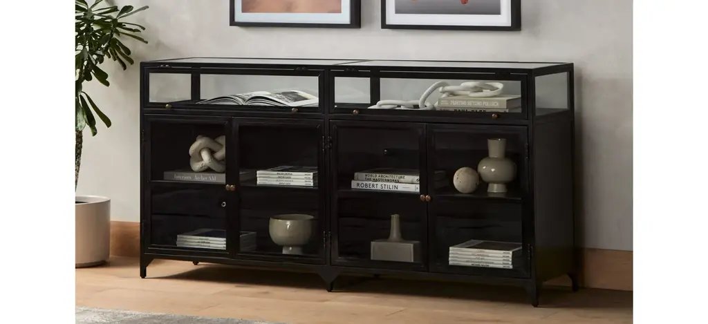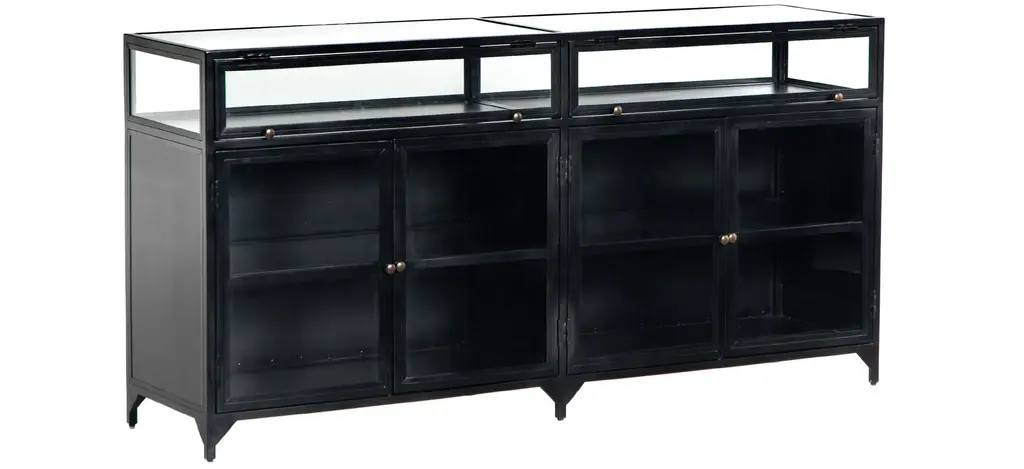 A shadowbox-inspired sideboard gives your inner collector a place to play. Store prized possessions behind clear glass fronts, with black-finished metal casing and brass hardware for contrast.