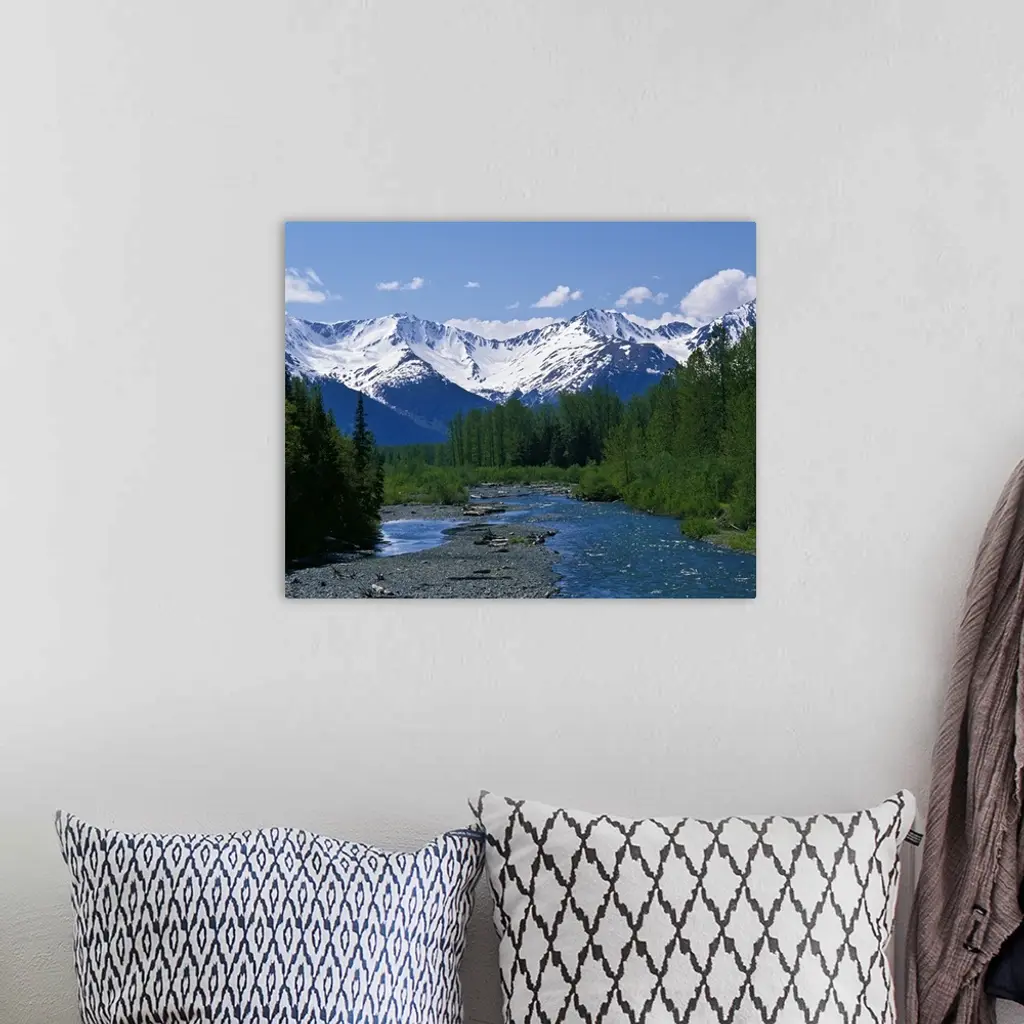 Large photograph of a stream running through a forest with the snowy Chugach Mountains in Alaska (AK) in the background.