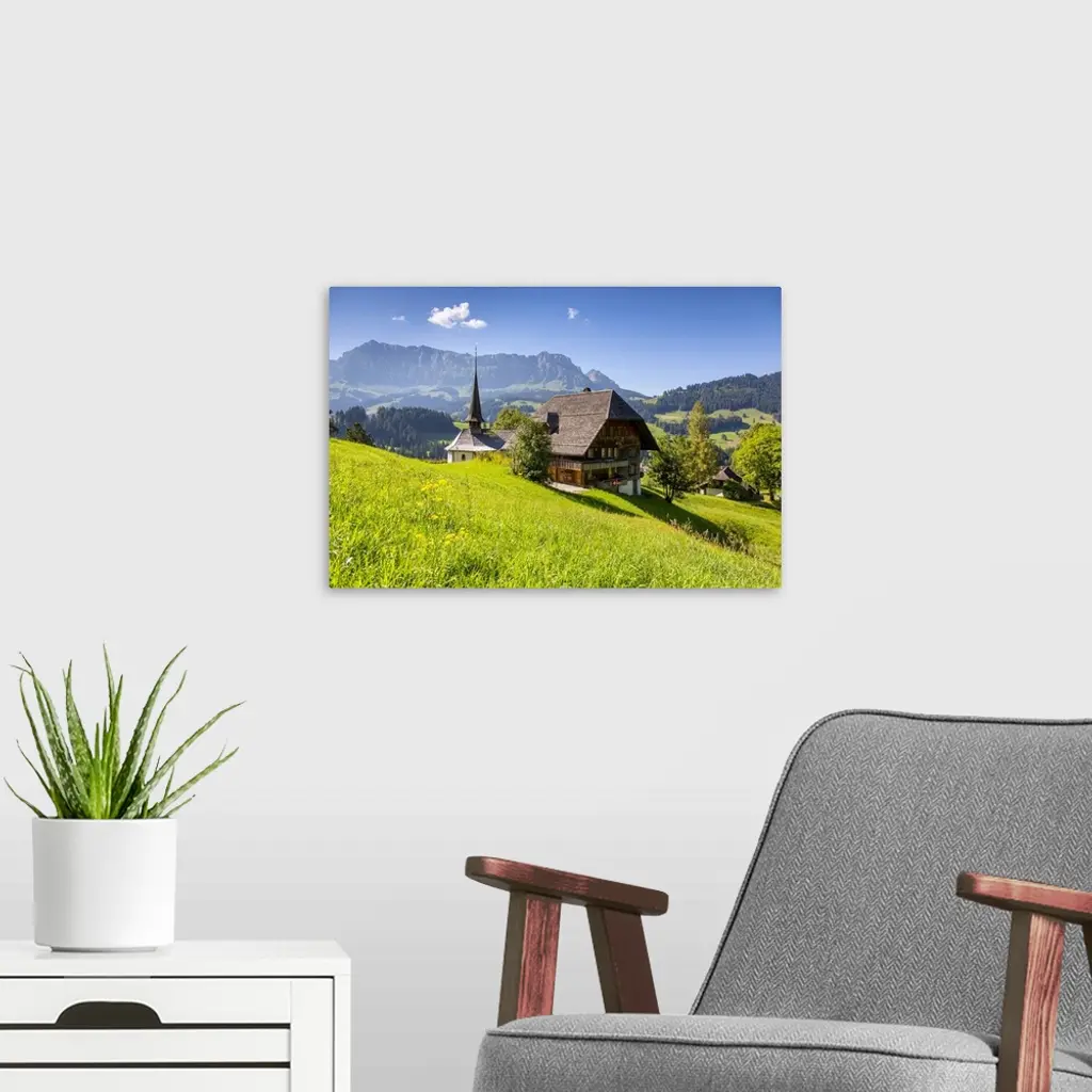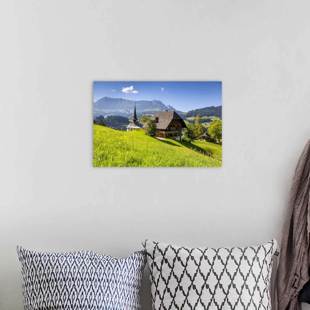 Church and farmhouse in a village in the Emmental Valley, Berner Oberland, Switzerland wall art for home and office decor. Discover canvas art prints, photos, mural, big canvas art and framed wall art in GreatBigCanvas.com's varied collections.