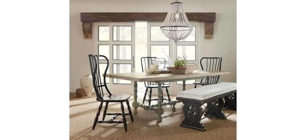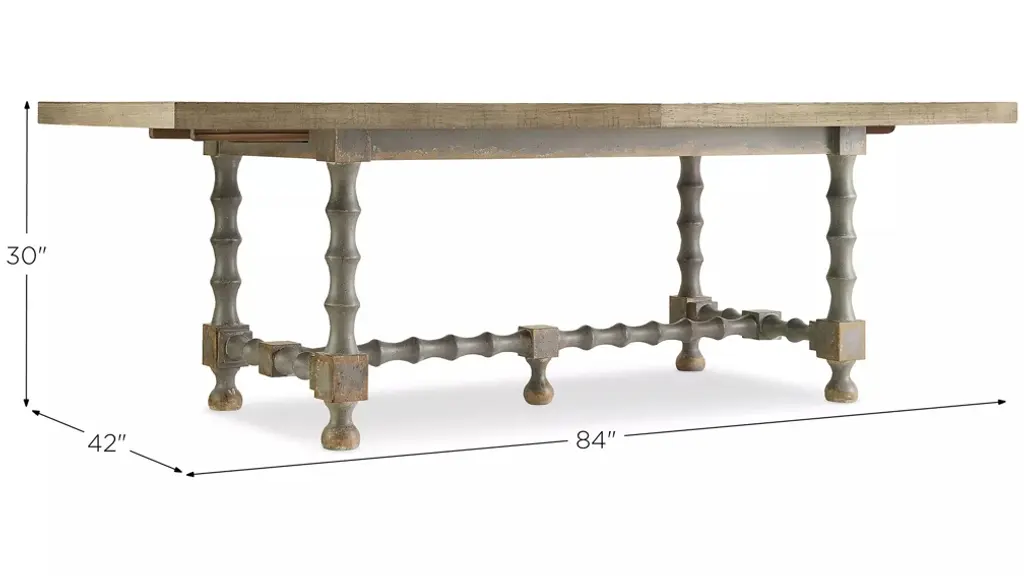 Be transported to a romantic, rustic Italian farmhouse as you dine around the Ciao Bella 84-inch Rectangular Trestle Dining Table. The base has turned legs and a Timeworn Gray finish with hand-chiseling and wire brushing, and contrasts with a natural-colored top. The two 18-inch leaves extend the table to 120 inches, accommodating up to 10 guests. Beautifully crafted of Poplar Hardwood Solids with Pine Veneers.