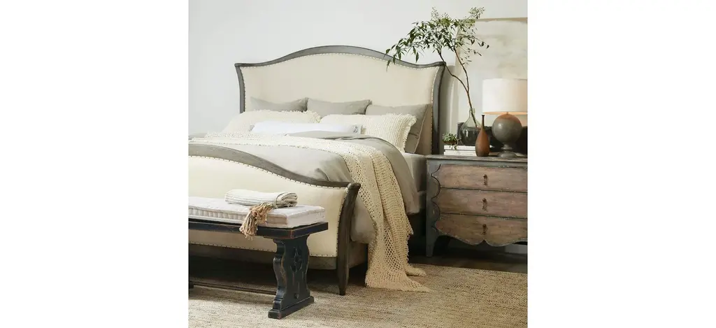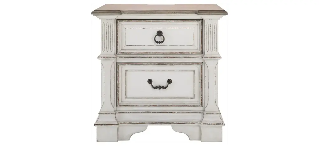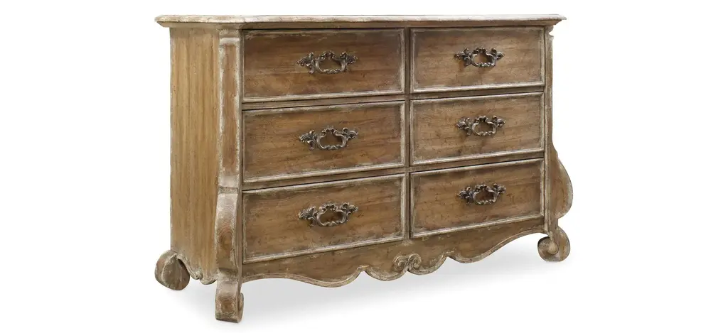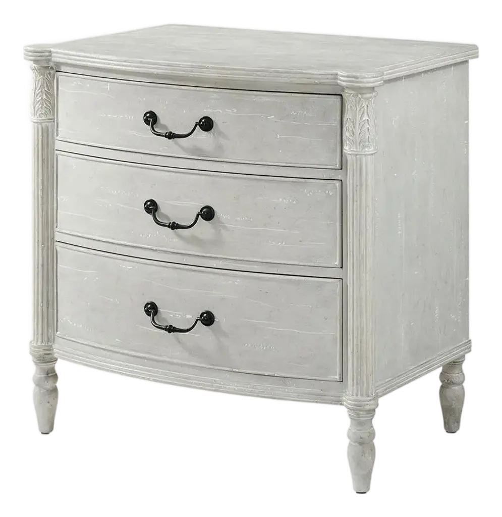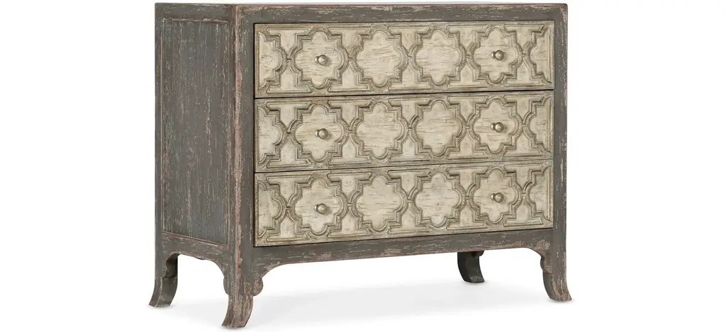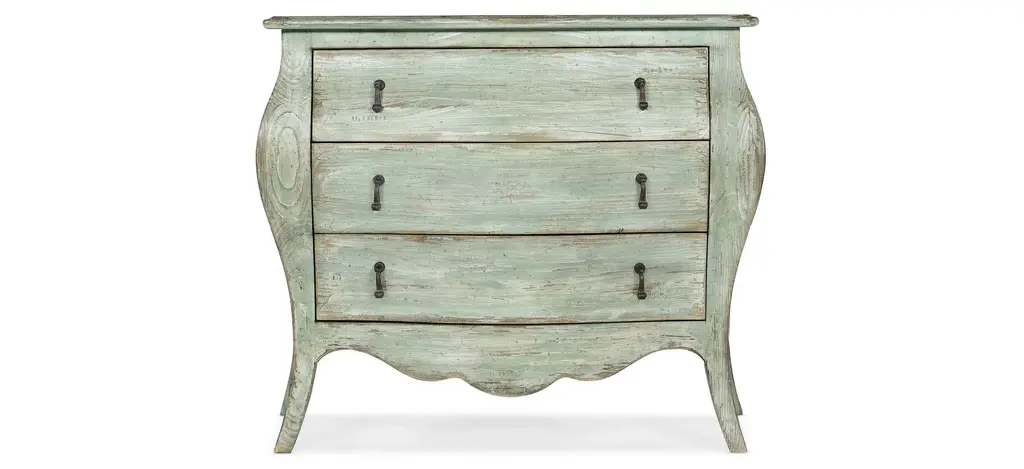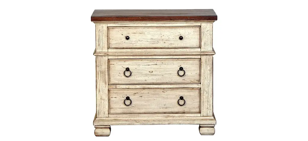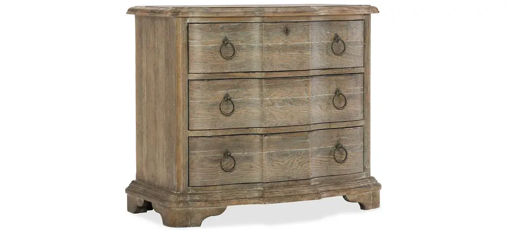 Romantic and rustic, the Ciao Bella Bachelors Chest is loaded with character, pairing the soft neutral Maple rub-off finish on the body with a Time Worn Grey accent finish on the scalloped outer edges and feet for a charming touch. The 3-drawer chest features a cedar-lined bottom drawer, 3-plug electrical outlet with USB port for charging electronics. Crafted of Poplar and Hardwood Solis with Maple Veneer.