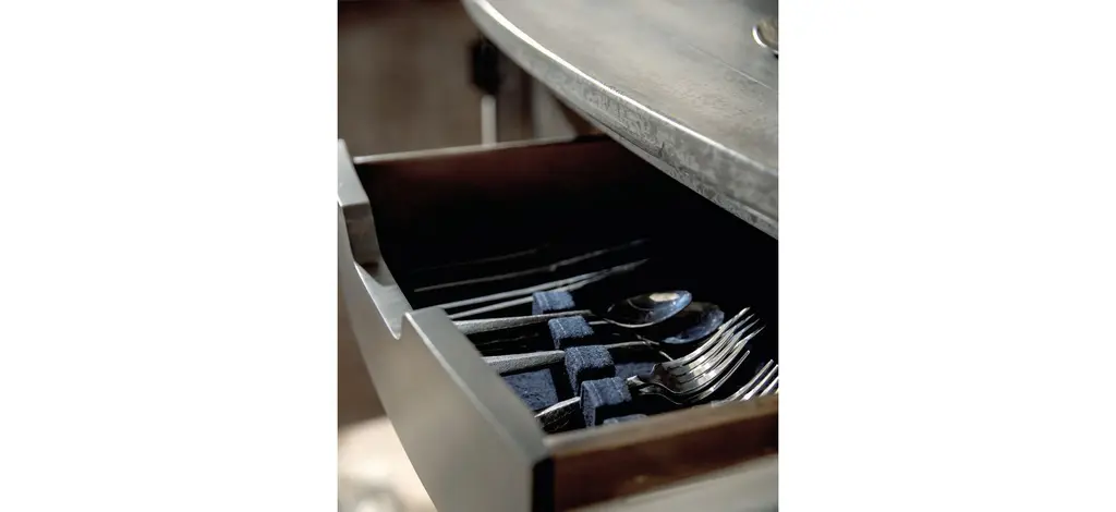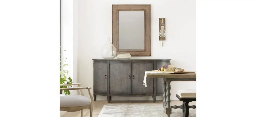 Inspired by European farmhouses, the graceful silhouette of the Ciao Bella Buffet will give a designer flair to any room. As a delightful bonus, this piece is packed with storage, with one adjustable shelf behind each pair of center doors, 2 fixed shelves behind the left and right doors, 2 drawers behind the center doors and drop-in felt liners with silverware storage. Crafted of Poplar and Hardwood Solids with Maple Veneers, the buffet features a character-filled Speckled Gray finish with hand chiseling and multi-layer rub-through. Tear-drop hardware adds a sparkle of style.
