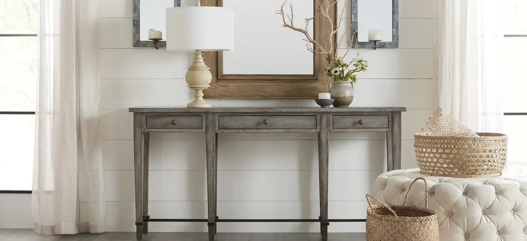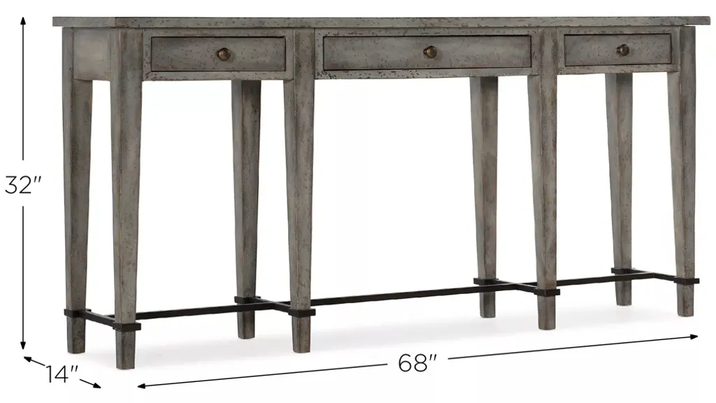 Make room for style in your tightest spaces with the 3-drawer Cia Bella narrow console in a speckled gray finish that looks like it has aged through generations. At only 14 inches deep and 68 inches wide, the console packs fashion and function into small spaces. The aged bronze metal stretcher makes this farmhouse-inspired piece fresh and updated for today's interiors.