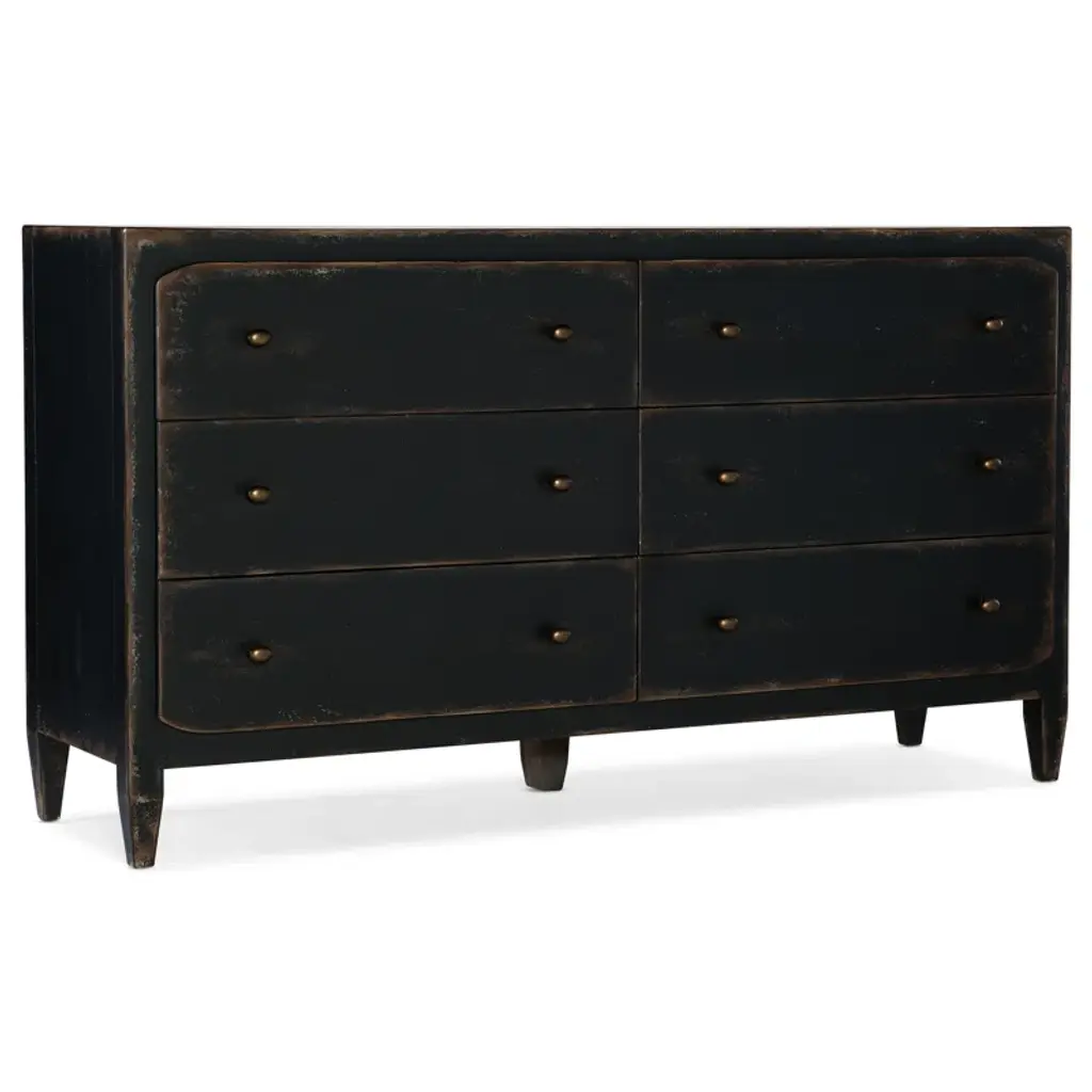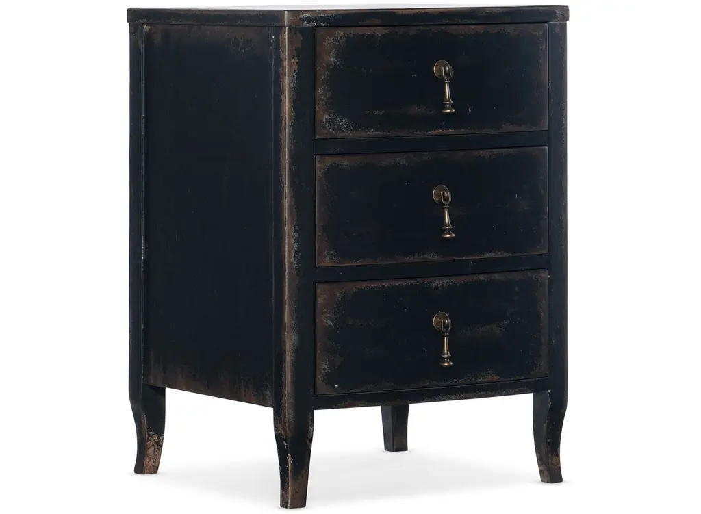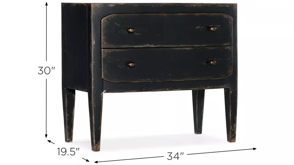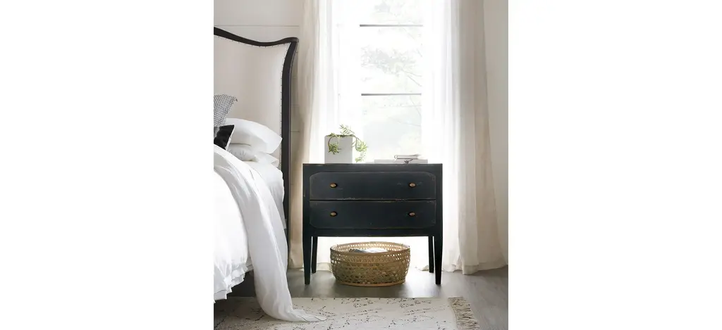 Rustic and romantic, the two-drawer Ciao Bella Nightstand will bring a European farmhouse ambience to your bedroom retreat. Crafted of Poplar and Hardwood Solids with Maple Veneer, the nightstand is finished an exquisite soft black finish that is layered and distressed to look like it is aged gracefully through the decades. Features include a drop-in felt liner in the top drawer, cedar-lined bottom drawer, a cord clip on the back and a 3-plug outlet with USB port for charging electronics.