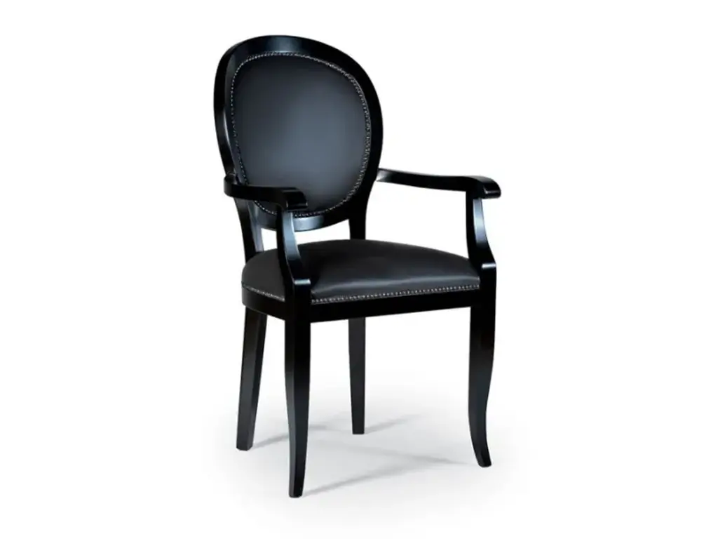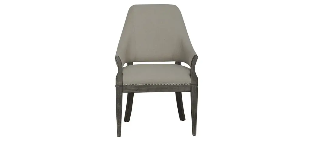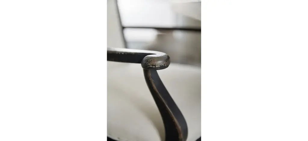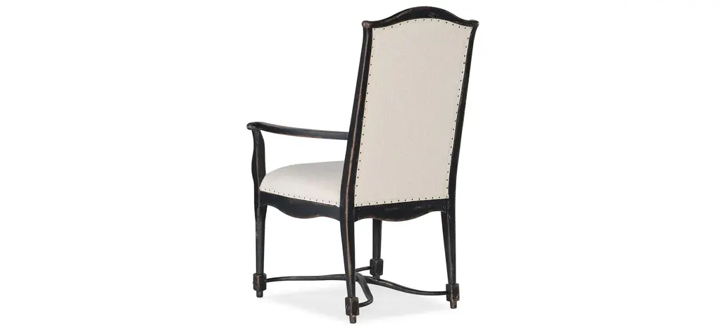 The delight is in the details of the Belgian-inspired Ciao Bella Upholstered Arm Chair. From the delicate, curved, intersecting stretcher base to the tiny tack-nail trim outlining the soft gray-white seat and back to the scalloped seat base, this versatile chair is timeless and inviting. The exquisite aged black complements the Tuscan gray-white fabric perfectly.