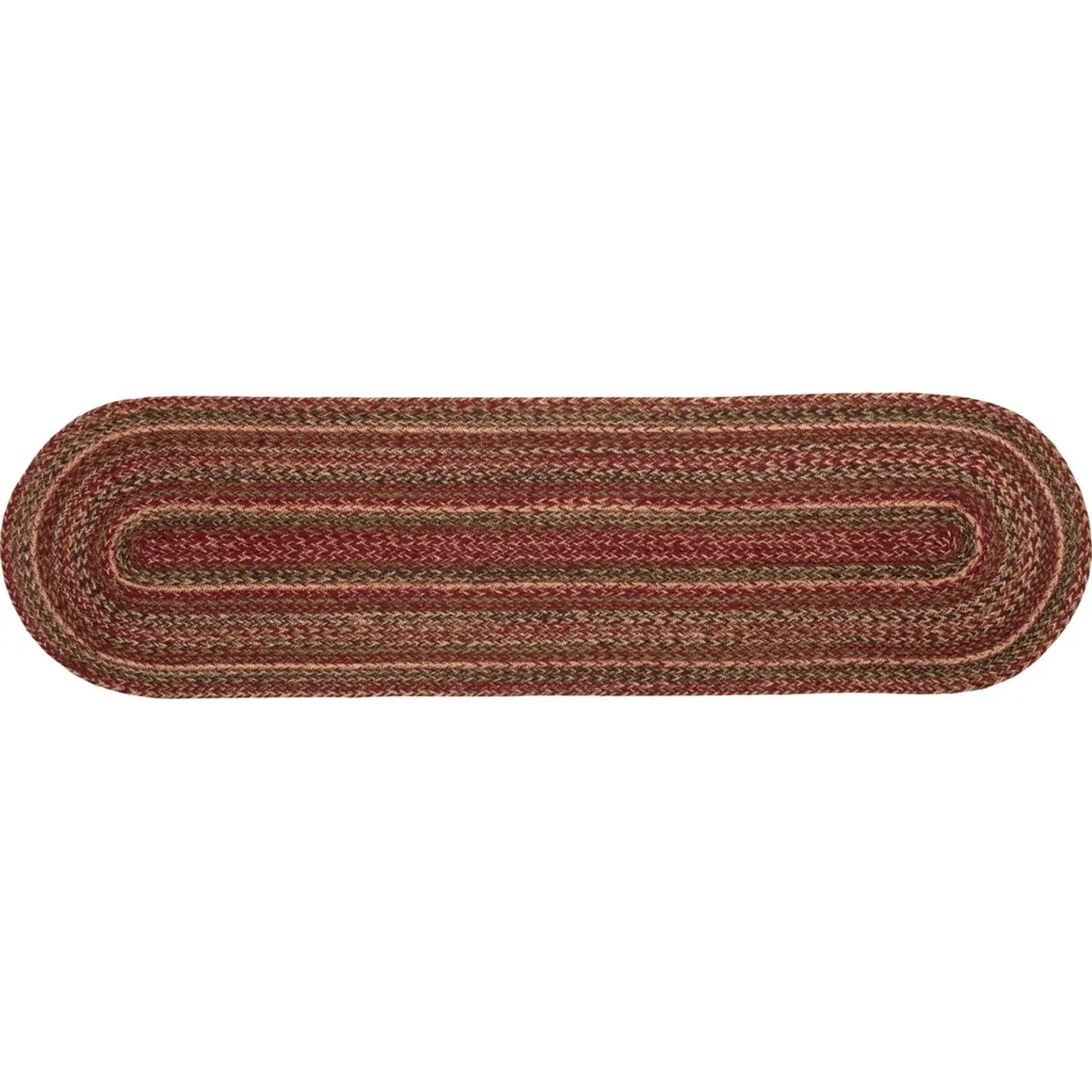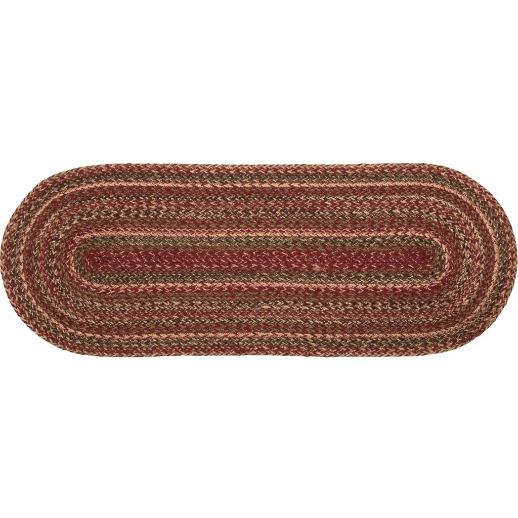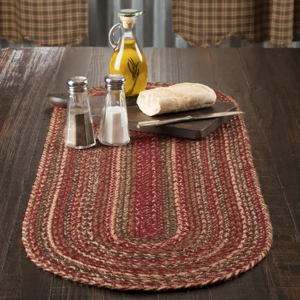 Enhance the look of your dining table with the Cider Mill Jute Runner. Featuring concentric, mixed braids of burgundy, tan, black, and olive green for a classic country, primitive look. Contains machine stitching that holds the braiding together even with increased wear and tear. Reverses to same as front.Features PREMIUM CONSTRUCTION: with over two decades experience crafting goods for American homes, our items are built to last for years to come.PRIMITIVE DECOR: traditional style that compliments any primitive or Americana home.QUALITY MATERIAL: made with durable 100% jute for a proper look and feel.BLENDED WARMTH: This braided table runner contains concentric, mixed braids of burgundy, natural, black, and olive greenDURABLE & STRONG: Machine stitching holds braiding together even with increased wear and tearREVERSIBLE: Reverses to the same as frontBRAIDED: Machine braided, Machine stitchedSpecifications Material: 100% JuteColors: Burgundy, Natural, Olive GreenManufacturer Country: IndiaCare: Spot CleanSizes Available 8" x 24" - 0.5 lb13" x 36" - 1 lb13" x 48" - 1.3 lb* To prevent colors from bleeding do not use chemicals or wet clean this item. A rug pad is recommended to keep your surfaces safe from color bleeding and abrasiveness of the jute fibers.