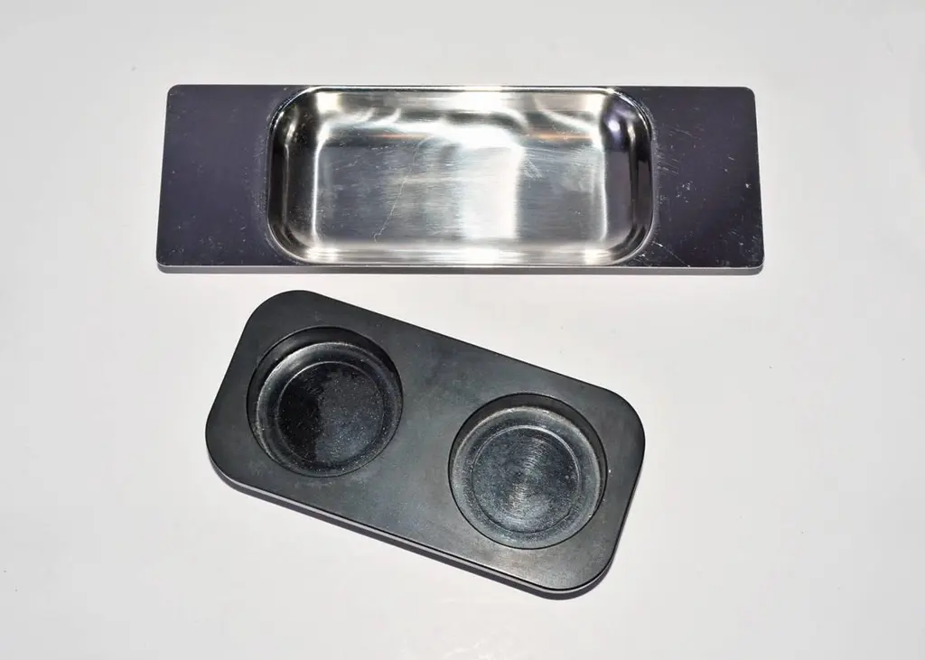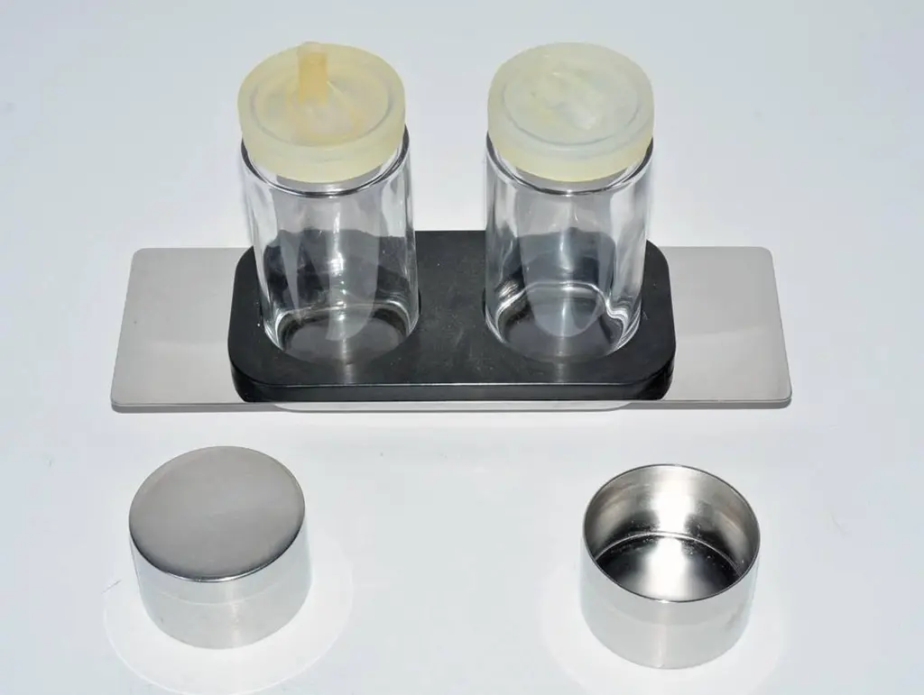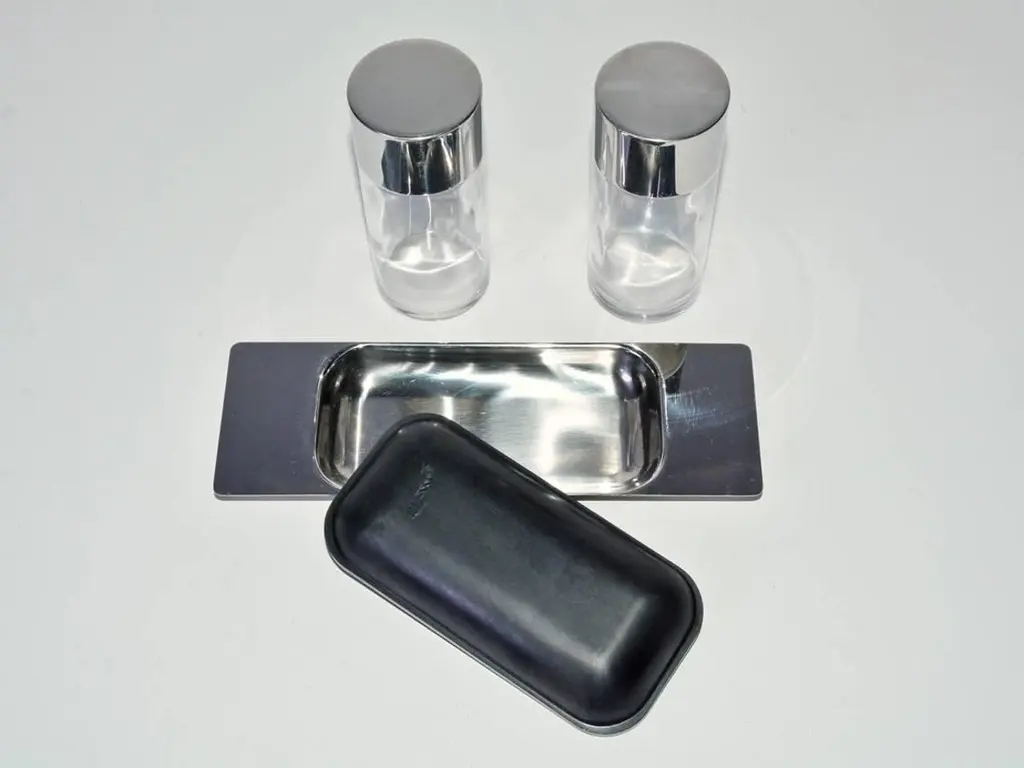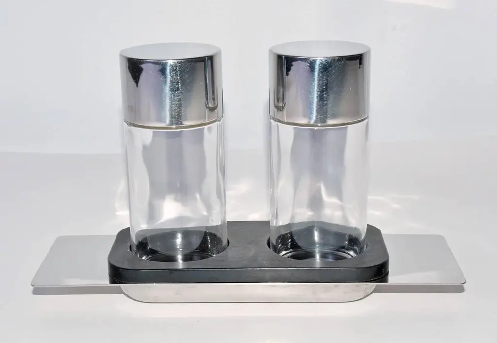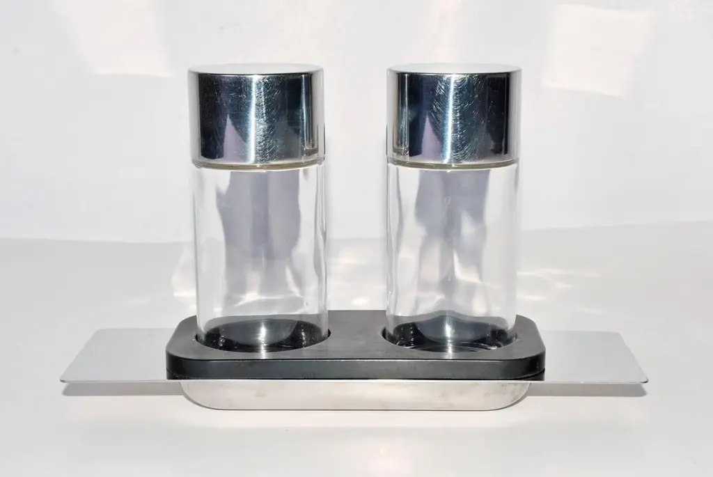 A masterfully designed modernist oil and vinegar cruet set of impeccable quality made of glass and polished metal by Cini & Nils, Italy, 1970s. 5.75" high. In great condition with some minor wear.Measures: Bottle, diameter 2", height 4.75".
