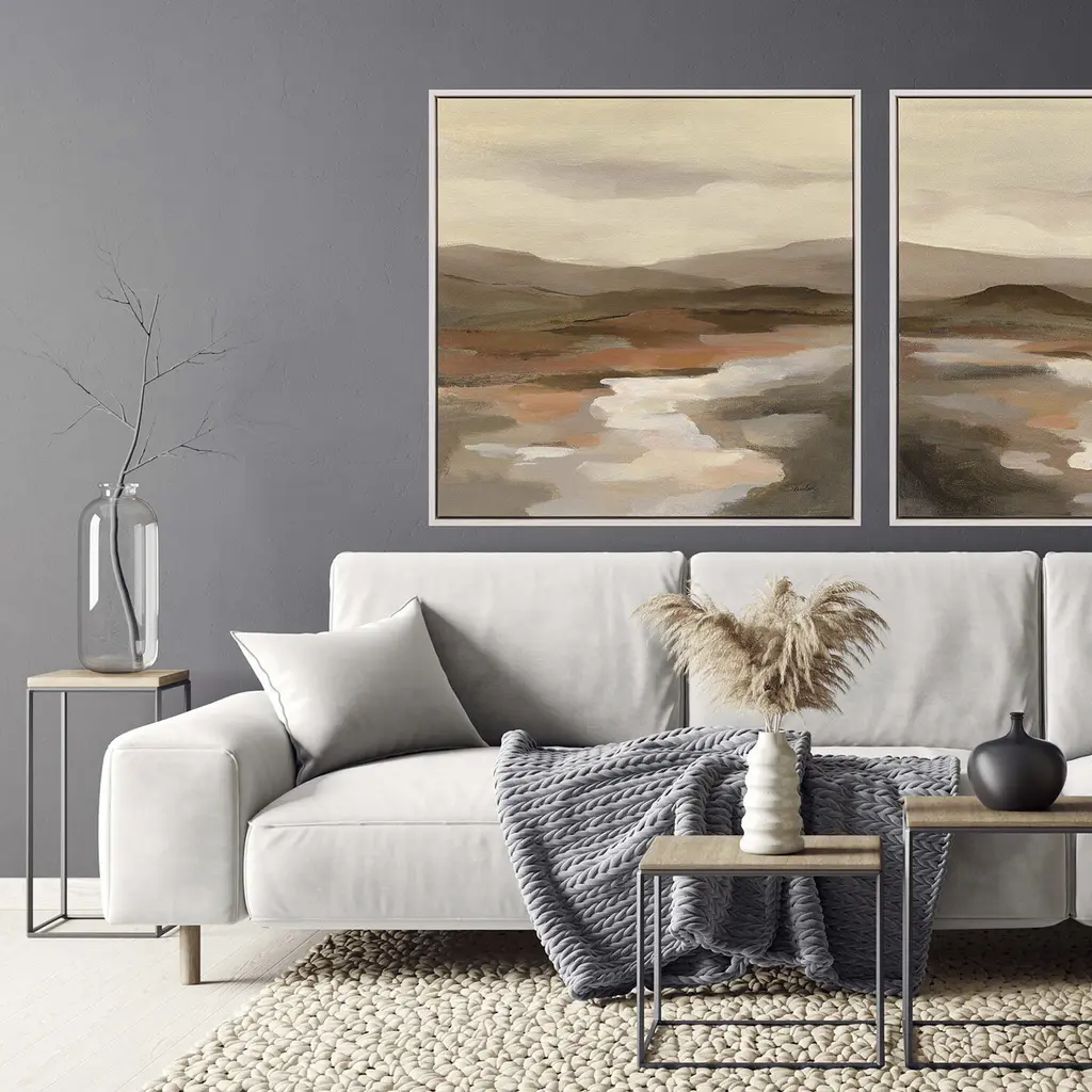 A russet landscape blends into the horizon. Canvas is mounted in a whitewash wood floater frame.