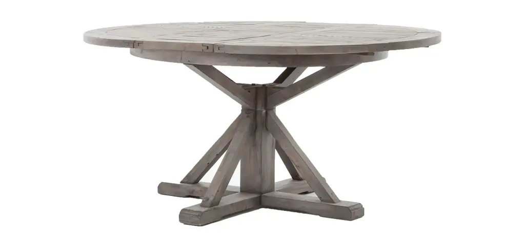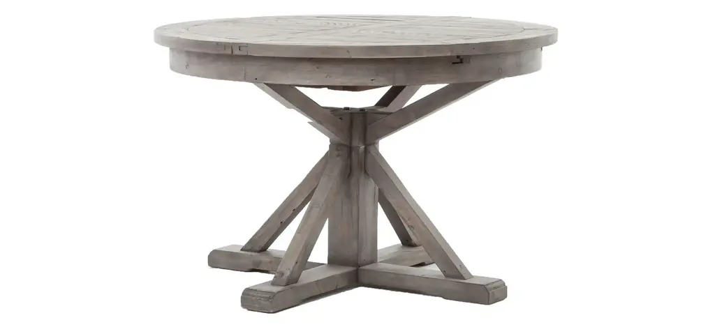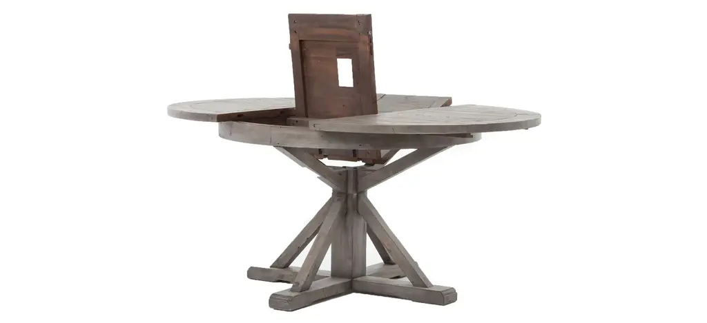 The Cintra dining table with leaf is a welcoming, round farmhouse table that draws the eye with a smooth top. A compelling architectural base is finished in black olive for a rustic look.