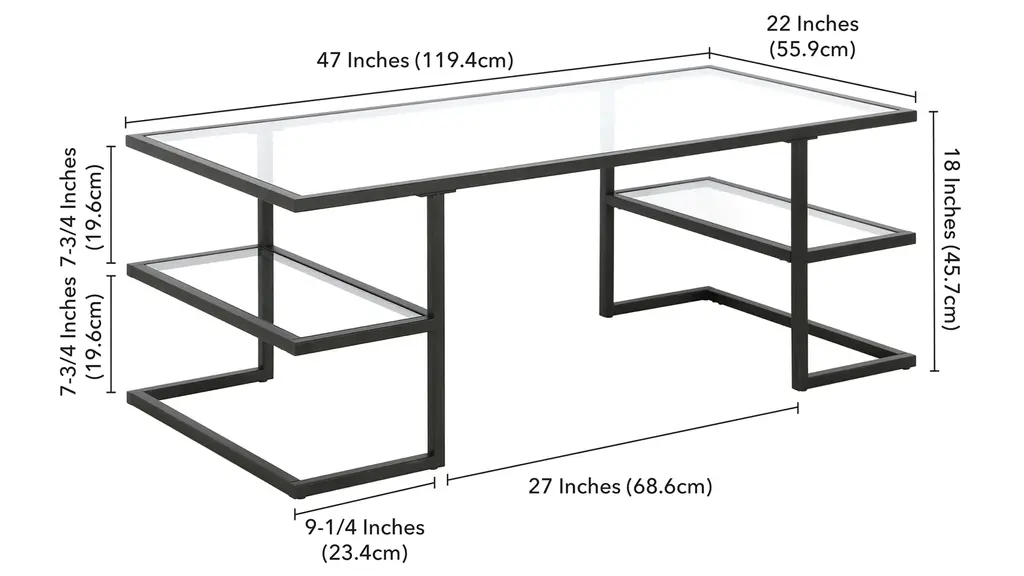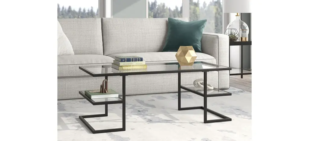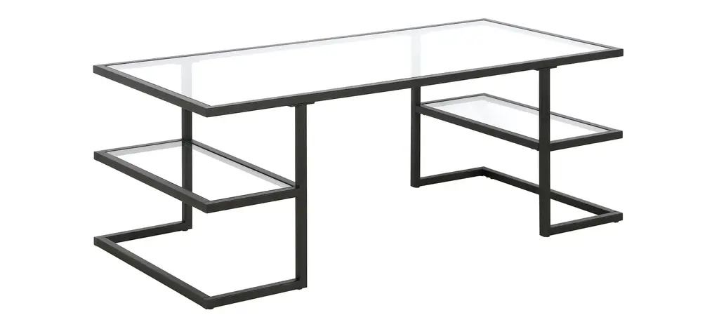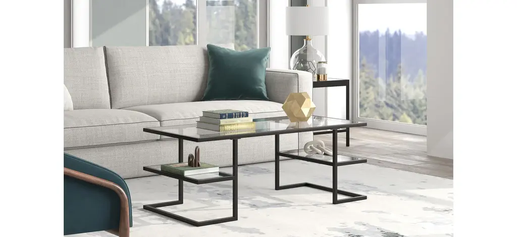 Form meets function in the design of the modern contemporary Circe Coffee Table. The two floating side shelves create extra storage possibilities, leaving plenty of open space beneath the tabletop to tuck away an ottoman or set of poufs. Crafted from durable steel and tempered glass, this table's geometric lines create an eye-catching centerpiece in your living space.