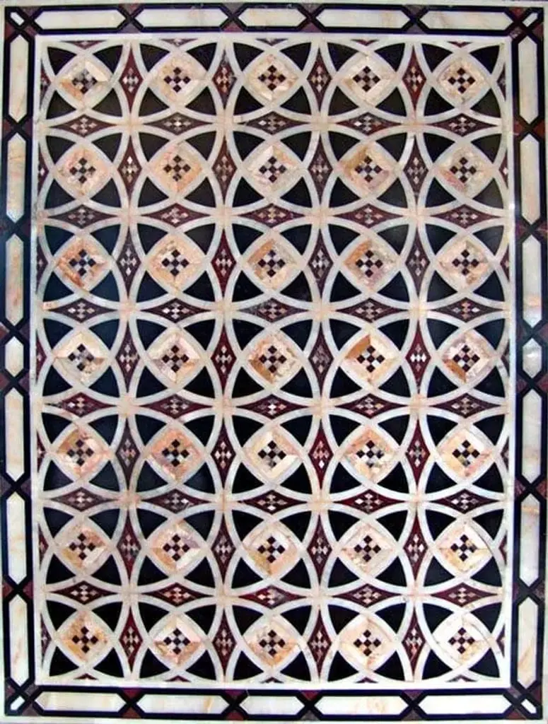 This petal mosaic in an arabesque design with overlapping circles makes an ideal flooring! with its repetitive pattern, we can see a geometrical form of flowers with 4 petals. This mosaic is handmade from marble stone and can be used indoors and outdoors