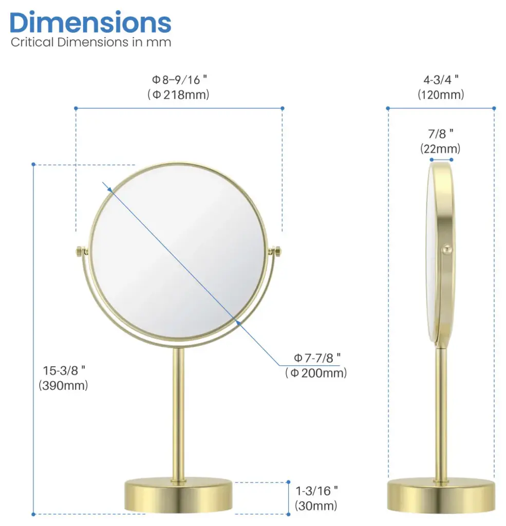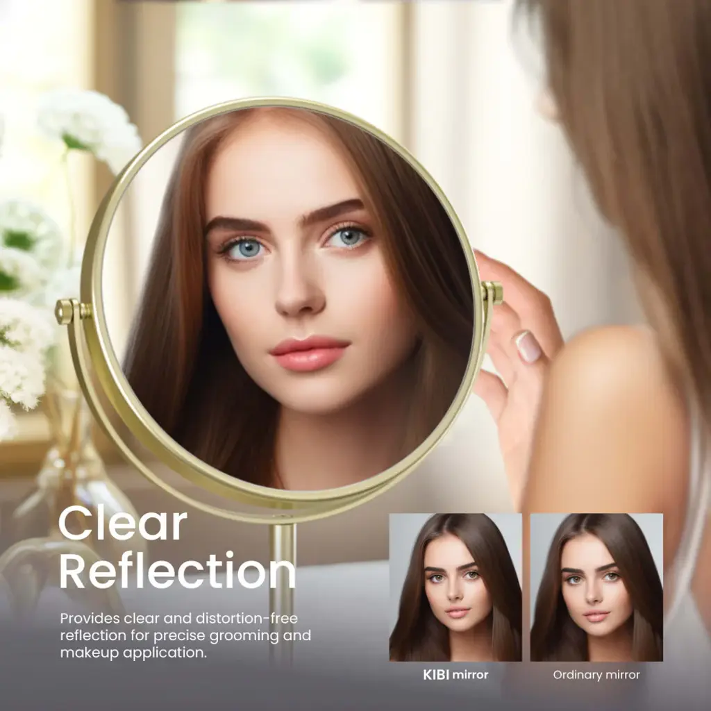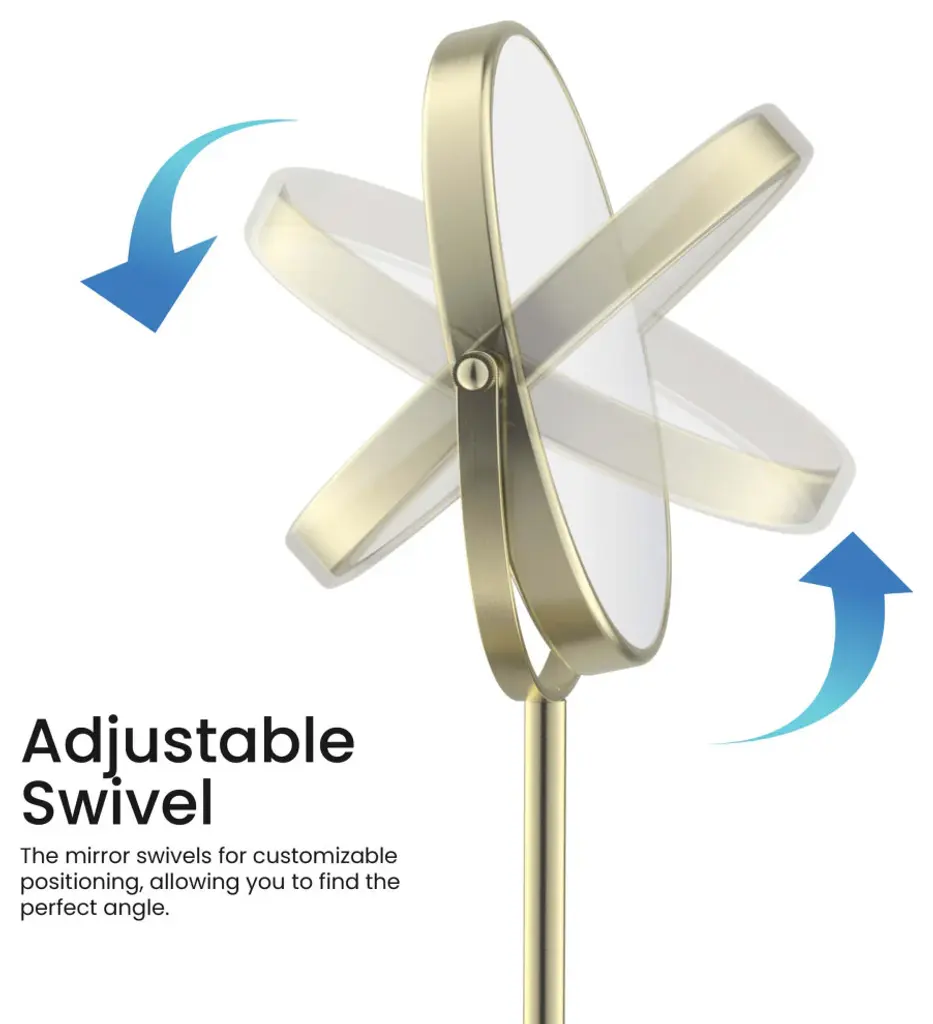 Crafted with high-quality materials, this free-standing makeup mirror combines functionality with elegance. Its sleek and modern design complements any vanity or dressing area, adding a touch of sophistication to your space. The dual magnification feature caters to both detailed work and overall makeup application, making it an essential tool for makeup enthusiasts and grooming aficionados alike. Dual Magnification: One side of the mirror offers a powerful 5 times magnification, allowing for intricate makeup application, precise eyebrow shaping, and detailed skincare routines. The other side provides a clear, regular reflection for overall makeup balance, foundation application, and grooming tasks. 360-Degree Swivel Design: The mirror features a 360-degree swivel design, allowing for easy adjustment of the viewing angle. This feature ensures that you can find the perfect position and angle for your makeup application, providing maximum comfort and convenience. Stable Free-Standing Design: Designed with a sturdy and stable base, this mirror can stand securely on any flat surface, eliminating the need for wall or countertop mounting. Quality Craftsmanship: Crafted from high-quality materials, this mirror is durable and built to last, ensuring that it remains a reliable tool in your beauty arsenal for years to come. Sleek and Modern Appearance: With a clean and contemporary design, this mirror complements any decor, adding a touch of sophistication to your vanity, dressing area, or bathroom. Portable and Travel-Friendly: this mirror is highly portable and travel-friendly. Take it with you wherever you go, ensuring you have a magnified mirror for your beauty needs, even when you''re on the move.