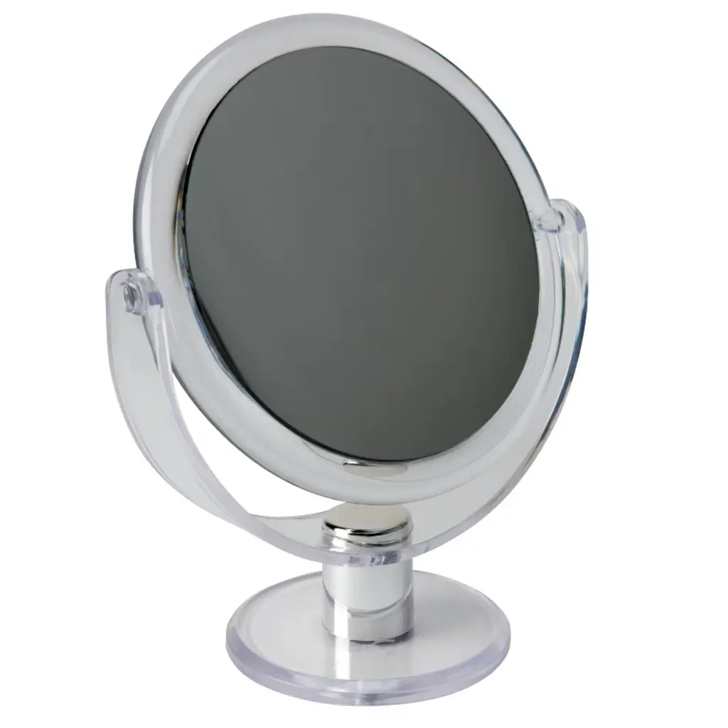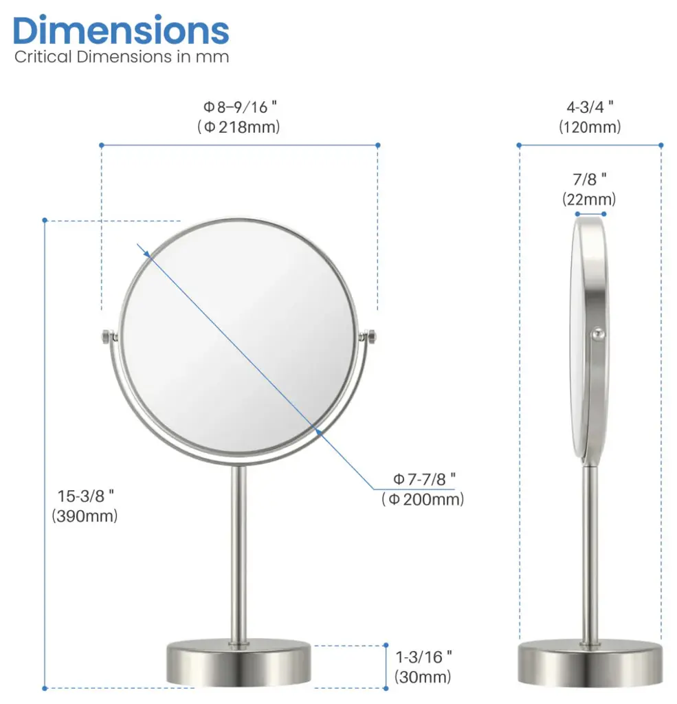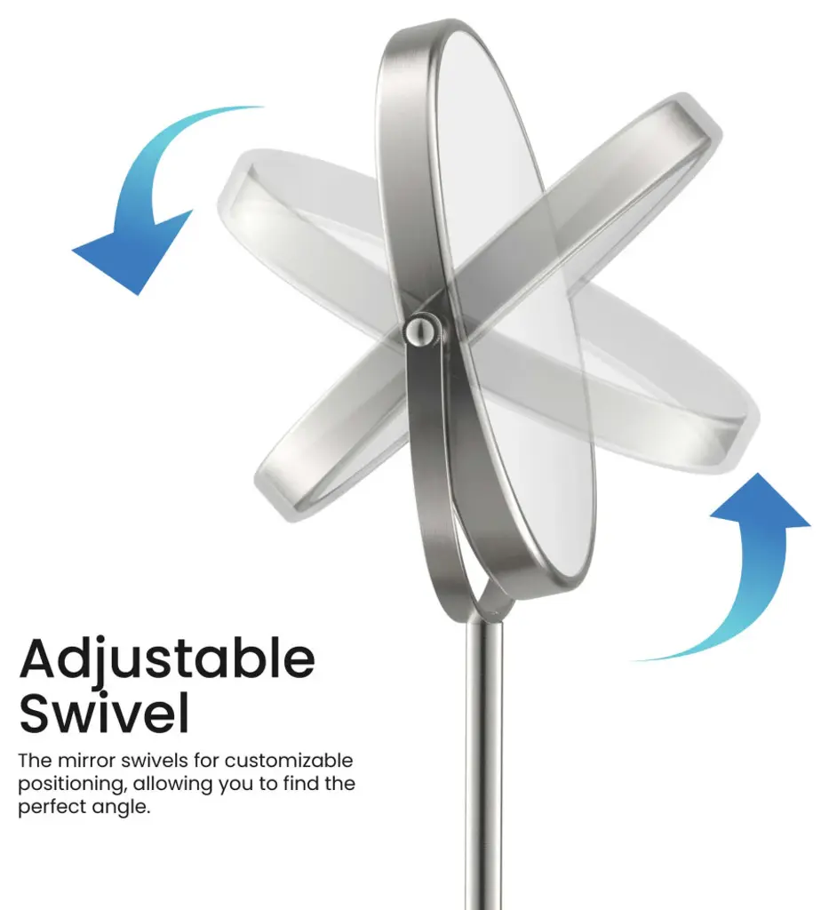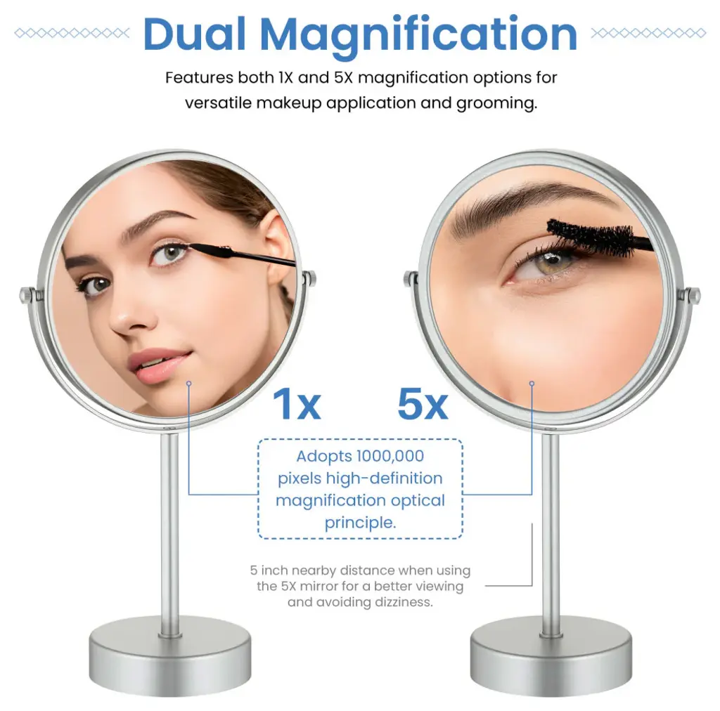 Crafted with high-quality materials, this free-standing makeup mirror combines functionality with elegance. Its sleek and modern design complements any vanity or dressing area, adding a touch of sophistication to your space. The dual magnification feature caters to both detailed work and overall makeup application, making it an essential tool for makeup enthusiasts and grooming aficionados alike. Dual Magnification: One side of the mirror offers a powerful 5 times magnification, allowing for intricate makeup application, precise eyebrow shaping, and detailed skincare routines. The other side provides a clear, regular reflection for overall makeup balance, foundation application, and grooming tasks. 360-Degree Swivel Design: The mirror features a 360-degree swivel design, allowing for easy adjustment of the viewing angle. This feature ensures that you can find the perfect position and angle for your makeup application, providing maximum comfort and convenience. Stable Free-Standing Design: Designed with a sturdy and stable base, this mirror can stand securely on any flat surface, eliminating the need for wall or countertop mounting. Quality Craftsmanship: Crafted from high-quality materials, this mirror is durable and built to last, ensuring that it remains a reliable tool in your beauty arsenal for years to come. Sleek and Modern Appearance: With a clean and contemporary design, this mirror complements any decor, adding a touch of sophistication to your vanity, dressing area, or bathroom. Portable and Travel-Friendly: this mirror is highly portable and travel-friendly. Take it with you wherever you go, ensuring you have a magnified mirror for your beauty needs, even when you''re on the move.
