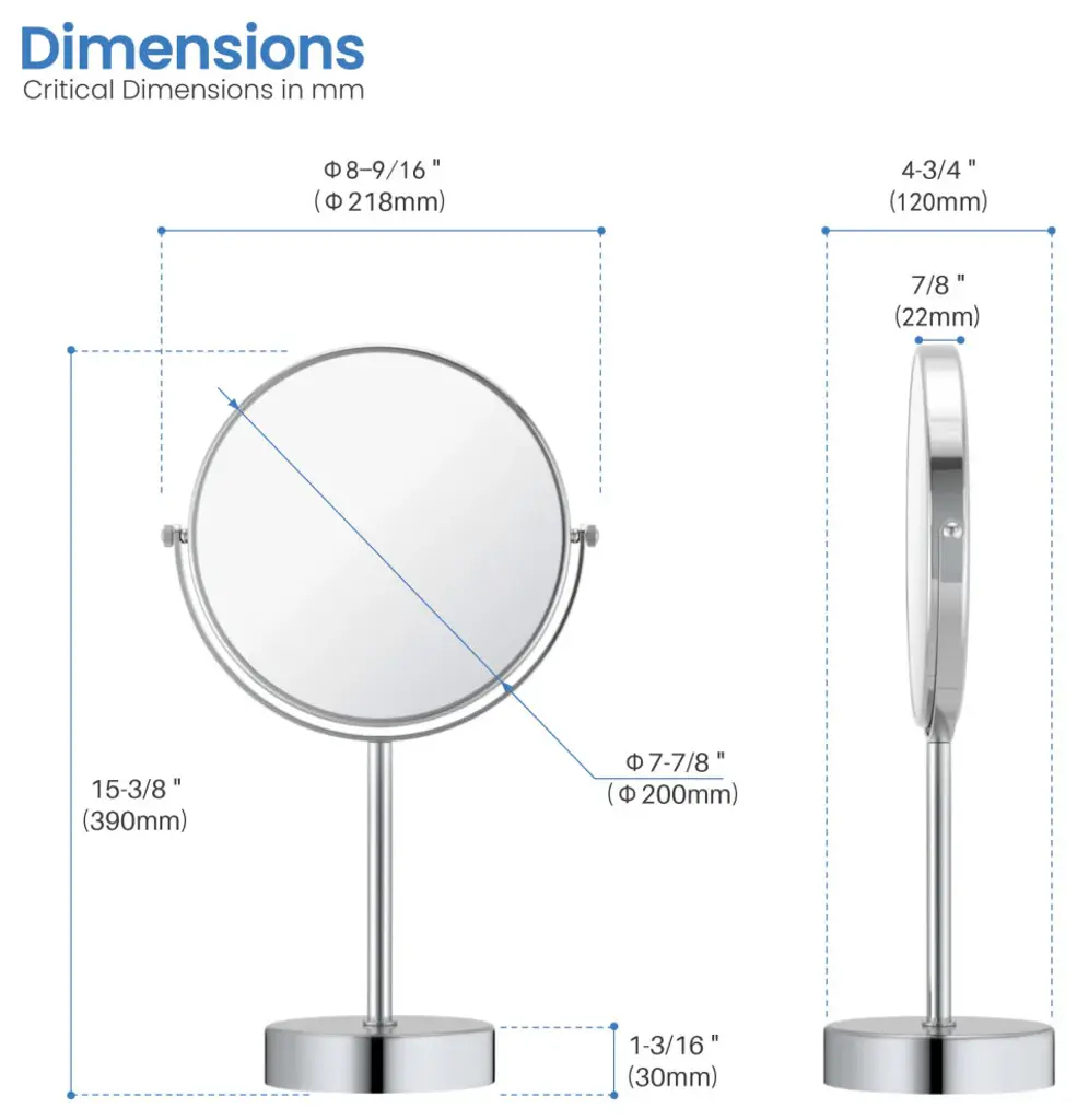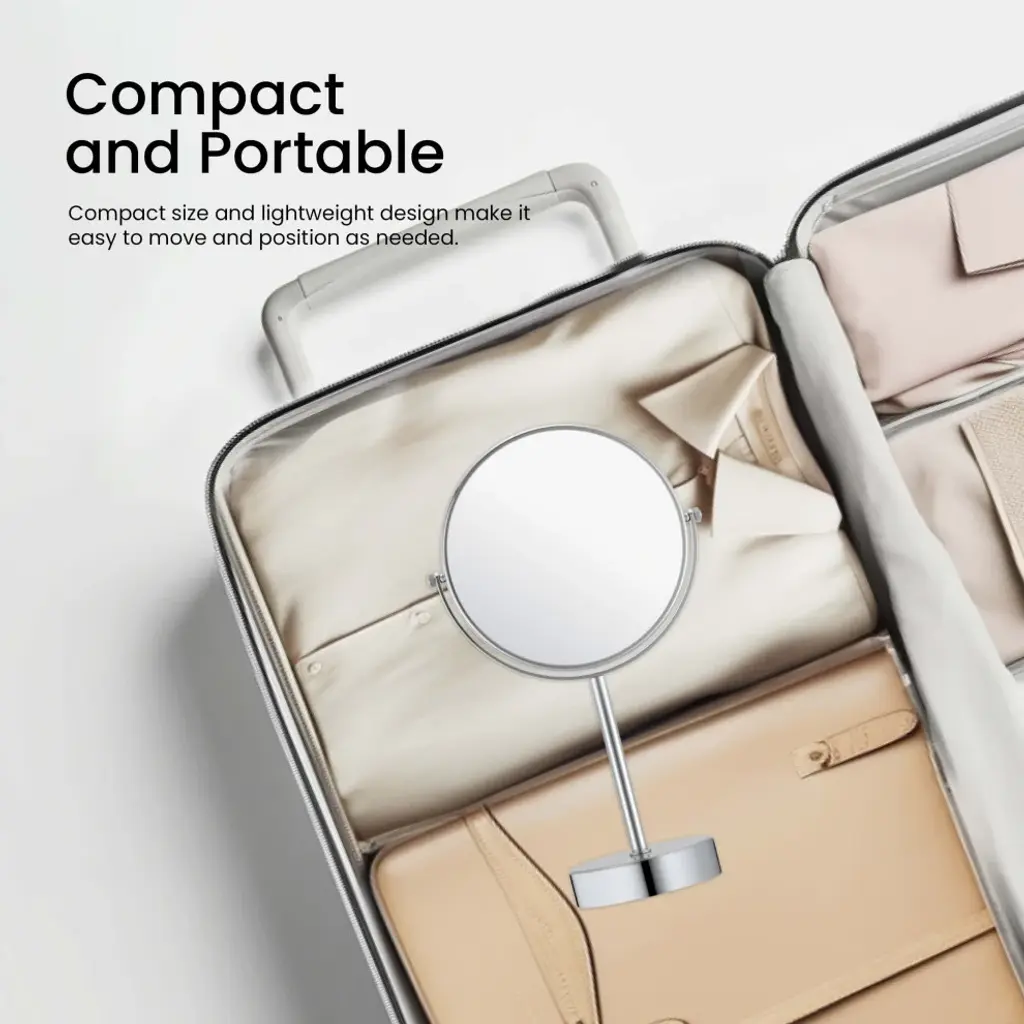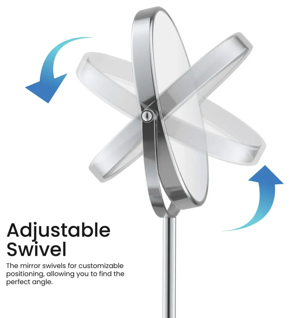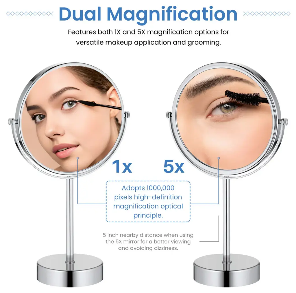 Crafted with high-quality materials, this free-standing makeup mirror combines functionality with elegance. Its sleek and modern design complements any vanity or dressing area, adding a touch of sophistication to your space. The dual magnification feature caters to both detailed work and overall makeup application, making it an essential tool for makeup enthusiasts and grooming aficionados alike. Dual Magnification: One side of the mirror offers a powerful 5 times magnification, allowing for intricate makeup application, precise eyebrow shaping, and detailed skincare routines. The other side provides a clear, regular reflection for overall makeup balance, foundation application, and grooming tasks. 360-Degree Swivel Design: The mirror features a 360-degree swivel design, allowing for easy adjustment of the viewing angle. This feature ensures that you can find the perfect position and angle for your makeup application, providing maximum comfort and convenience. Stable Free-Standing Design: Designed with a sturdy and stable base, this mirror can stand securely on any flat surface, eliminating the need for wall or countertop mounting. Quality Craftsmanship: Crafted from high-quality materials, this mirror is durable and built to last, ensuring that it remains a reliable tool in your beauty arsenal for years to come. Sleek and Modern Appearance: With a clean and contemporary design, this mirror complements any decor, adding a touch of sophistication to your vanity, dressing area, or bathroom. Portable and Travel-Friendly: this mirror is highly portable and travel-friendly. Take it with you wherever you go, ensuring you have a magnified mirror for your beauty needs, even when you''re on the move.