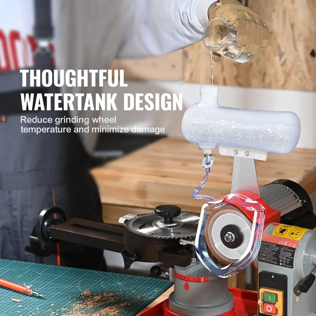 Sharper Blades, Smoother Cuts: Say goodbye to dull blades! Our 370W powerful water injection circular saw blade sharpener, running at 3600RPM high speed, efficiently sharpens your saw blades to their former sharpness, leaving them razor-sharp, resilient, and burr-free. Easy Adjustment for Precision Sharpening: Our rotary angle mill grinder's grinding wheel can be effortlessly adjusted up and down by 20°. You can also turn the handle 30° from the left, and 45° from the right, ensuring that the circular saw blade remains level for precise sharpening. Versatile & Ready for Demands: With 6 different-sized saw centerings, our saw blade sharpener machine can effortlessly tackle φ3.15" to φ27.5" circular saw blades. Whether for unconventional saw blades, dense or loose teeth, left and right teeth with scraper, or saw blade with scraper, it is up to the task. Stay Cool and Sharpen Strongly: Our rotary angle mill grinding sharpening machine incorporates an upgraded cooling system with a water tank, keeping the grinding wheel cool during operation, preventing damage from high temperatures, and enhancing the toughness of your blades. Practical & Humanized Designs: Quality in the details! Our carbide blade sharpener is optimized with numerous thoughtful designs: Clear and precise aluminum scale marks, a waterproof switch for safety and longevity, and cast iron base with a rubber pad that enhances stability and minimizes vibrations. Package Content 6 x Saw Centerings (φ1.6mm, φ2.0mm, φ2.2mm, φ2.5mm, φ3.0m, φ4.0mm) 1 x Screwdriver 1 x Wrench 13 and 15 3 x Hex Wrench