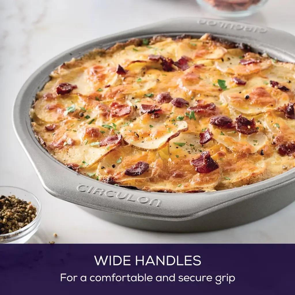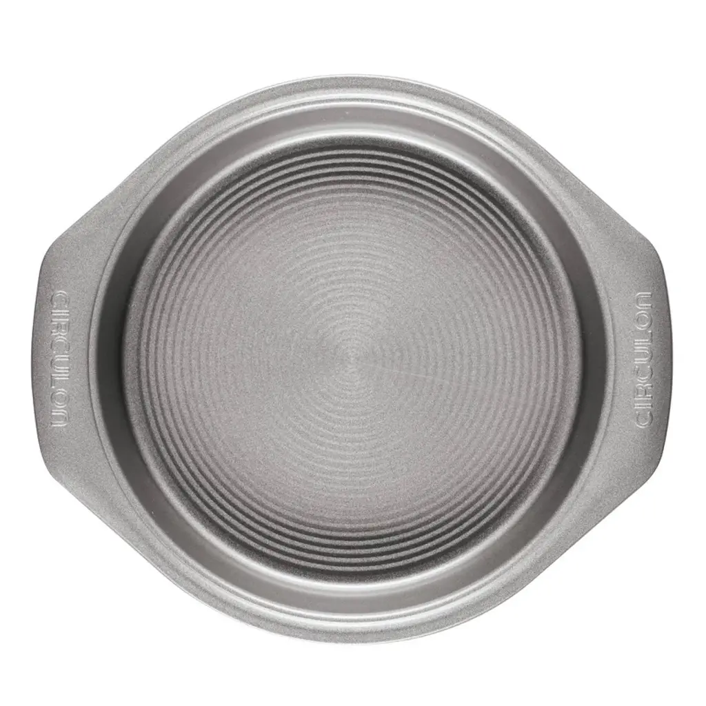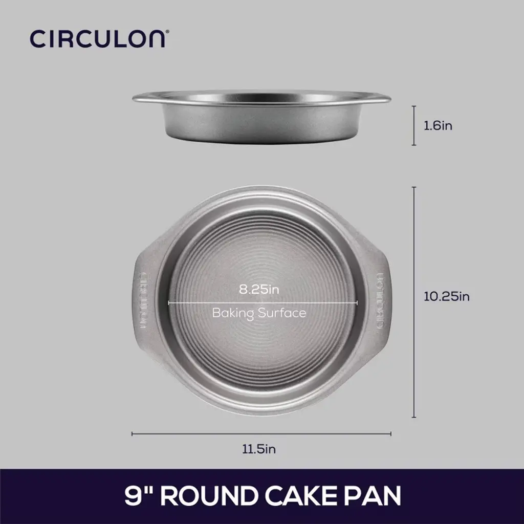 Depend on nonstick bakeware designed to deliver baked goodness with the sturdy, reliable Circulon Nonstick Bakeware 9-Inch Round Cake Pan.Superior nonstick technology and solution-driven design set Circulon bakeware apart from other nonstick bakeware. The technology begins with raised circles on the cake pan surface that boast premium nonstick. The rolled-rim design includes distinctive chocolate brown color inside and out, and wide handles for plenty of grip, even with bulky oven mitts. Oven safe to 450°F, this bakeware brings the Circulon kitchen-time-and-energy-saving approach to baking home. And with a Hassle-Free Lifetime Guarantee, the cake pan truly delivers for the well-rounded life.Take the cake pan, one designed for delicious, dependable nonstick baking every time, with the efficient, stylish Circulon Nonstick Bakeware 9-Inch Round Cake Pan.