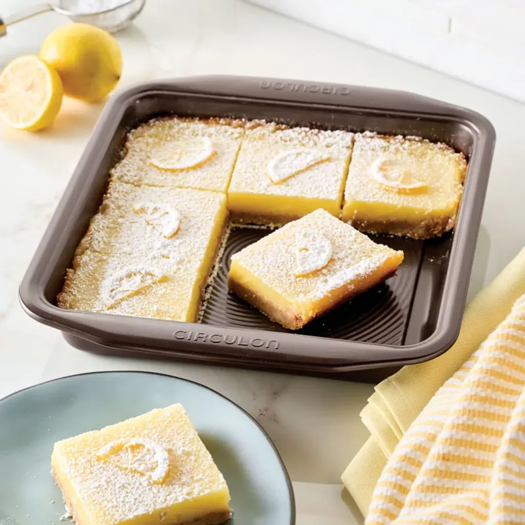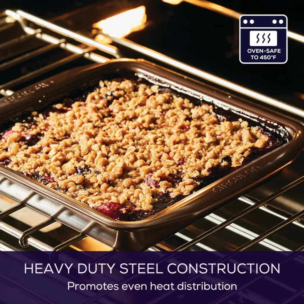 From lemon bars to lasagnas, depend on the superior nonstick technology and durable construction of this versatile rectangular cake pan. Raised circles on the pan surface provide a boost to premium nonstick for effortless food release and easy cleanup. Rolled-rims for enhanced durability and wide handles for plenty of grips, even with bulky oven mitts on. The oven is safe to 450°F.