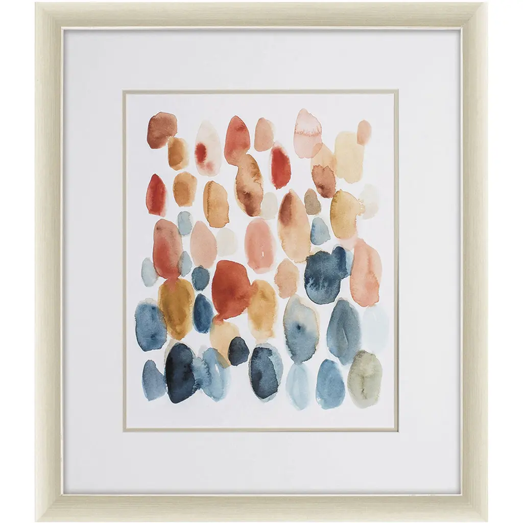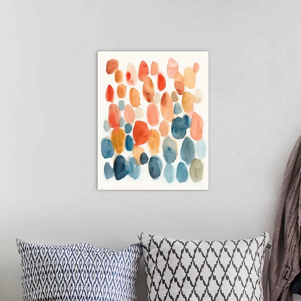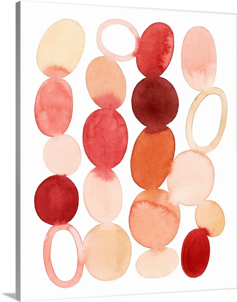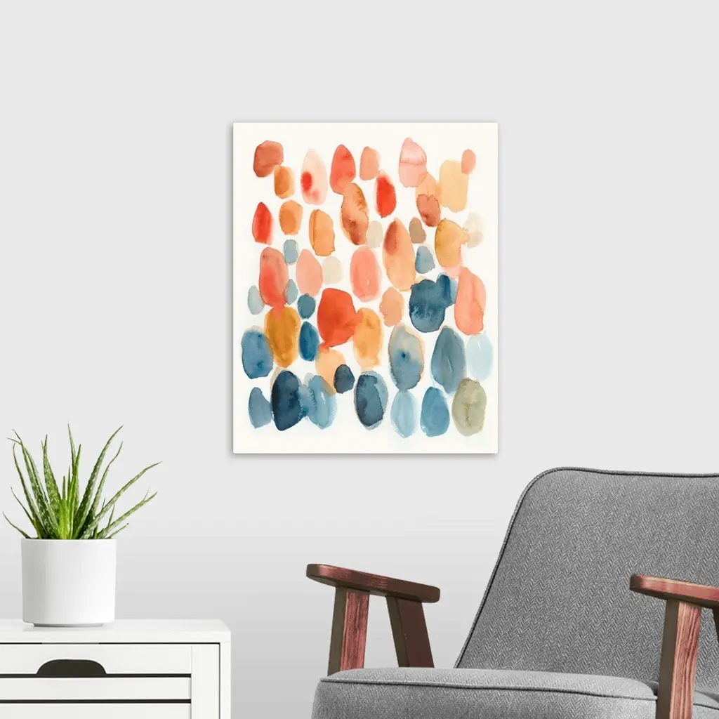 Watercolor abstract with oblong shapes in indigo, coral, and orange colors on a white background.