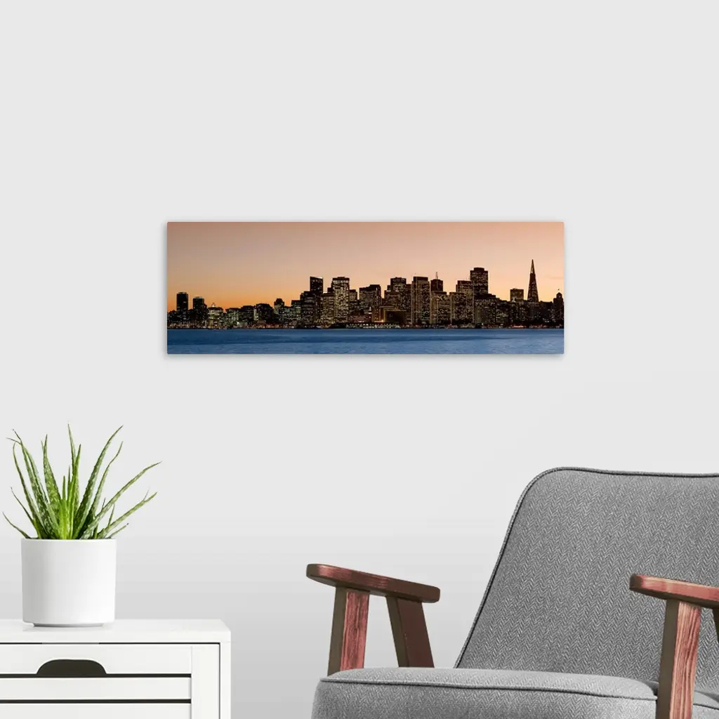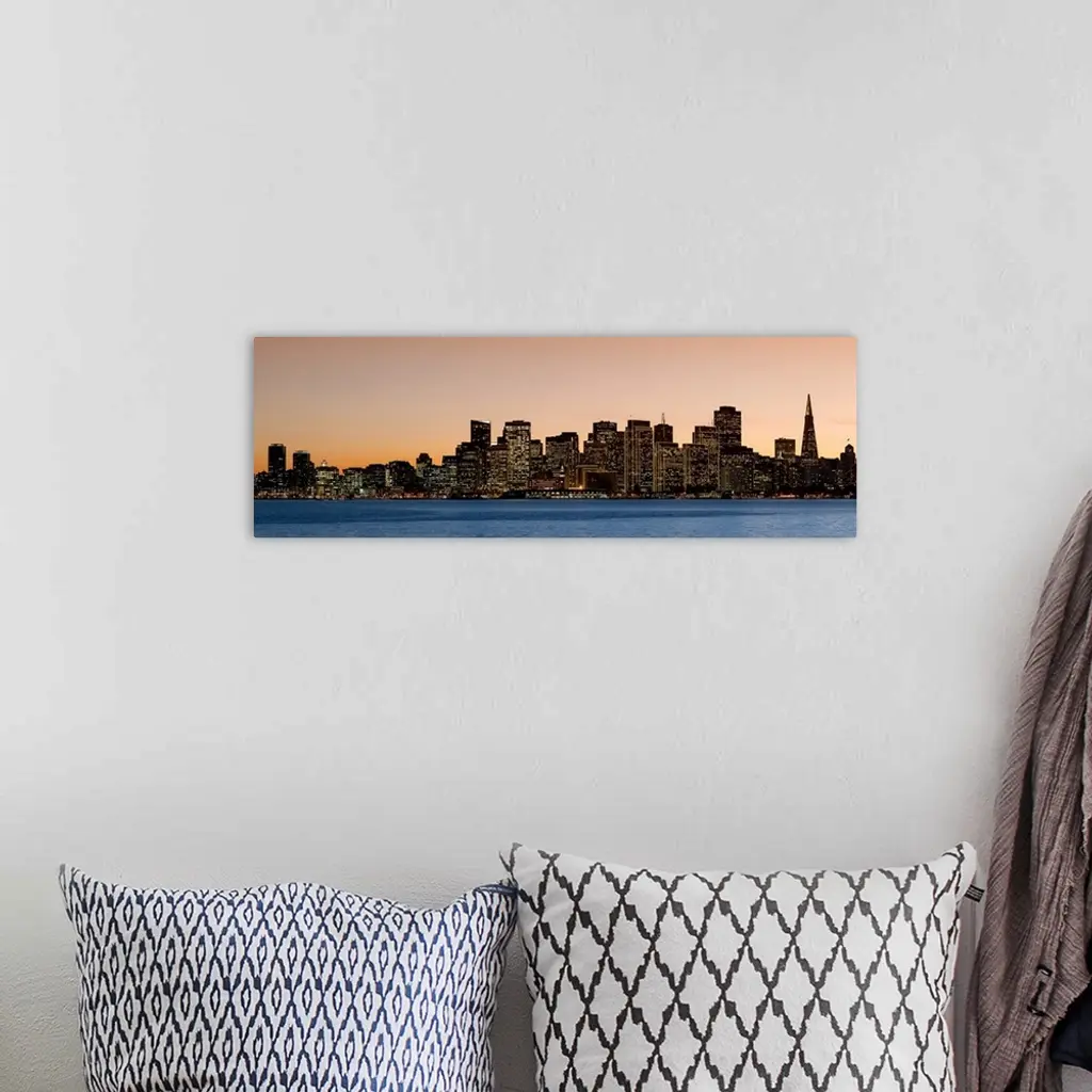 Horizontal image on canvas of the San Francisco skyline lit up at sunset by the water.