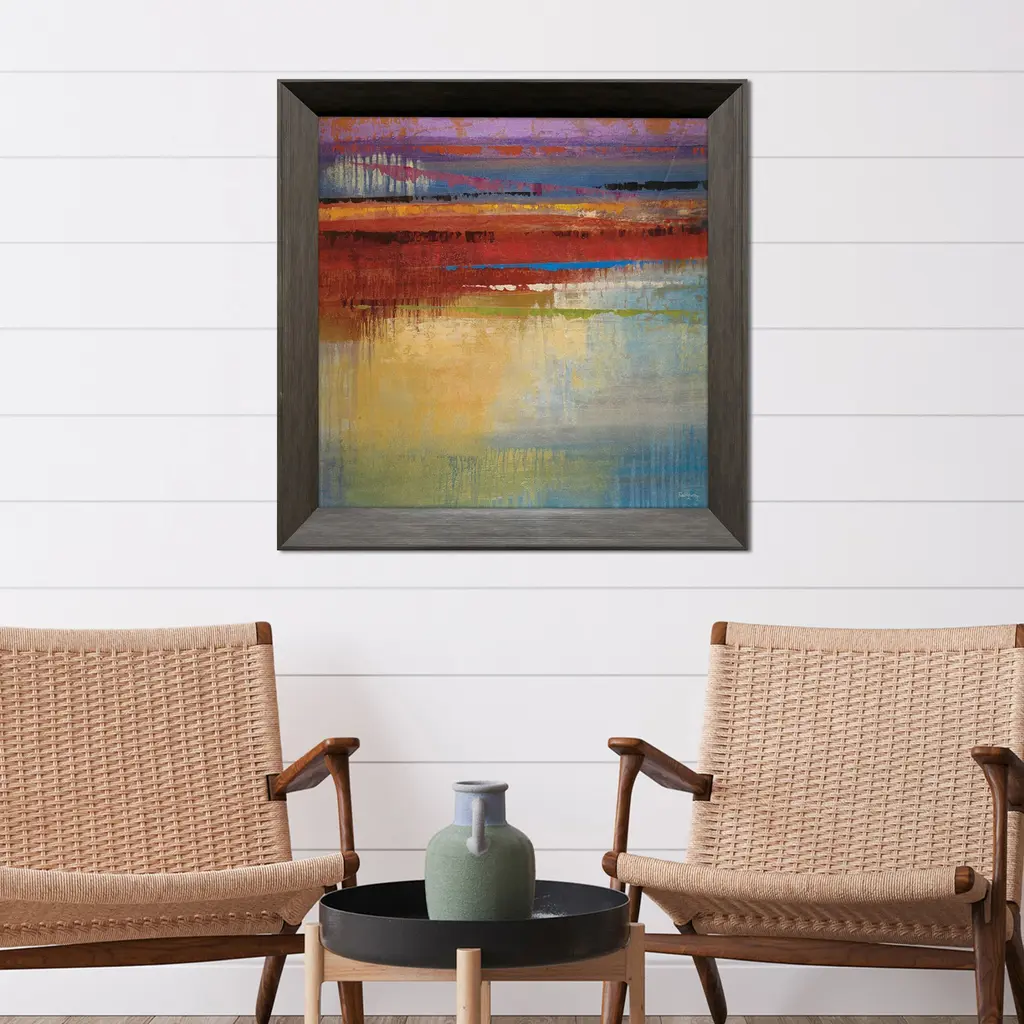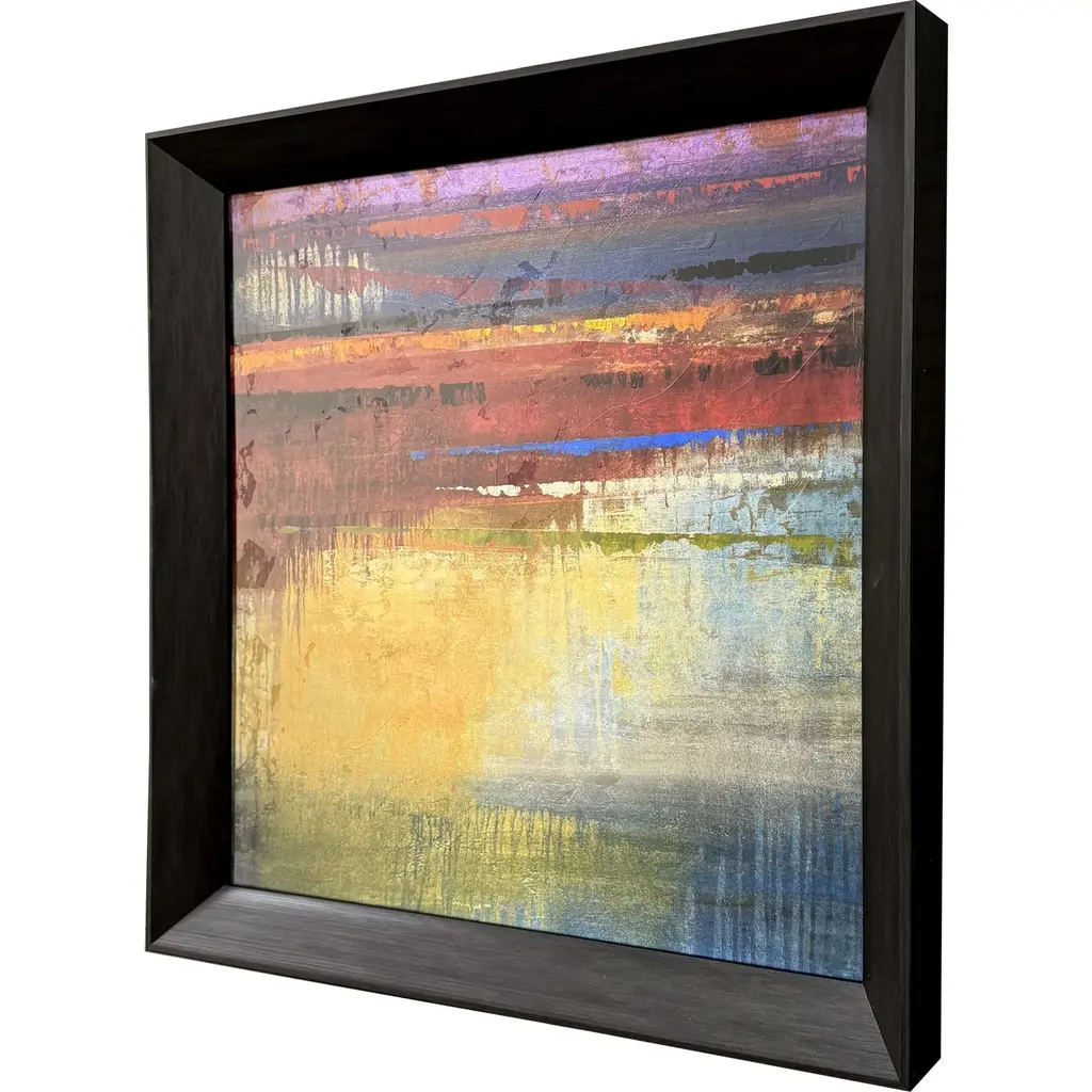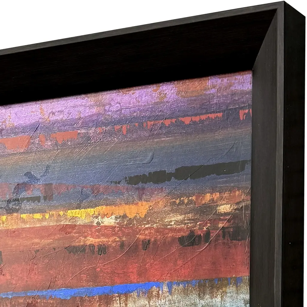 Bold color strokes create an arresting abstract. Featuring a hand applied enhanced gel finish and framed in an angled dark wood finish moulding.