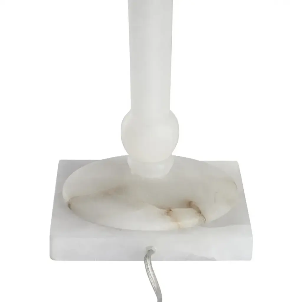 This tall, statuesque lamp is crafted from luminous alabaster, showcasing natural veining that adds depth and elegance. Its sculptural presence and soft, diffused glow create a timeless and serene ambiance in any space.